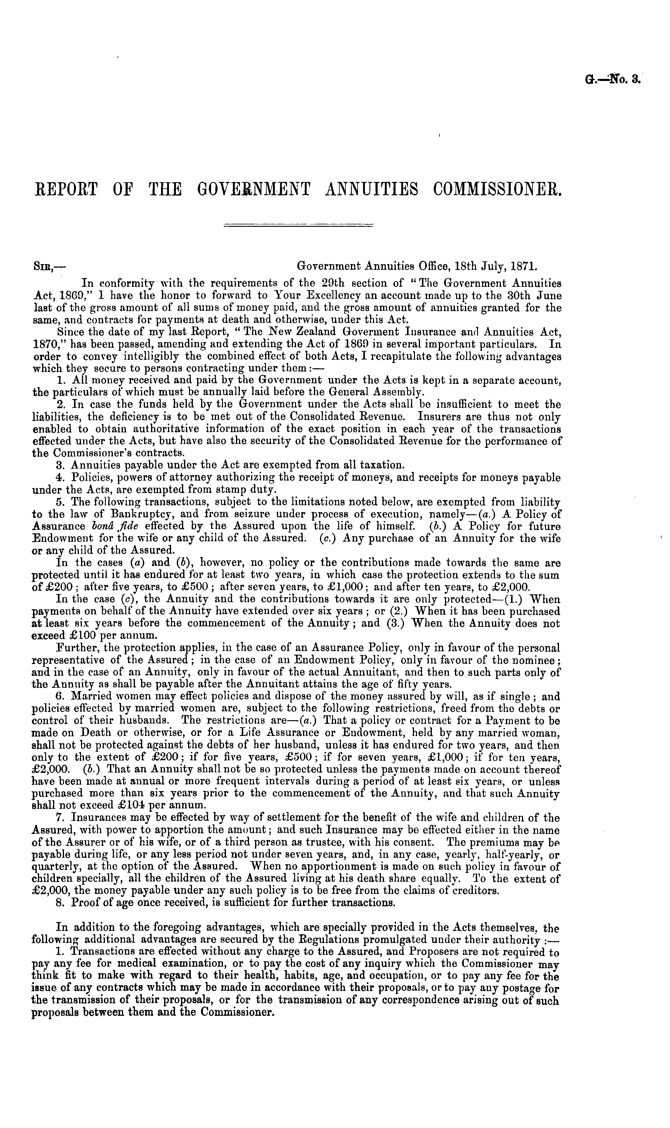 Sir, — Government Annuities Office, 18th July, 1871. In conformity with the requirements of the 29th section of " The Government Annuities Act, 1569," 1 have the honor to forward to Your Excellency an account made up to the 30th June last of the gross amount of all sums of money paid, and the gross amount of annuities granted for the same, and contracts for payments at death and otherwise, under this Act. Since the date of my last Report, " The New Zealand Goverment Insurance and Annuities Act, 1870," has been passed, amending and extending the Act of 1869 in several important particulars. In order to convey intelligibly the combined effect of both Acts, I recapitulate the following advantages which they secure to persons contracting under them: — 1. All money received and paid by the Government under the Acts is kept in a separate account, the particulars of which must be annually laid before the General Assembly. 2. In case the funds held by the Government under the Acts shall be insufficient to meet the liabilities, the deficiency is to be met out of the Consolidated Revenue. Insurers are thus not only enabled to obtain authoritative information of the exact position in each year of the transactions effected under the Acts, but have also the security of the Consolidated Revenue for the performance of the Commissioner's contracts. 3. Annuities payable under the Act are exempted from all taxation. 4. Policies, powers of attorney authorizing the receipt of moneys, and receipts for moneys payable under the Acts, are exempted from stamp duty. 5. The following transactions, subject to the limitations noted below, are exempted from liability to the law of Bankruptcy, and from seizure under process of execution, namely — (a.) A Policy of Assurance bond fide effected by the Assured upon the life of himself, (b.) A Policy for future Endowment for the wife or any child of the Assured, (c.) Any purchase of an Annuity for the wife or any child of the Assured. In the cases (a) and (b), however, no policy or the contributions made towards the same are protected until it has endured for at least two years, in which case the protection extends to the sum of £200 ; after five years, to £500 ; after seven years, to £1,000; and after ten years, to £2,000. In the ease (c), the Annuity and the contributions towards it are only protected—(l.) When payments on behalf of the Annuity have extended over six years ; or (2.) When it has been purchased at least six years before the commencement of the Annuity ; and (3.) When the Annuity does not exceed £100 per annum. Further, the protection applies, in the case of an Assurance Policy, only in favour of the personal representative of the Assured ; in the case of an Endowment Policy, only in favour of the nominee; and in the case of an Annuity, only in favour of the actual Annuitant, and then to such parts only of the Annuity as shall be payable after the Annuitant attains the age of fifty years. 6. Married women may effect policies and dispose of the money assured by will, as if single ; and policies effected by married women are, subject to the following restrictions, freed from the debts or control of their husbands. The restrictions are— (a.) That a policy or contract for a Payment to be made on Death or otherwise, or for a Life Assurance or Endowment, held by any married woman, shall not be protected against the debts of her husband, unless it has endured for two years, and then only to the extent of £200; if for five years, £500 ; if for seven years, £1,000; if for ten years, £2,000. (b.) That an Annuity shall not be so protected unless the payments made on account thereof have been made at annual or more frequent intervals during a period of at least six years, or unless purchased more than six years prior to the commencement of the Annuity, and that such Annuity shall not exceed £104 per annum. 7. Insurances may be effected by way of settlement for the benefit of the wife and children of the Assured, with power to apportion the amount; and such Insurance may be effected either in the name of tbe Assurer or of his wife, or of a third person as trustee, with his consent. The premiums may be payable during life, or any less period not under seven years, and, in any case, yearly, half-yearly, or quarterly, at the option of the Assured. AVhen no apportionment is made on such policy in favour of children specially, all the children of the Assured living at his death share equally. To the extent of £2,000, the money payable under any such policy is to bo free from the claims of creditors. 8. Proof of age once received, is sufficient for further transactions. In addition to the foregoing advantages, which are specially provided in the Acts themselves, the following additional advantages are secured by the Regulations promulgated under their authority :— 1. Transactions are effected without any charge to the Assured, and Proposers are not required to pay any fee for medical examination, or to pay the cost of any inquiry which the Commissioner may think fit to make with regard to their health, habits, age, and occupation, or to pay any fee for the issue of any contracts which may be made in accordance with their proposals, or to pay any postage for the transmission of their proposals, or for the transmission of any correspondence arising out of such proposals between them and the Commissioner.