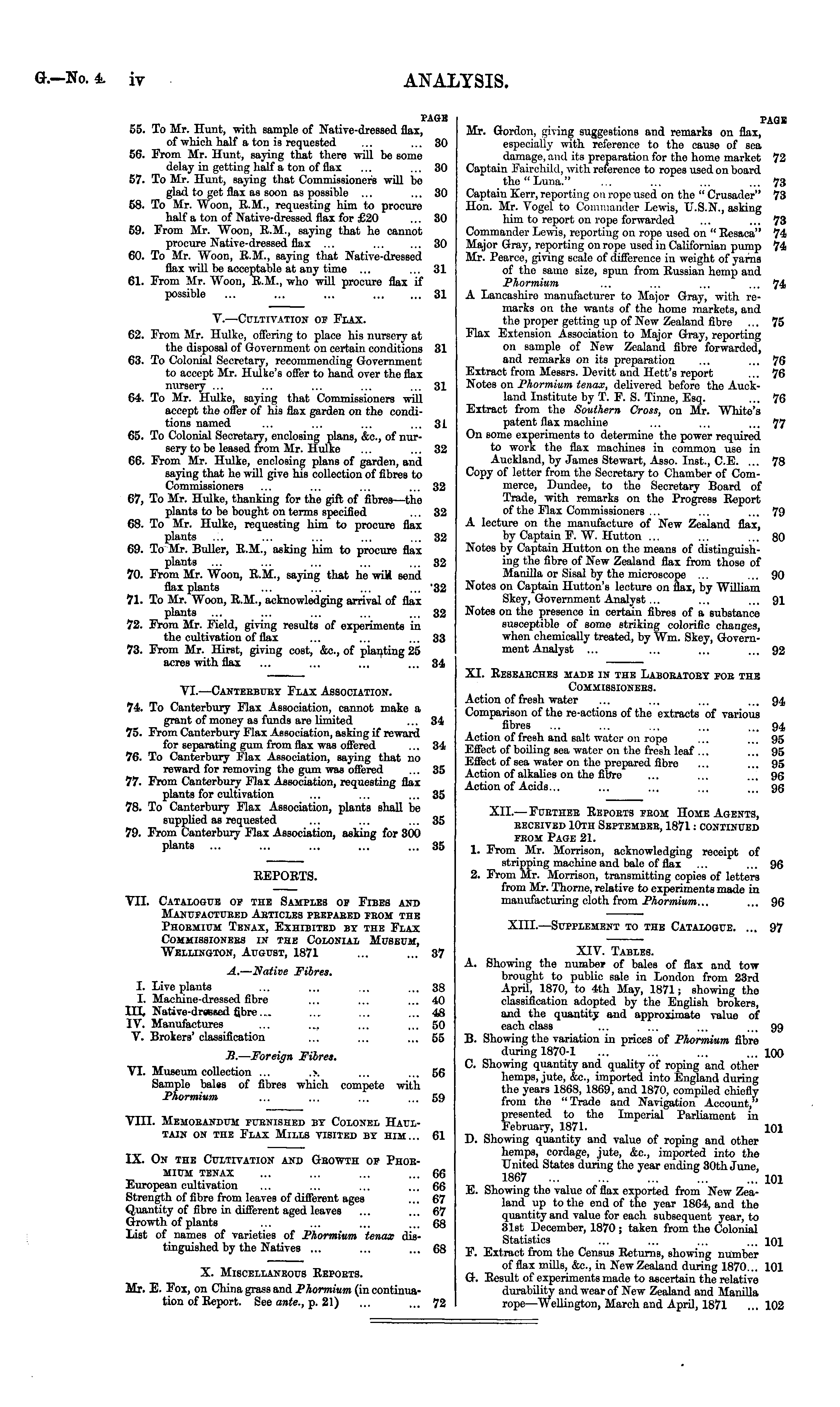 PAGB PAGE 55. To Mr. Hunt, with sample of Native-dressed flax, Mr. Gordon, giving suggestions and remarks on flax, of which half a ton is requested ... ... 30 especially w-ith reference to the cause of sea 56. From Mr. Hunt, saying that there will be some damage, and its preparation for the home market 72 delay in getting half a ton of flax ... ... 30 Captain Fairchild, with reference to ropes used on board 57. To Mr. Hunt, saying that Commissioners will be the "Luna." ... ... ... .73 glad to get flax as soon as possible ... ... 30 Captain Kerr, reporting on rope used on the "Crusader" 73 58. To Mr. Woon, R.M, requesting him to procure Hon. Mr. Vogel to Commander Lewis, U.S.N, asking half a ton of Native-dressed flax for £20 ... 30 him to report on rope forwarded ... ... 73 59. From Mr. Woon, R.M, saying that he cannot Commander Lewis, reporting on rope used on " Resaca" 74 procure Native-dressed flax ... 30 Major Gray, reporting on rope used in Califomian pump 74 60. To Mr. Woon, R.M, saying that Native-dressed Mr. Pearce, giving scale of difference in weight of yams flax will be acceptable at any time ... ... 31 of the same size, spun from Russian hemp and 61. From Mr. Woon, R.M, who will proeuro flax if Phormium ... ... ... ... 74 possible ... ... ... 31 A Lancashire manufacturer to Major Gray, with remarks on the wants of the home markets, and V.—Cultivation of Flax. the proper getting up of New Zealand fibre ... 75 62. From Mr. Hulke, offering to place his nursery at Flax Extension Association to Major Gray, reporting the disposal of Government on certain conditions 31 on sample of New Zealand fibre forwarded, 63. To Colonial Secretary, recommending Government a"d remarks on its preparation ... ... 76 to accept Mr. Hulke's offer to hand over the flax Extract from Messrs. Devitt and Hett's report ... 76 nursery ... ... ... ... ... 31 Notes on Phormium tenax, delivered before the Auck--64. To Mr. Hulke, saying that Commissioners will land Institute by T. F. S. Tinne, Esq. ... 76 accept the offer of his flax garden on the condi- Extract from tho Southern Cross, on Mr. White's tions named ... ... ... ... 31 patent flax machine ... ... ... 77 65. To Colonial Secretary, enclosing plans, &c, of nur- On some experiments to determine the power required sery to be leased from Mr. Hulke ... ... 32 t° work the flax machines in common use in 66. From Mr. Hulke, enclosing plans of garden, and Auckland, by James Stewart, Asso. Inst, C.E. ... 78 saying that he will give his collection of fibres to Copy of letter from the Secretary to Chamber of CornCommissioners ... ... ... ... 32 merce, Dundee, to the Secretary Board of 67. To Mr. Hulke, thanking for the gift of fibreB —the Trade, with remarks on tho Progress Report plants to be bought on terms specified ... 32 of the Flax Commissioners ... ... ... 79 68. To Mr. Hulke, requesting him to procure flax ■*• lecture on the manufacture of New Zealand flax, plants ... ... ... ... ... 32 by Captain F. W. Hutton ... ... ... 80 69. To Mr. Buller, R.M, asking him to procure flax Notes by Captain Hutton on the means of distinguishplants ... ... ... ... ... 32 ing the fibre of New Zealand flax from those of 70. From Mr. Woon, R.M, saying that he wiH send Manilla or Sisal by the microscope ... ... 90 flax plants ... ... ... ... '32 Notes on Captain Hutton's lecture on flax, by William 71. To Mr. Woon, R.M, acknowledging arrival of flax Skey, Government Analyst... ... ... 91 plants ... ... ... ... ... 32 Notes on the presence in certain fibres of a substance 72. From Mr. Field, giving results of experiments in susceptible of some striking colorific changes, the cultivation of flax ... ... ... 33 when chemically treated, by Wm. Skey, Govern--73. From Mr. Hirst, giving cost, &c, of planting 25 ment Analyst ... ... ... ... 92 acres with flax ... ... ... ... 34 XI. Researches made in the Laboratory for the Vl.—Canterbury Flax Association. A . ff Commissioners. 74. To Canterbury Flax Association, cannot make a Comparison^' the re-actions of the'extracts "of various ®* grant ot money as funds are limited ... 34 fibres Q A 75. From Canterbury Flax Association, asking if reward Action of fresh and salt water on rope '.'.'. "95 ft« T o sc f P a™tmg g,um _TOn fla? was off? red „■ ■' 34 Effect of boiling sea water on the fresh leaf ... .. 95 76. To Canterbury i lax Association, saying that no Effect of sea water on the prepared fibre ... 95 ft- T7 reW?< rds or, remoJ; i lng he6?™ ™3 °ffered .- 35 Action of alkalies on the fibre ' 96 77. From Canterbury Flax Association, requesting flax Action of Acids Qfi plants for cultivation ... ... ... 35 '" 78. To^Canterbury^Flax^Association, plants shall be XII.-Further Reports from Home Agents, 79. From Canterbury Flax Association, asking for 300 from Page 21 plants "• — ••• — ... 35 __ From Mr. Morrison, acknowledging receipt of stripping machine and bale of flax ... ... 96 REPORTS. 2. From Mr. Morrison, transmitting copies of letters from Mr. Thome, relative to experiments made in VII. Catalogue of the Samples of Fibes and manufacturing cloth from Phormium... ... 96 Manufactured Articles prepared from the Phormium Tenax, Exhibited by the Flax Xlll.—Supplement to the Catalogue. ... 97 Commissioners in the Colonial Museum, Wellington, August, 1871 ... ... 37 XIV. Tables. , v,. j,., A. Showing the number of bales of flax and tow A.—JSative Fibres. brought to public sale in London from 23rd I. Live plants ... ... ... ... 38 April, 1870, to 4th May, 1871; showing the I. Machine-dressed fibre ... ... ... 40 classification adopted by the English brokers, lIX Native-drtssed fibre.... ... ... ... 48 and the quantity and approximate value of IV. Manufactures ... ._. ... ... 50 each class ... ... ... ... 99 V. Brokers'classification ... ... ... 55 B. Showing the variation in prices of Phormium fibre R.-Foreign Fibres. _ _ d™"81870-1 .. 100 T, T ~ „ ~ C. Showing quantity and quality of ropmg and 