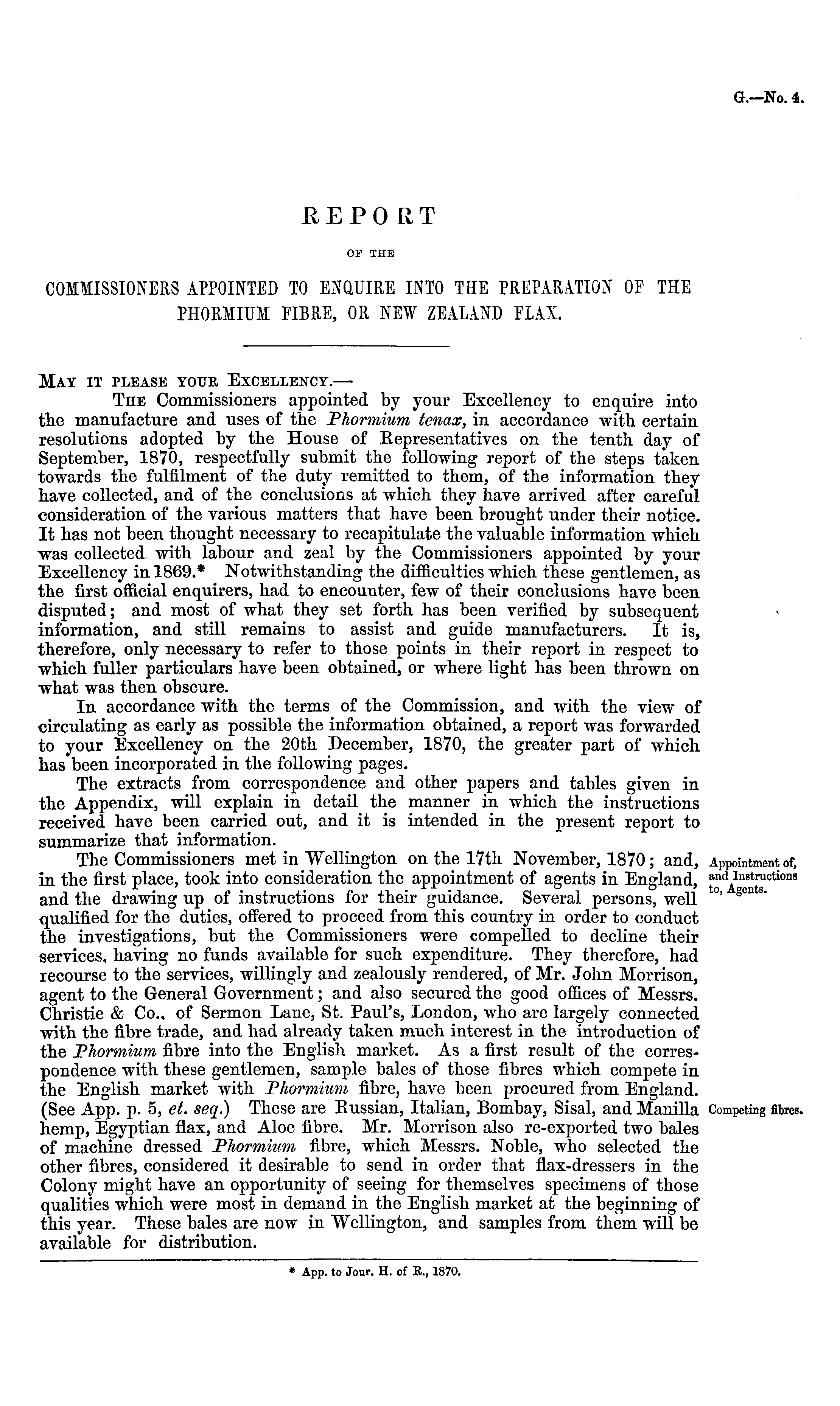 May it please tour Excellency.— The Commissioners appointed by your Excellency to enquire into the manufacture and uses of the JPIwrmium tenax, in accordance with certain resolutions adopted by the House of Representatives on the tenth day of September, 1870, respectfully submit the following report of the steps taken towards the fulfilment of the duty remitted to them, of the information they have collected, and of the conclusions at which they have arrived after careful consideration of the various matters that have been brought under their notice. It has not been thought necessary to recapitulate the valuable information which was collected with labour and zeal by the Commissioners appointed by your Excellency in 1869.* Notwithstanding the difficulties which these gentlemen, as the first official enquirers, had to encounter, few of their conclusions have been disputed; and most of what they set forth has been verified by subsequent information, and still remains to assist and guide manufacturers. It is, therefore, only necessary to refer to those points in their report in respect to which fuller particulars have been obtained, or where light has been thrown on what was then obscure. In accordance with the terms of the Commission, and with the view of circulating as early as possible the information obtained, a report was forwarded to your Excellency on the 20th December, 1870, the greater part of which has been incorporated in the following pages. The extracts from correspondence and other papers and tables given in the Appendix, will explain in detail the manner in which the instructions received have been carried out, and it is intended in the present report to summarize that information. The Commissioners met in Wellington on the 17th November, 1870; and, in the first place, took into consideration the appointment of agents in England, and the drawing up of instructions for their guidance. Several persons, well qualified for the duties, offered to proceed from this country in order to conduct the investigations, but the Commissioners were compelled to decline their services, having no funds available for such expenditure. They therefore, had recourse to the services, willingly and zealously rendered, of Mr. John Morrison, agent to the General Government; and also secured the good offices of Messrs. Christie & Co., of Sermon Lane, St. Paul's, London, who are largely connected with the fibre trade, and had already taken much interest in the introduction of the Phormium fibre into the English market. As a first result of the correspondence with these gentlemen, sample bales of those fibres which compete in the English market with Phormium fibre, have been procured from England. (See App. p. 5, et. seq.) These are Eussian, Italian, Bombay, Sisal, and Manilla hemp, Egyptian flax, and Aloe fibre. Mr. Morrison also re-exported two bales of machine dressed Phormium fibre, which Messrs. Noble, who selected the other fibres, considered it desirable to send in order that flax-dressers in the Colony might have an opportunity of seeing for themselves specimens of those qualities which were most in demand in the English market at the beginning of this year. These bales are now in Wellington, and samples from them will be available for distribution. * App. to Jour. H. of R., 1870.