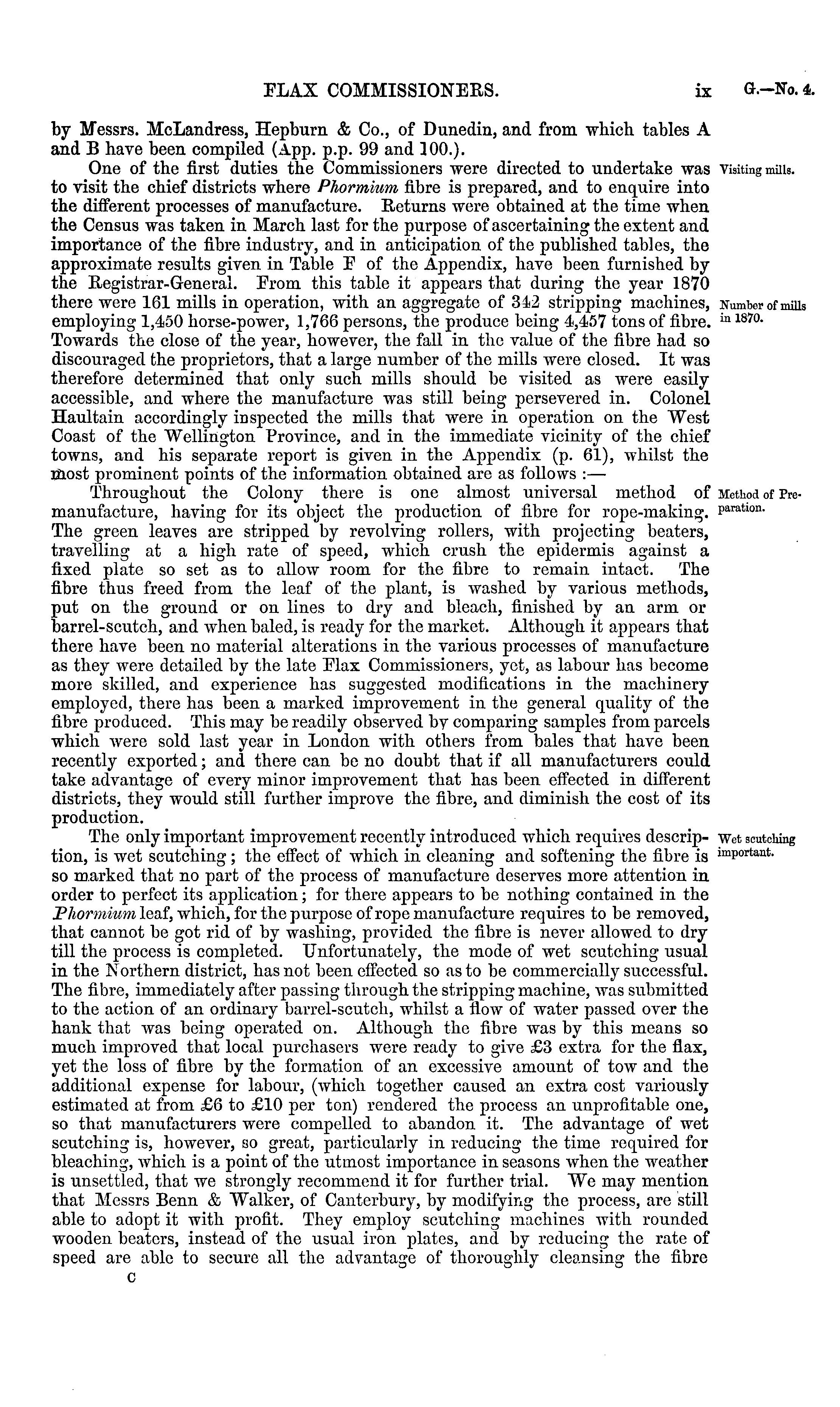 by Messrs. McLandress, Hepburn & Co., of Dunedin, and from which tables A and B have been compiled (App. p.p. 99 and ]00.). One of the first duties the Commissioners were directed to undertake was to visit the chief districts where Phormium fibre is prepared, and to enquire into the different processes of manufacture. Returns were obtained at the time when the Census was taken in March last for the purpose of ascertaining the extent and importance of the fibre industry, and in anticipation of the published tables, the approximate results given in Table E of the Appendix, have been furnished by the Registrar-General. Erom this table it appears that during the year 1870 there were 161 mills in operation, with an aggregate of 342 stripping machines, employing 1,450 horse-power, 1,766 persons, the produce being 4,457 tons of fibre. Towards the close of the year, however, the fall in the value of the fibre had so discouraged the proprietors, that a large number of the mills were closed. It was therefore determined that only such mills should be visited as were easily accessible, and where the manufacture was still being persevered in. Colonel Haultain accordingly inspected the mills that were in operation on the West Coast of the Wellington Province, and in the immediate vicinity of the chief towns, and his separate report is given in the Appendix (p. 61), whilst the most prominent points of the information obtained are as follows : — Throughout the Colony there is one almost universal method of manufacture, having for its object the production of fibre for rope-making. The green leaves are stripped by revolving rollers, with projecting beaters, travelling at a high rate of speed, which crush the epidermis against a fixed plate so set as to allow room for the fibre to remain intact. The fibre thus freed from the leaf of the plant, is washed by various methods, put on the ground or on lines to dry and bleach, finished by an arm or barrel-scutch, and when baled, is ready for the market. Although it appears that there have been no material alterations in the various processes of manufacture as they were detailed by the late Elax Commissioners, yet, as labour has become more skilled, and experience has suggested modifications in the machinery employed, there has been a marked improvement in the general quality of the fibre produced. This may be readily observed bv comparing samples from parcels which were sold last year in London with others from bales that have been recently exported; and there can be no doubt that if all manufacturers could take advantage of every minor improvement that has been effected in different districts, they would still further improve the fibre, and diminish the cost of its production. The only important improvement recently introduced which requires description, is wet scutching ; the effect of which in cleaning and softening the fibre is so marked that no part of the process of manufacture deserves more attention in order to perfect its application; for there appears to be nothing contained in the Phormium leaf, which, for the purpose of rope manufacture requires to be removed, that cannot be got rid of by washing, provided the fibre is never allowed to dry till the process is completed. Unfortunately, the mode of wet scutching usual in the Northern district, has not been effected so as to be commercially successful. The fibre, immediately after passing through the stripping machine, was submitted to the action of an ordinary barrel-scutch, whilst a flow of water passed over the hank that was being operated on. Although the fibre was by this means so much improved that local purchasers were ready to give £3 extra for the flax, yet the loss of fibre by the formation of an excessive amount of tow and the additional expense for labour, (Avhich together caused an extra cost variously estimated at from £6 to £10 per ton) rendered the process an unprofitable one, so that manufacturers were compelled to abandon it. The advantage of wet scutching is, however, so great, particularly in reducing the time required for bleaching, which is a point of the utmost importance in seasons when the weather is unsettled, that we strongly recommend it for further trial. We may mention that Messrs Benn & Walker, of Canterbury, by modifying the process, are still able to adopt it with profit. They employ scutching machines with rounded wooden beaters, instead of the usual iron plates, and by reducing the rate of speed are able to secure all the advantage of thoroughly cleansing the fibre c