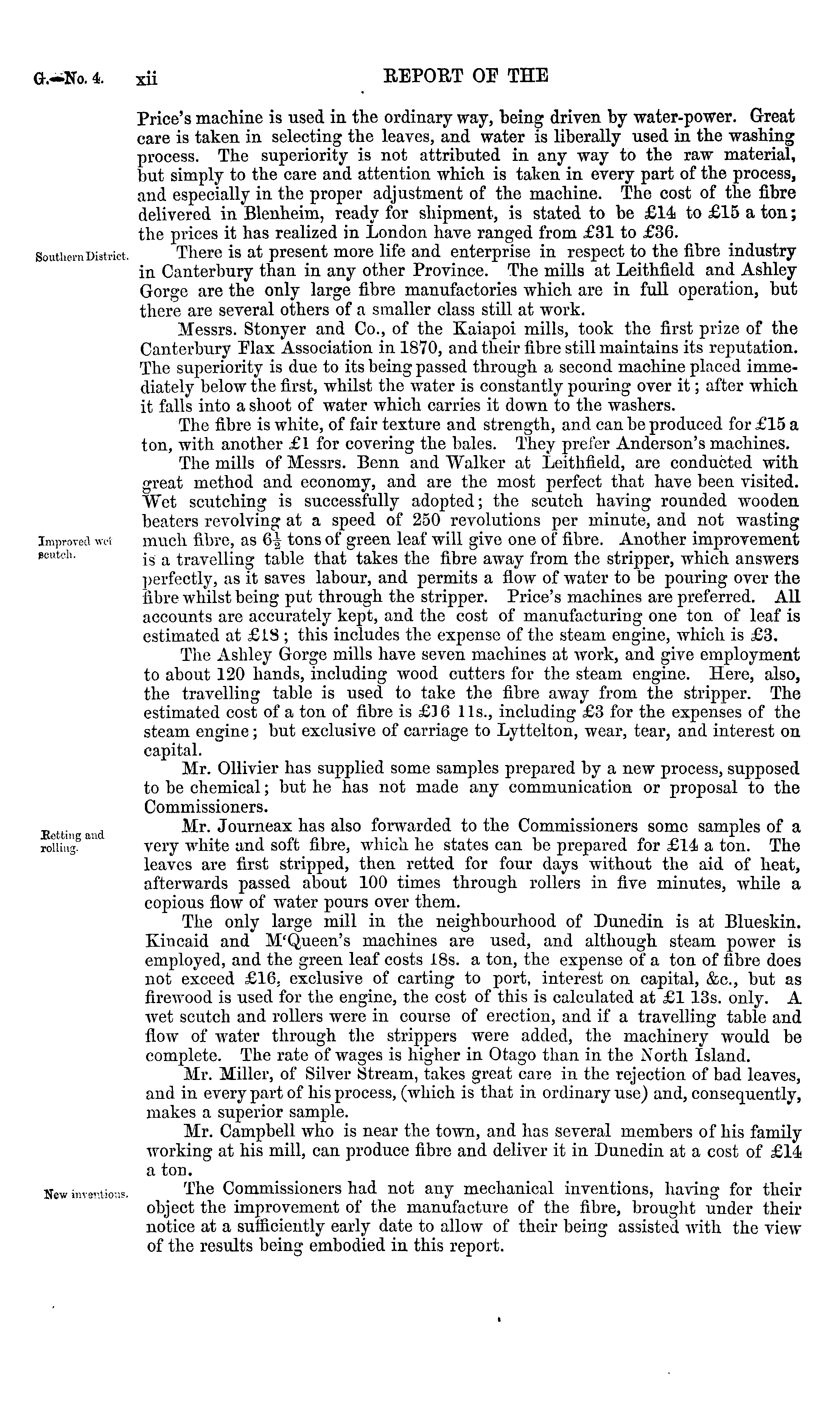 Price's machine is used in the ordinary way, being driven by water-power. Great care is taken in selecting the leaves, and water is liberally used in the washing process. The superiority is not attributed in any way to the raw material, but simply to the care and attention which is taken in every part of the process, and especially in the proper adjustment of the machine. The cost of the fibre delivered in Blenheim, ready for shipment, is stated to be £14 to £15 a ton; the prices it has realized in London have ranged from £31 to £36. There is at present more life and enterprise in respect to the fibre industry in Canterbury than in any other Province. The mills at Leithfield and Ashley Gorge are the only large fibre manufactories which are in full operation, but there are several others of a smaller class still at work. Messrs. Stonyer and Co., of the Kaiapoi mills, took the first prize of the Canterbury Elax Association in 1870, and their fibre still maintains its reputation. The superiority is due to its being passed through a second machine placed immediately below the first, whilst the water is constantly pouring over it; after which it falls into a shoot of water which carries it down to the washers. The fibre is white, of fair texture and strength, and can be produced for £15 a ton, with another £1 for covering the bales. They prefer Anderson's machines. The mills of Messrs. Benn and Walker at Leithfield, are conducted with great method and economy, and are the most perfect that have been visited. Wet scutching is successfully adopted; the scutch having rounded wooden beaters revolving at a speed of 250 revolutions per minute, and not wasting much fibre, as 6^ tons of green leaf will give one of fibre. Another improvement is a travelling table that takes the fibre away from the stripper, which answers perfectly, as it saves labour, and permits a flow of water to be pouring over the fibre whilst being put through the stripper. Price's machines are preferred. All accounts are accurately kept, and the cost of manufacturing one ton of leaf is estimated at £18 ; this includes the expense of the steam engine, which is £3. The Ashley Gorge mills have seven machines at work, and give employment to about 120 hands, including wood cutters for the steam engine. Here, also, the travelling table is used to take the fibre away from the stripper. The estimated cost of a ton of fibre is £16 lis., including £3 for the expenses of the steam engine ; but exclusive of carriage to Lyttelton, wear, tear, and interest on capital. Mr. Ollivier has supplied some samples prepared by a new process, supposed to be chemical; but he has not made any communication or proposal to the Commissioners. Mr. Journeax has also forwarded to the Commissioners some samples of a very white and soft fibre, which he states can be prepared for £14 a ton. The leaves are first stripped, then retted for four days without the aid of heat, afterwards passed about 100 times through rollers in five minutes, while a copious flow of water pours over them. The only large mill in the neighbourhood of Dunedin is at Blueskin. Kiucaid and M'Queen's machines are used, and although steam power is employed, and the green leaf costs 18s. a ton, the expense of a ton of fibre does not exceed £16. exclusive of carting to port, interest on capital, &c, but as firewood is used for the engine, the cost of this is calculated at £1 13s. only. A wet scutch and rollers were in course of erection, and if a travelling table and flow of w rater through the strippers were added, the machinery would be complete. The rate of wages is higher in Otago than in the North Island. Mr. Miller, of Silver Stream, takes great care in the rejection of bad leaves, and in every part of his process, (which is that in ordinary use) and, consequently, makes a superior sample. Mr. Campbell who is near the town, and has several members of his family working at his mill, can produce fibre and deliver it in Dunedin at a cost of £14 a ton. The Commissioners had not any mechanical inventions, having for their object the improvement of the manufacture of the fibre, brought under their notice at a sufficiently early date to allow of their being assisted with the view of the results being embodied in this report.