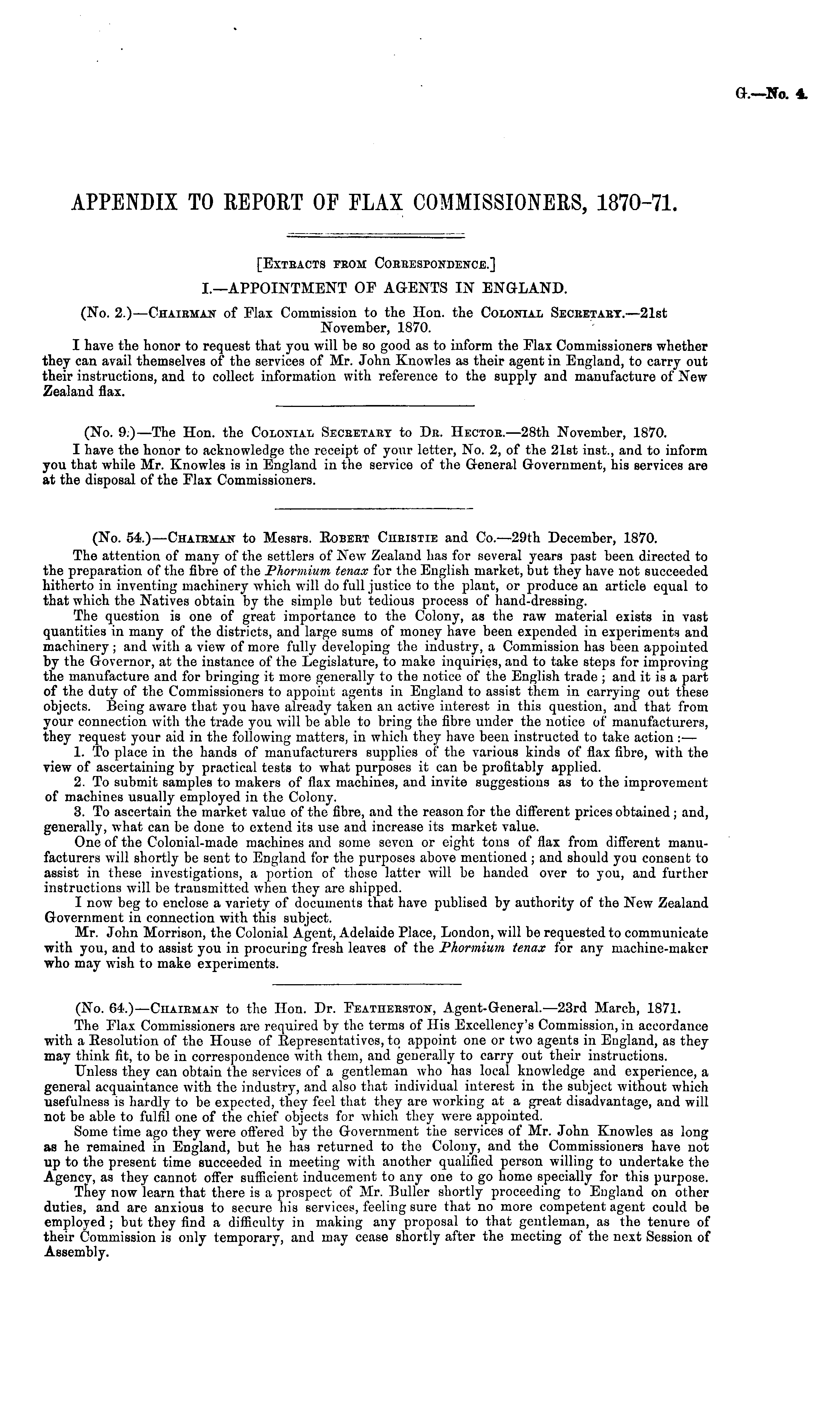 [Extracts from Cobeespondence.] I.—APPOINTMENT OE AGENTS IN ENGLAND. (No. 2.) —Chairman of Flax Commission to the Hon. the Colonial Seceetart.—2lst November, 1870. I have the honor to request that you will be so good as to inform the Flax Commissioners whether they can avail themselves of the services of Mr. John Knowles as their agent in England, to carry out their instructions, and to collect information with reference to the supply and manufacture of New Zealand flax.