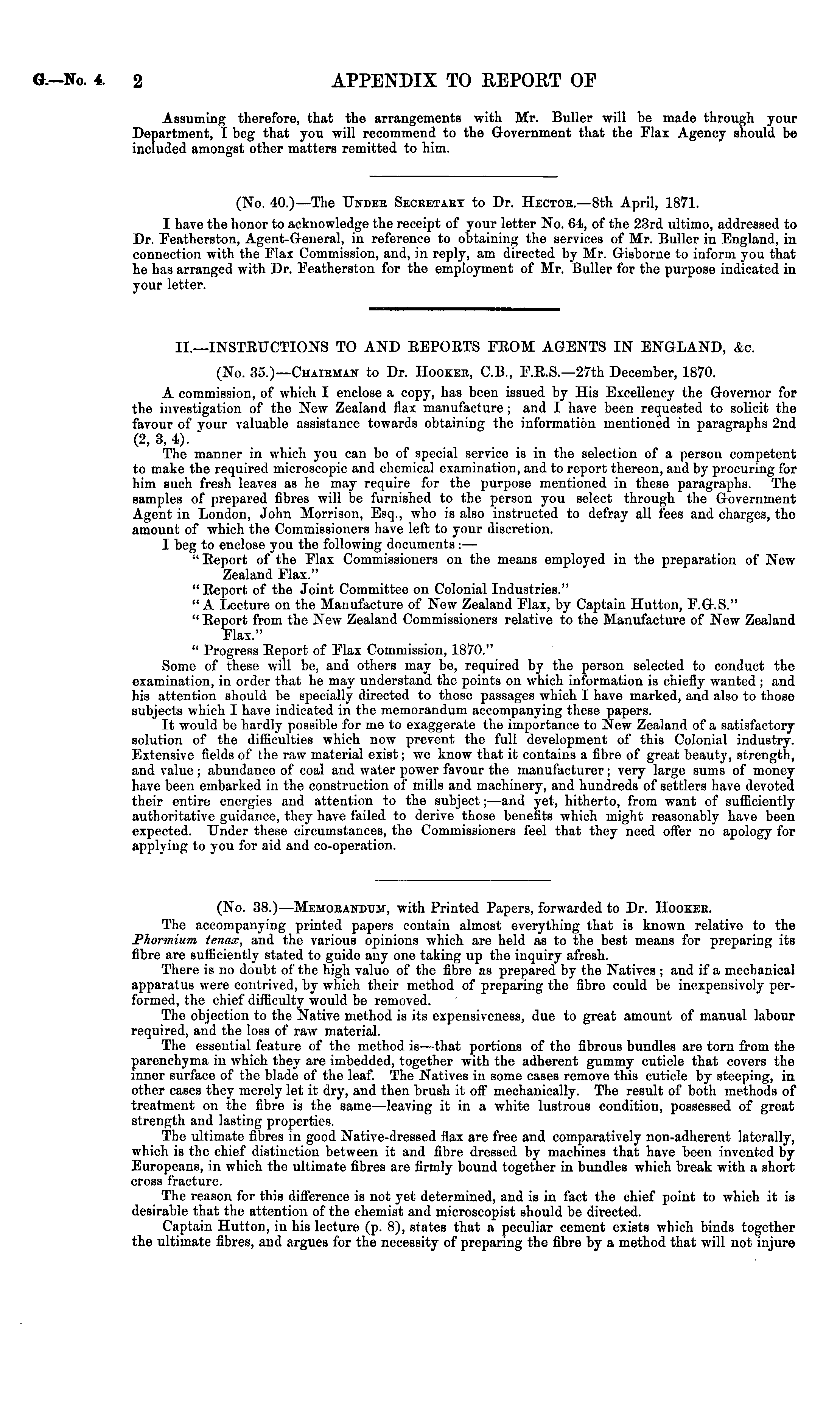 lI.—INSTRUCTIONS TO AND REPORTS FROM AGENTS IN ENGLAND, &c. (No. 35.)—Chaieman to Dr. Hooeee, C.8., F.R.S.—27th December, 1870. A commission, of which I enclose a copy, has been issued by His Excellency the Governor for the investigation of the New Zealand flax manufacture ; and I have been requested to solicit the favour of your valuable assistance towards obtaining the information mentioned in paragraphs 2nd (2> 3- 4)' " The manner in which you can bo of special service is in the selection of a person competent to make the required microscopic and chemical examination, and to report thereon, and by procuring for him such fresh leaves as he may require for the purpose mentioned in these paragraphs. The samples of prepared fibres will be furnished to the person you select through the Government Agent in London, John Morrison, Esq., who is also instructed to defray all fees and charges, the amount of which the Commissioners have left to your discretion. I beg to enclose you the following documents: — " Report of the Flax Commissioners on the means employed in the preparation of Now Zealand Flax." "Report of the Joint Committee on Colonial Industries." " A Lecture on the Manufacture of New Zealand Flax, by Captain Hutton, F.G.S." " Report from the New Zealand Commissioners relative to the Manufacture of New Zealand Flax." " Progress Report of Flax Commission, 1870." Some of these will be, and others may be, required by the person selected to conduct the examination, in order that he may understand the points on which information is chiefly wanted ; and his attention should be specially directed to those passages which I have marked, and also to those subjects which I have indicated in the memorandum accompanying these papers. It would be hardly possible for me to exaggerate the importance to New Zealand of a satisfactory solution of the difficulties which now prevent the full development of this Colonial industry. Extensive fields of the raw material exist; we know that it contains a fibre of great beauty, strength, and value; abundance of coal and water power favour the manufacturer; very large sums of money have been embarked in the construction of mills and machinery, and hundreds of settlers have devoted their entire energies and attention to the subject; —and yet, hitherto, from want of sufficiently authoritative guidance, they have failed to derive those benefits which might reasonably have been expected. Under these circumstances, the Commissioners feel that they need offer no apology for applying to you for aid and co-operation.