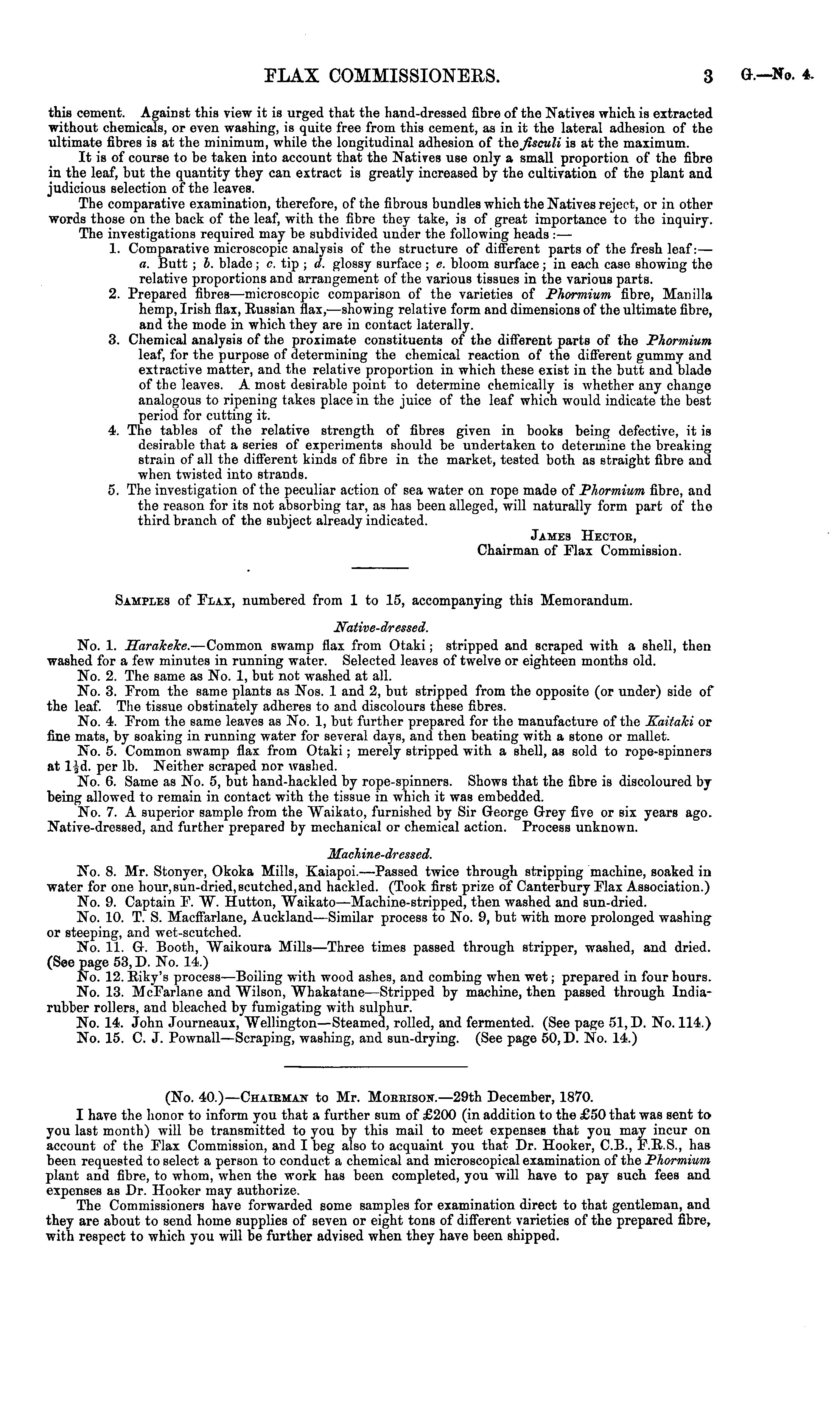(No. 40.) —Chaieman to Mr. Mobeison.—29th December, 1870. I have the honor to inform you that a further sum of £200 (in addition to the £50 that was sent to you last month) will be transmitted to you by this mail to meet expenses that you may incur on account of the Flax Commission, and I beg also to acquaint you that Dr. Hooker, C.8., F.R.S., has been requested to select a person to conduct a chemical and microscopical examination of the Phormium plant and fibre, to whom, when the work has been completed, you will have to pay such fees and expenses as Dr. Hooker may authorize. The Commissioners have forwarded some samples for examination direct to that gentleman, and they are about to send home supplies of seven or eight tons of different varieties of the prepared fibre, with respect to which you will be further advised when they have been shipped.