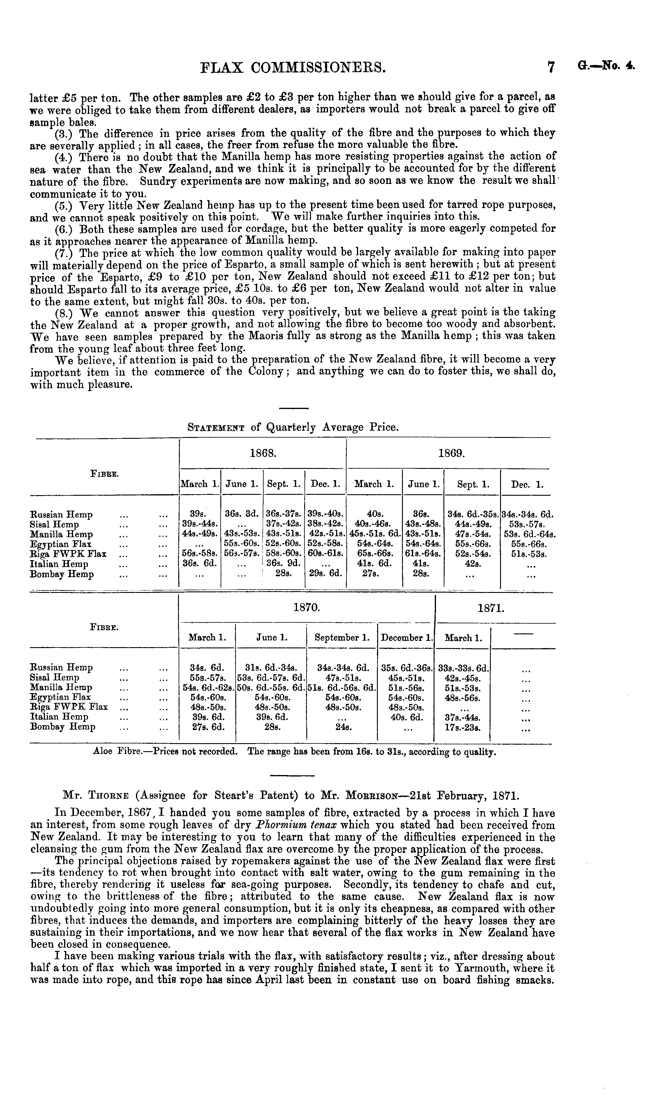 Mr. Thorne (Assignee for Steart's Patent) to Mr. Mobeison—2lst February, 1871. In December, 1867,1 handed you some samples of fibre, extracted by a process in which I have an interest, from some rough leaves of dry Phormium tenax which you stated had been received from New Zealand. It may be interesting to you to learn that many of the difficulties experienced in the cleansing the gum from the New Zealand flax are overcome by the proper application of the process. The principal objections raised by ropemakers against the use of the New Zealand flax were first —its tendency to rot when brought into contact with salt water, owing to the gum remaining in the fibre, thereby rendering it useless for sea-going purposes. Secondly, its tendency to chafe and cut, owing to the brittleness of the fibre; attributed to the same cause. New Zealand flax is now undoubtedly going into more general consumption, but it is only its cheapness, as compared with other fibres, that induces the demands, and importers are complaining bitterly of the heavy losses they are sustaining in their importations, and we now hear that several of the flax works in New Zealand have been closed in consequence. I have been making various trials with the flax, with satisfactory results; viz., after dressing about half a ton of flax which was imported in a very roughly finished state, I sent it to Yarmouth, where it was made into rope, and this rope has since April last been in constant use on board fishing smacks.