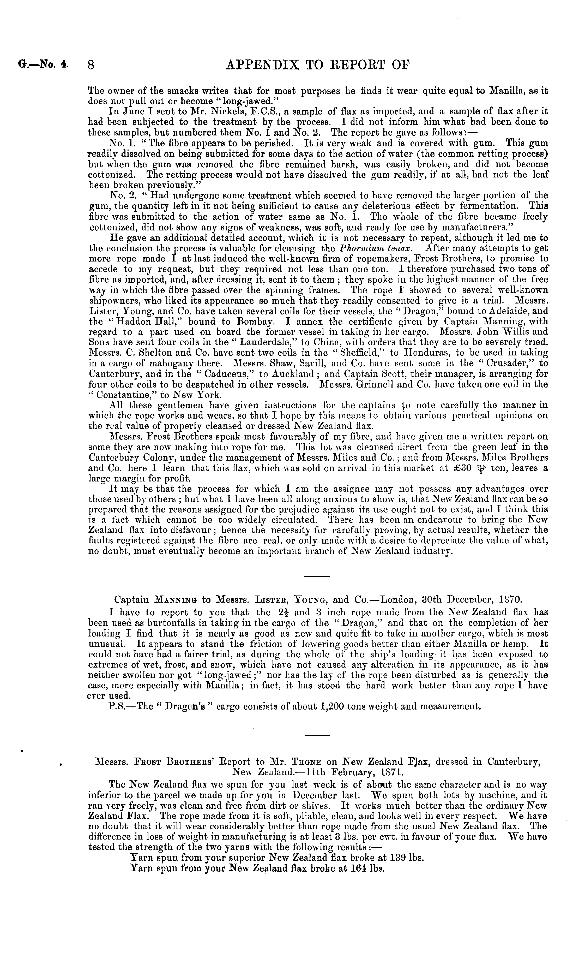 The owner of the smacks writes that for most purposes he finds it wear quite equal to Manilla, as it does not pull out or become "long-jawed." In June I sent to Mr. Nickels, F.C.S., a sample of flax as imported, and a sample of flax after it had been subjected to the treatment by the process. I did not inform him what had been done to these samples, but numbered them No. 1 and No. 2. The report he gave as follows': — No. 1. " The fibre appears to be perished. It is very weak and is covered with gum. This gum readily dissolved on being submitted for some days to the action of water (the common retting process) but when the gum was removed the fibre remained harsh, was easily broken, and did not become cottonized. The retting process would not have dissolved the gum readily, if at all, had not the leaf been broken previously." No. 2. " Had undergone some treatment which seemed to have removed the larger portion of the gum, the quantity left in it not being sufficient to cause any deleterious effect by fermentation. This fibre was submitted to the action of water same as No. 1. The whole of the fibre became freely cottonized, did not show any signs of weakness, was soft, and ready for use by manufacturers." He gave an additional detailed account, which it is not necessary to repeat, although it led me to the conclusion the process is valuable for cleansing the Phormium tenax. After many attempts to get more rope made I at last induced the well-known firm of ropemakers, Frost Brothers, to promise to accede to my request, but they required not less than one ton. I therefore purchased two tons of fibre as imported, and, after dressing it, sent it to them ; they spoke in the highest manner of the free way in which the fibre passed over the spinning frames. The rope I showed to several well-known shipowners, who liked its appearance so much that they readily consented to give it a trial. Messrs. Lister, Young, and Co. have taken several coils for their vessels, the " Dragon," bound to Adelaide, and the "Haddon Hall," bound to Bombay. I annex the certificate given by Captain Manning, with regard to a part used on board the former vessel in taking in her cargo. Messrs. John Willis and Sons have sent four coils in the " Lauderdale," to China, with orders that they are to be severely tried. Messrs. C. Shelton and Co. have sent two coils in the " Sheffield," to Honduras, to be used in taking in a cargo of mahogany there. Messrs. Shaw, Savill, and Co. have sent some in the "Crusader," to Canterbury, and in the " Caduceus," to Auckland ; and Captain Scott, their manager, is arranging for four other coils to be despatched in other vessels. Messrs. Grinnell and Co. have taken one coil in the " Constantine," to New York. All these gentlemen have given instructions for the captains %o note carefully the manner in which the rope works and wears, so that 1 hope by this means to obtain various practical opinions on the real value of properly cleansed or dressed New Zealand flax. Messrs. Frost Brothers speak most favourably of my fibre, and have given me a written report on some they are now making into rope for me. This lot was cleansed direct from the green leaf in the Canterbury Colony, under the management of Messrs. Miles and Co.; and from Messrs. Miles Brothers and Co. here I learn that this flax, which was sold on arrival in this market at £30 ton, leaves a large margin for profit. It may be that the process for which I am the assignee may not possess any advantages over those used by others ; but what I have been all along anxious to show is, that New Zealand flax can be so prepared that the reasons assigned for the prejudice against its use ought not to exist, and I think this is a fact which cannot be too widely circulated. There has been an endeavour to bring the New Zealand flax into disfavour; hence the necessity for carefully proving, by actual results, whether the faults registered against the fibre are real, or only made with a desire to depreciate the value of what, no doubt, must eventually become an important branch of New Zealand industry. Captain Manning to Messrs. Listeh, Younq, and Co.—London, 30th December, lb70. I have to report to you that the 2\ and 3 inch rope made from the New Zealand flax has been used as burtonfalls in taking in the cargo of the "Dragon," and that on the completion of her loading I find that it is nearly as good as new and quite fit to take in another cargo, which is most unusual. It appears to stand the friction of lowering goods better than either Manilla or hemp. It could not have had a fairer trial, as during the whole of the ship's loading- it has been exposed to extremes of wet, frost, and snow, which have not caused any alteration in its appearance, as it has neither swollen nor got " long-jawed ;" nor lias the lay of the rope been disturbed as is generally the case, more especially with Manilla; in fact, it has stood the hard work better than any rope I have ever used. P.S.—The " Dragon's " cargo consists of about 1,200 tons weight and measurement. Messrs. Feost Bkotiieks' Eeport to Mr. Tiione on New Zealand FJax, dressed in Canterbury, New Zealand.—11th February, 1S71. The New Zealand flax we spun for you last week is of about the same character and is no way inferior to the parcel we made up for you in December last. We spun both lots by machine, and it ran very freely, was clean and free from dirt or shives. It works much better than the ordinary New Zealand Flax. The rope made from it is soft, pliable, clean, and looks well in every respect. We have no doubt that it will wear considerably better than rope made from the usual New Zealand flax. The difference in loss of weight in manufacturing is at least 3 lbs. per cwt. in favour of your flax. We have tested the strength of the two yarns with the following results : — Yarn spun from your superior New Zealand flax broke at 139 lbs. Yarn spun from your New Zealand flax broke at 1G4 lbs.