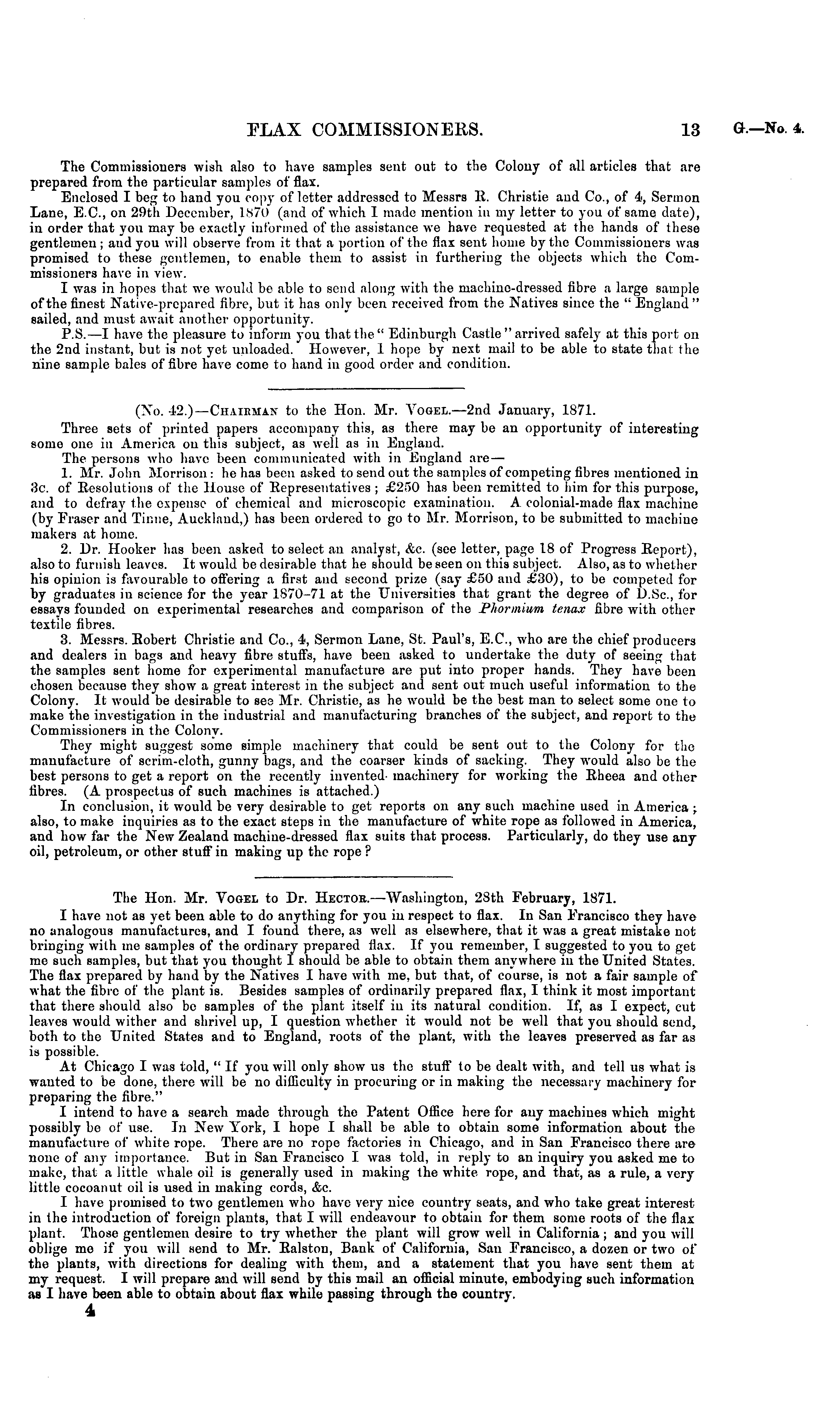 (No. 42.)—Chairman to the Hon. Mr. Yogel.—2nd January, 1871. Three sets of printed papers accompany this, as there may be an opportunity of interesting some one in America on this subject, as well as in England. The persons who have been communicated with in England are — 1. Mr. John Morrison : he has been asked to send out the samples of competing fibres mentioned in Bc. of Resolutions of the House of Eepresentatives ; £250 has been remitted to him for this purpose, and to defray the expense of chemical and microscopic examination. A colonial-made flax machine (by Fraser and Tinne, Auckland,) has been ordered to go to Mr. Morrison, to be submitted to machine makers at home. 2. Dr. Hooker has been asked to select an analyst, &c. (see letter, page 18 of Progress Report), also to furnish leaves. It would be desirable that he should be seen on this subject. Also, as to whether his opiuion is favourable to offering a first and second prize (say £50 and £30), to be competed for by graduates in science for the year 1870-71 at the Universities that grant the degree of D.Sc, for essays founded on experimental researches and comparison of the Phormium tenax fibre with other textile fibres. 3. Messrs. Robert Christie and Co., 4, Sermon Lane, St. Paul's, E.C., who are the chief producers and dealers in bags and heavy fibre stuffs, have been asked to undertake the duty of seeing that the samples sent home for experimental manufacture are put into proper hands. They have been chosen because they show a great interest in the subject and sent out much useful information to the Colony. It would be desirable to see Mr. Christie, as he would be the best man to select some one to make the investigation in the industrial and manufacturing branches of the subject, and report to the Commissioners in the Colony. They might suggest some simple machinery that could be sent out to the Colony for the manufacture of scrim-cloth, gunny bags, and the coarser kinds of sacking. They would also be the best persons to get a report on the recently invented- machinery for working the Rheea and other fibres. (A prospectus of such machines is attached.) In conclusion, it would be very desirable to get reports on any such machine used in America ; also, to make inquiries as to the exact steps in the manufacture of white rope as followed in America, and how far the New Zealand machine-dressed flax suits that process. Particularly, do they use any oil, petroleum, or other stuff' in making up the rope ?