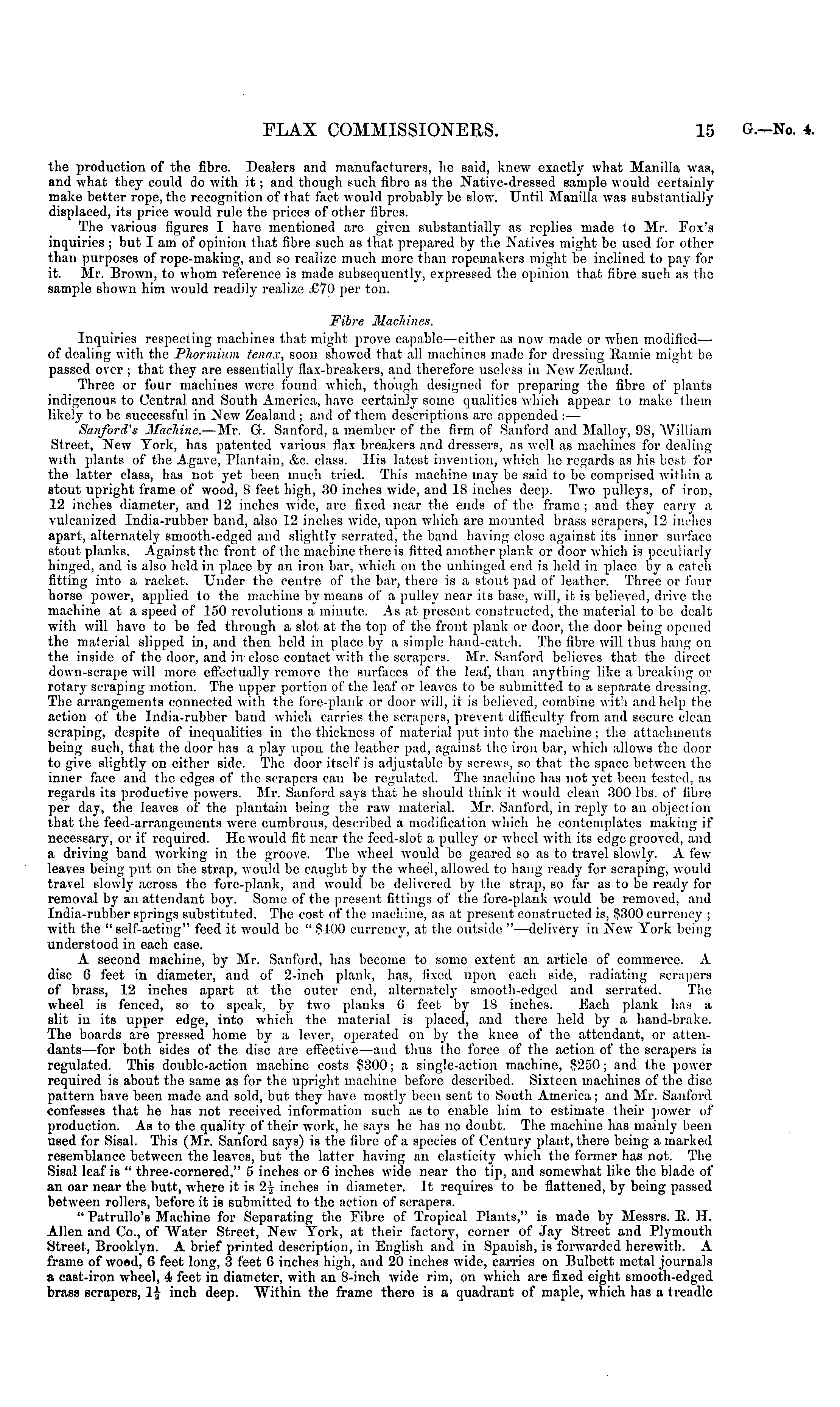 the production of the fibre. Dealers and manufacturers, he said, knew exactly what Manilla was, and what they could do with it; and though such fibro as the Native-dressed sample would certainly make better rope, the recognition of that fact would probably be slow. Until Manilla was substantially displaced, its price would rule the prices of other fibres. The various figures I have mentioned are given substantially as replies made to Mr. Fox's inquiries ; but I am of opinion that fibre such as that prepared by the Natives might be used for other than purposes of rope-making, and so realize much more than ropemakers might be inclined to pay for it. Mr. Brown, to whom reference is made subsequently, expressed the opinion that fibre such as the sample shown him would readily realize £70 per ton. Fibre Machines. Inquiries respecting machines that might prove capable—either as now made or when modified—■ of dealing with the Phormium tenax, soon showed that all machines made for dressing Ramie might be passed over ; that they are essentially flax-breakers, and therefore useless in New Zealand. Three or four machines were found which, though designed for preparing the fibre of plants indigenous to Central and South America, have certainly some qualities which appear to make Ihem likely to be successful in New Zealand; and of them descriptions are appended : — Sanford's Machine. —Mr. G. Sanford, a member of the firm of Sanford and Malloy, 98, William Street, New York, has patented various flax breakers and dressers, as well as machines for dealing with plants of the Agave, Plantain, &c. class. His latest invention, which he regards as his best for the latter class, has not yet been much tried. This machine may be said to be comprised within a stout upright frame of wood, 8 feet high, 30 inches wide, and 18 inches deep. Two pulleys, of iron, 12 inches diameter, and 12 inches wide, are fixed near the ends of the frame; and they cany a vulcanized India-rubber band, also 12 inches wide, upon which are mounted brass scrapers, 12 inches apart, alternately smooth-edged and slightly serrated, the band having close against its inner surface stout planks. Against the front of the machine there is fitted another plank or door which is peculiarly hinged, and is also held in place by an iron bar, which on tho unhinged end is held in place by a catch fitting into a racket. Under the centre of the bar, there is a stout pad of leather. Three or four horse power, applied to the machine by means of a pulley near its base, will, it is believed, drive the machine at a speed of 150 revolutions a minute. As at present constructed, the material to be dealt with will have to be fed through a slot at the top of the front plank or door, the door being opened the material slipped in, and then held in place by a simple hand-catch. The fibre will thus hang on the inside of the door, and in close contact with the scrapers. Mr. Sanford believes that the direct down-scrape will more effectually remove the surfaces of the leaf, than anything like a breaking or rotary scraping motion. The upper portion of the leaf or leaves to be submitted to a separate dressing. The arrangements connected with the fore-plank or door will, it is believed, combine with and help the action of the India-rubber band which carries the scrapers, prevent difficulty from and secure clean scraping, despite of inequalities in the thickness of material put into the machine; the attachments being such, that the door has a play upon the leather pad, against tho iron bar, which allows the door to give slightly on either side. The door itself is adjustable by screws, so that the space between the inner face and the edges of tho scrapers can be regulated. The machine has not yet been tested, as regards its productive powers. Mr. Sanford says that he should think it would clean 300 lbs. of fibre per day, the leaves of the plantain being the raw material. Mr. Sanford, in reply to an objection that the feed-arrangements were cumbrous, described a modification which he contemplates making if necessary, or if required. He would fit near the feed-slot a pulley or wheel with its edge grooved, and a driving band working in the groove. Tho wheel would be geared so as to travel slowly. A few leaves being put on the strap, would be caught by the wheel, allowed to hang ready for scraping, would travel slowly across the fore-plank, and would be delivered by the strap, so far as to be ready for removal by an attendant boy. Some of the present fittings of the fore-plank would be removed, and India-rubber springs substituted. The cost of the machine, as at present constructed is, $300 currency ; with the " self-acting" feed it would be " 8100 currency, at the outside " —delivery in New York being understood in each case. A second machine, by Mr. Sanford, has become to some extent an article of commerce. A disc 6 feet in diameter, and of 2-inch plank, has, fixed upon each side, radiating scrapers of brass, 12 inches apart at the outer end, alternatch- smooth-edged and serrated. Tho wheel is fenced, so to speak, by two planks 6 feet by 18 inches. Each plank has a slit in its upper edge, into which the material is placed, and there held by a hand-brake. The boards are pressed home by a lever, operated on by the knee of the attendant, or attendants—for both sides of the disc are effective —and thus the force of the action of the scrapers is regulated. This double-action machine costs §300; a single-action machine, 8250; and the power required is about the same as for the upright machine before described. Sixteen machines of the disc pattern have been made and sold, but they have most]}' been sent to South America ; and Mr. Sanford confesses that he has not received information such as to enable him to estimate their power of production. As to the quality of their work, he says he has no doubt. The machine has mainly been used for Sisal. This (Mr. Sanford says) is