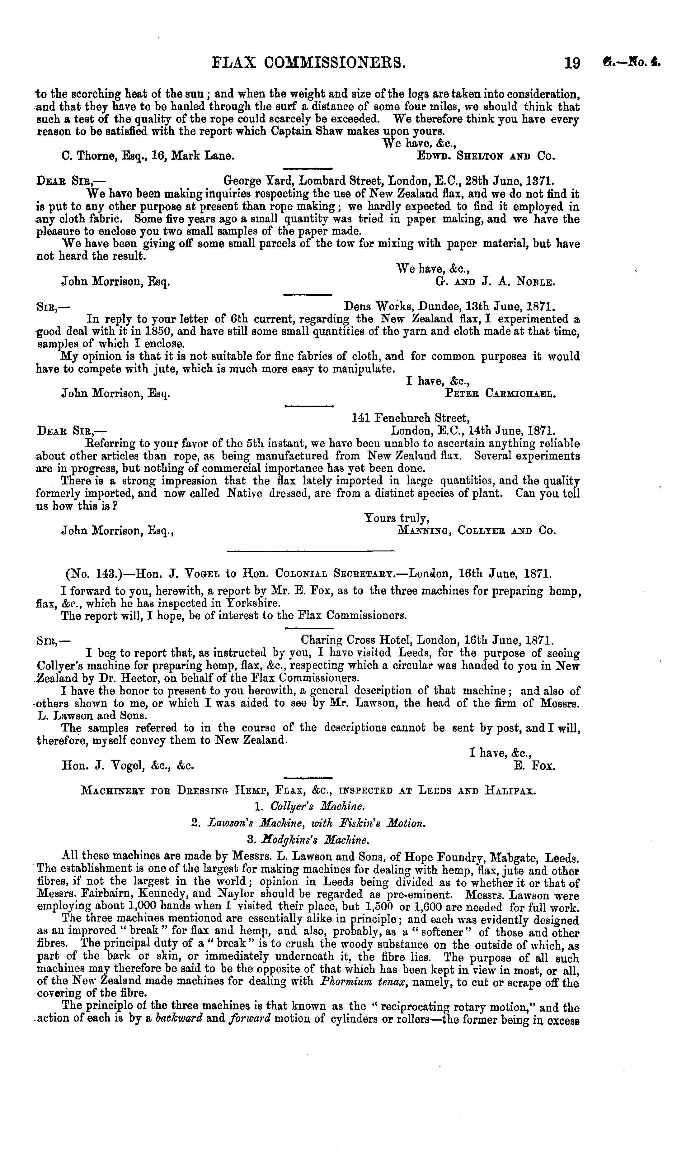 to the scorching heat of the sun; and when the weight and size of the logs are taken into consideration, and that they have to be hauled through the surf a distance of some four miles, we should think that such a test of the quality of the rope could scarcely be exceeded. We therefore think you have every reason to be satisfied with the report which Captain Shaw makes upon yours. We have, &c, C. Thorne, Esq., 16, Mark Lane. Edwd. Shelton and Co. Deab Sib, — George Yard, Lombard Street, London, E.C., 28th June, 1371. We have been making inquiries respecting the use of New Zealand flax, and we do not find it is put to any other purpose at present than rope making ; we hardly expected to find it employed in any cloth fabric. Some five years ago a small quantity was tried in paper making, and we have the pleasure to enclose you two small samples of the paper made. We have been giving off some small parcels of the tow for mixing with paper material, but have not heard the result. We have, &c., John Morrison, Esq. G. and J. A. Noble. Sie, — Dens Works, Dundee, 13th June, 1871. In reply to your letter of 6th current, regarding the New Zealand flax, I experimented a good deal with it in 1850, and have still some small quantities of the yarn and cloth made at that time, samples of which I enclose. My opinion is that it is not suitable for fine fabrics of cloth, and for common purposes it would have to compete with jute, which is much more easy to manipulate. I have, &c, John Morrison, Esq. Peteb Cabmichael. 141 Fenchurch Street, Deae Sib, — London, E.C., 14th June, 1871. Referring to your favor of the sth instant, we have been unable to ascertain anything reliable about other articles than rope, as being manufactured from New Zealand flax. Several experiments are in progress, but nothing of commercial importance has yet been done. There is a strong impression that the flax lately imported in large quantities, and the quality formerly imported, and now called Native dressed, are from a distinct species of plant. Can you tell us how this is ? Yours truly, John Morrison, Esq., Manning, Collteb and Co. (No. 143.) —Hon. J. Vogel to Hon. Colonial Seceetaet. —London, 16th June, 1871. I forward to you, herewith, a report by Mr. E. Fox, as to the three machines for preparing hemp, flax, &c, which he has inspected in Yorkshire. The report will, I hope, be of interest to the Flax Commissioners. Sie, — Charing Cross Hotel, London, 16th June, 1871. I beg to report that, as instructed by you, I have visited Leeds, for the purpose of seeing Collyer's machine for preparing hemp, flax, &c, respecting which a circular was handed to you in New Zealand by Dr. Hector, on behalf of the Flax Commissioners. I have the honor to present to you herewith, a general description of that machine ; and also of others shown to me, or which I was aided to see by Mr. Lawson, the head of the firm of Messrs. L. Lawson and Sons. The samples referred to in the course of the descriptions cannot be sent by post, and I will, therefore, myself convey them to New Zealand. I have, &c., Hon. J. Vogel, &c, &c. E. Fox. Machinery eoe Deessing Hemp, Flax, &c, inspected at Leeds and Halifax. 1. Collyer's Machine. 2. Lawson's Machine, with Fis7cin's Motion. 3. Sodyhins's Machine. All these machines are made by Messrs. L. Lawson and Sons, of Hope Foundry, Mabgate, Leeds. The establishment is one of the largest for making machines for dealing with hemp, flax, jute and other fibres, if not the largest in the world ; opinion in Leeds being divided as to whether it or that of Messrs. Fairbairn, Kennedy, and Naylor should be regarded as pre-eminent. Messrs. Lawson were employing about 1,000 hands when I visited their place, but 1,500 or 1,600 are needed for full work. The three machines mentioned are essentially alike in principle ; and each was evidently designed as an improved " break " for flax and hemp, and also, probably, as a "softener" of those and other fibres. The principal duty of a " break" is to crush the woody substance on the outside of which, as part of the bark or skin, or immediately underneath it, the fibre lies. The purpose of all such machines may therefore be said to be the opposite of that which has been kept in view in most, or all, of the New Zealand made machines for dealing with Phormium tenax, namely, to cut or scrape off the covering of the fibre. The principle of the three machines is that known as the " reciprocating rotary motion," and the action of each is by a backward and forward motion of cylinders or rollers —the former being in excess