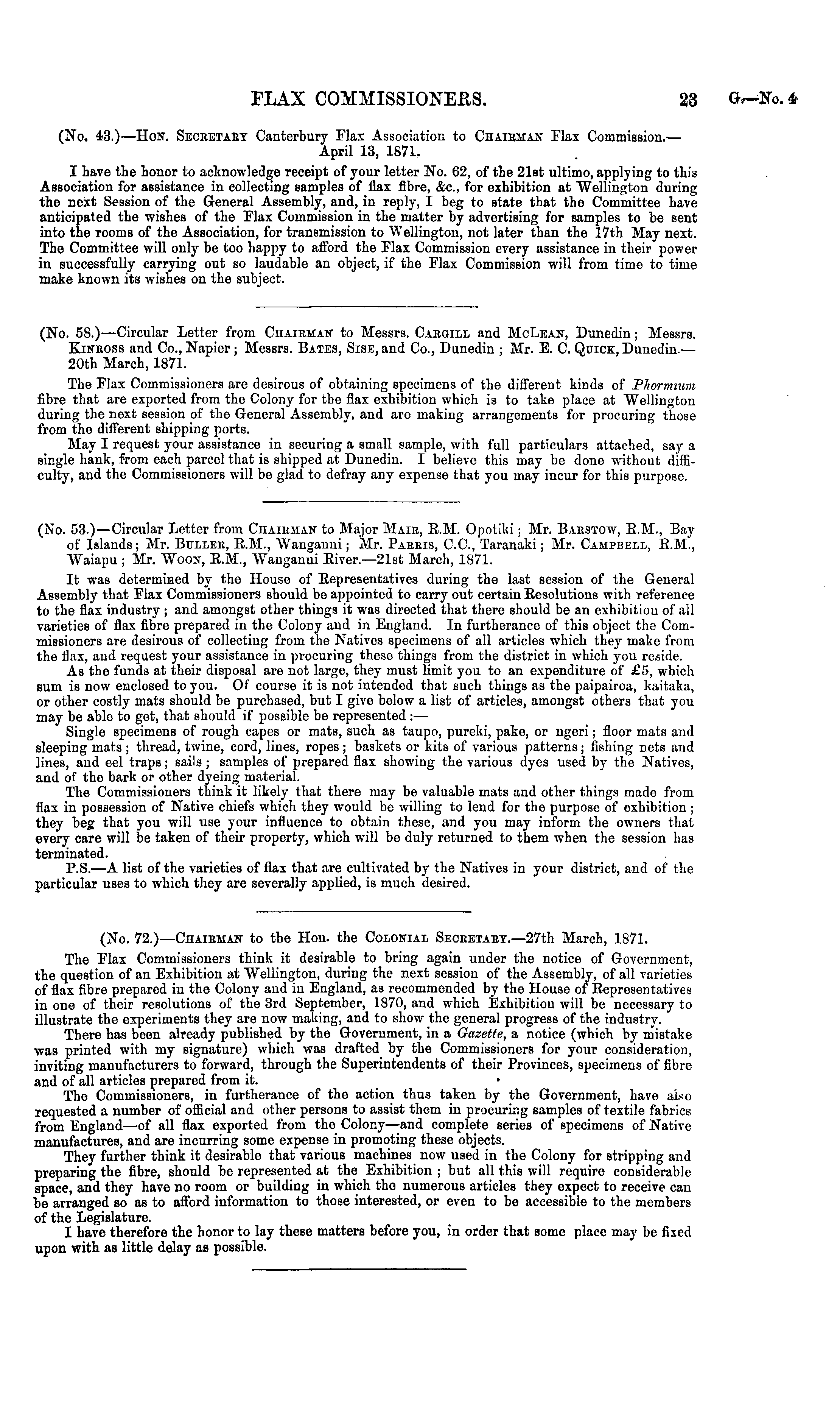 (No. 72.) —Chaieman to the Hon. the Colonial Seceetaet.—27th March, 1871. The Flax Commissioners think it desirable to bring again under the notice of Government, the question of an Exhibition at Wellington, during the next session of the Assembly, of all varieties of flax fibro prepared in the Colony and in England, as recommended by the House of Representatives in one of their resolutions of the 3rd September, 1870, and which Exhibition will be necessary to illustrate the experiments they are now making, and to show the general progress of the industry. There has been already published by the Government, in a Gazette, a notice (which by mistake was printed with my signature) which was drafted by the Commissioners for your consideration, inviting manufacturers to forward, through the Superintendents of their Provinces, specimens of fibre and of all articles prepared from it. The Commissioners, in furtherance of the action thus taken by the Government, have also requested a number of official and other persons to assist them in procuring samples of textile fabrics from England —of all flax exported from the Colony —and complete series of specimens of Native manufactures, and are incurring some expense in promoting these objects. They further think it desirable that various machines now used in the Colony for stripping and preparing the fibre, should be represented at the Exhibition ; but all this will require considerable space, and they have no room or building in which the numerous articles they expect to receive can be arranged so as to afford information to those interested, or even to be accessible to the members of the Legislature. I have therefore the honor to lay these matters before you, in order that some place may be fixed upon with as little delay as possible.