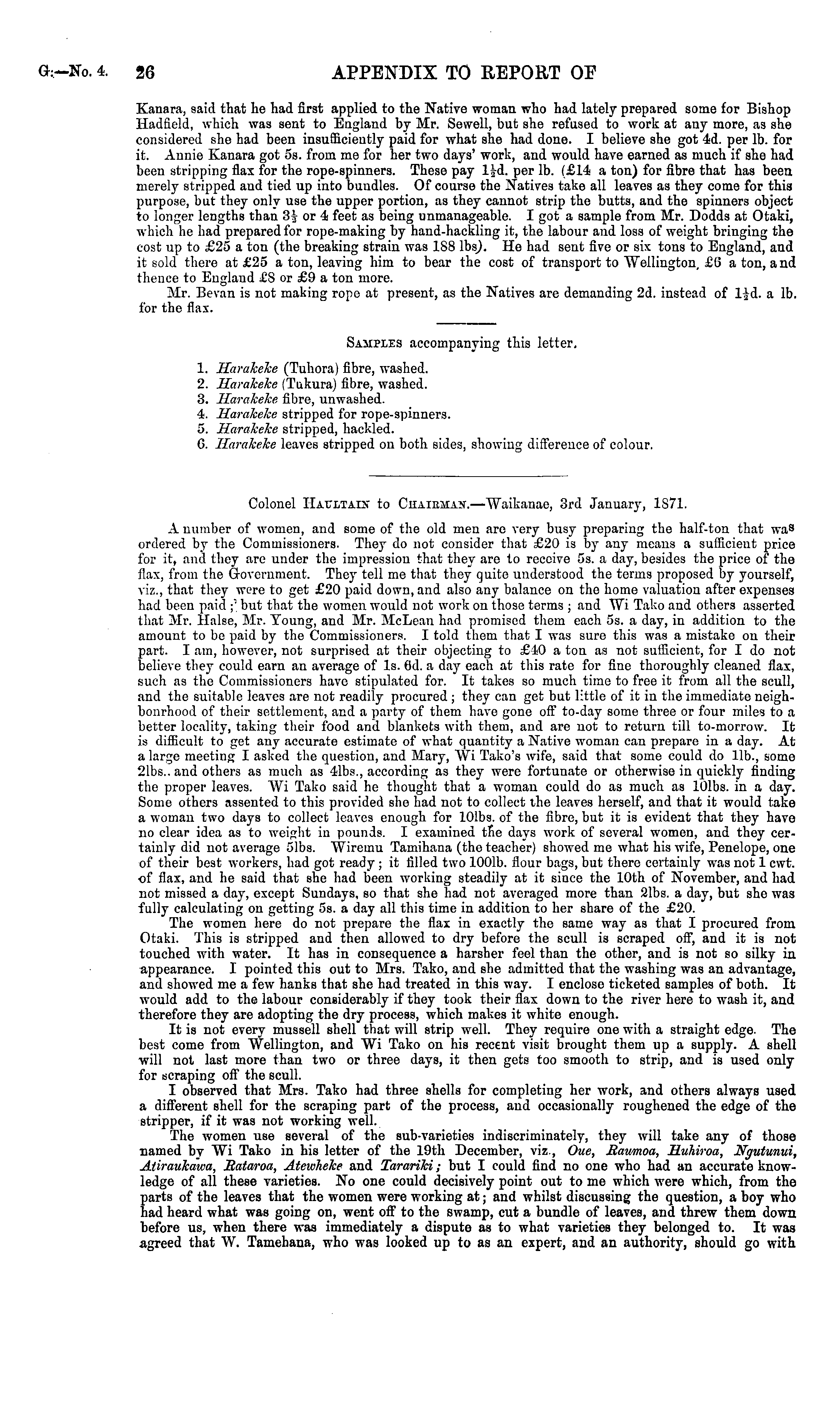 Colonel Haultain to Chaieman.—Waikanae, 3rd January, IS7I. A number of women, and some of the old men are very busy preparing the half-ton that was ordered by the Commissioners. They do not consider that £20 is by any means a sufficient price for it, and they are under the impression that they are to receive ss. a day, besides the price of the flax, from the Government. They tell me that they quite understood the terms proposed by yourself, viz., that they were to get £20 paid down, and also any balance on the home valuation after expenses had been paid ;' but that the women would not work on those terms ; and Wi Tako and others asserted that Mr. Halse, Mr. Young, and Mr. McLean had promised them each ss. a day, in addition to the amount to be paid by the Commissioners. I told them that I was sure this was a mistake ou their part. I am, however, not surprised at their objecting to £40 a ton as not sufficient, for I do not believe they could earn an average of Is. fld. a day each at this rate for fine thoroughly cleaned flax, such as the Commissioners have stipulated for. It takes so much time to free it from all the scull, and the suitable leaves are not readily procured ; they can get but little of it in the immediate neighbourhood of their settlement, and a party of them have gone off to-day some three or four miles to a better locality, taking their food and blankets with them, and are not to return till to-morrow. It is difficult to got any accurate estimate of what quantity a Native woman can prepare in a day. At a large meeting I asked the question, and Mary, Wi Tako's wife, said that some could do lib., some 21bs.. and others as much as 41bs., according as they were fortunate or otherwise in quickly finding the proper leaves. Wi Tako said he thought that a woman could do as much as lOlbs. in a day. Some others assented to this provided she had not to collect the leaves herself, and that it would take a woman two days to collect leaves enough for lOlbs. of the fibre, but it is evident that they have no clear idea as to weight in pounds. I examined the days work of several women, and they certainly did not average 51bs. Wiremu Tamihana (the teacher) showed me what his wife, Penelope, one of their best workers, had got ready ; it filled two 1001b. flour bags, but there certainly was not 1 cwt. of flax, and he said that she had been working steadily at it since the 10th of November, and had not missed a day, except Sundays, so that she had not averaged more than 21bs. a day, but she was fully calculating on getting ss. a day all this time in addition to her share of the £20. The women here do not prepare the flax in exactly the same way as that I procured from Otaki. This is stripped and then allowed to dry before the scull is scraped off, and it is not touched with water. It has in consequence a harsher feel than the other, and is not so silky in appearance. I pointed this out to Mrs. Tako, and she admitted that the washing was an advantage, and showed me a few hanks that she had treated in this way. I enclose ticketed samples of both. It would add to the labour considerably if they took their flax down to the river here to wash it, and therefore they are adopting the dry process, which makes it white enough. It is not every mussell shell that will strip well. They require one with a straight edge. The best come from Wellington, and Wi Tako on his recent visit brought them up a supply. A shell will not last more than two or three days, it then gets too smooth to strip, and is used only for scraping off the scull. I observed that Mrs. Tako had three shells for completing her work, and others always used a different shell for the scraping part of the process, aud occasionally roughened the edge of the stripper, if it was not working well. The women use several of the sub-varieties indiscriminately, they will take any of those named by Wi Tako in his letter of the 19th December, viz., Que, Raumoa, Suhiroa, Ngutunui, Atiraukaica, Pataroa, Atewheke and Tarariki; but I could find no one who had an accurate knowledge of all these varieties. No one could decisively point out to me which were which, from the parts of the leaves that the women were working at; and whilst discussing the question, a boy who had heard what was going on, went off to the swamp, cut a bundle of leaves, and threw them down before us, when there was immediately a dispute as to what varieties they belonged to. It was agreed that W. Tamehana, who was looked up to as an expert, and an authority, should go with