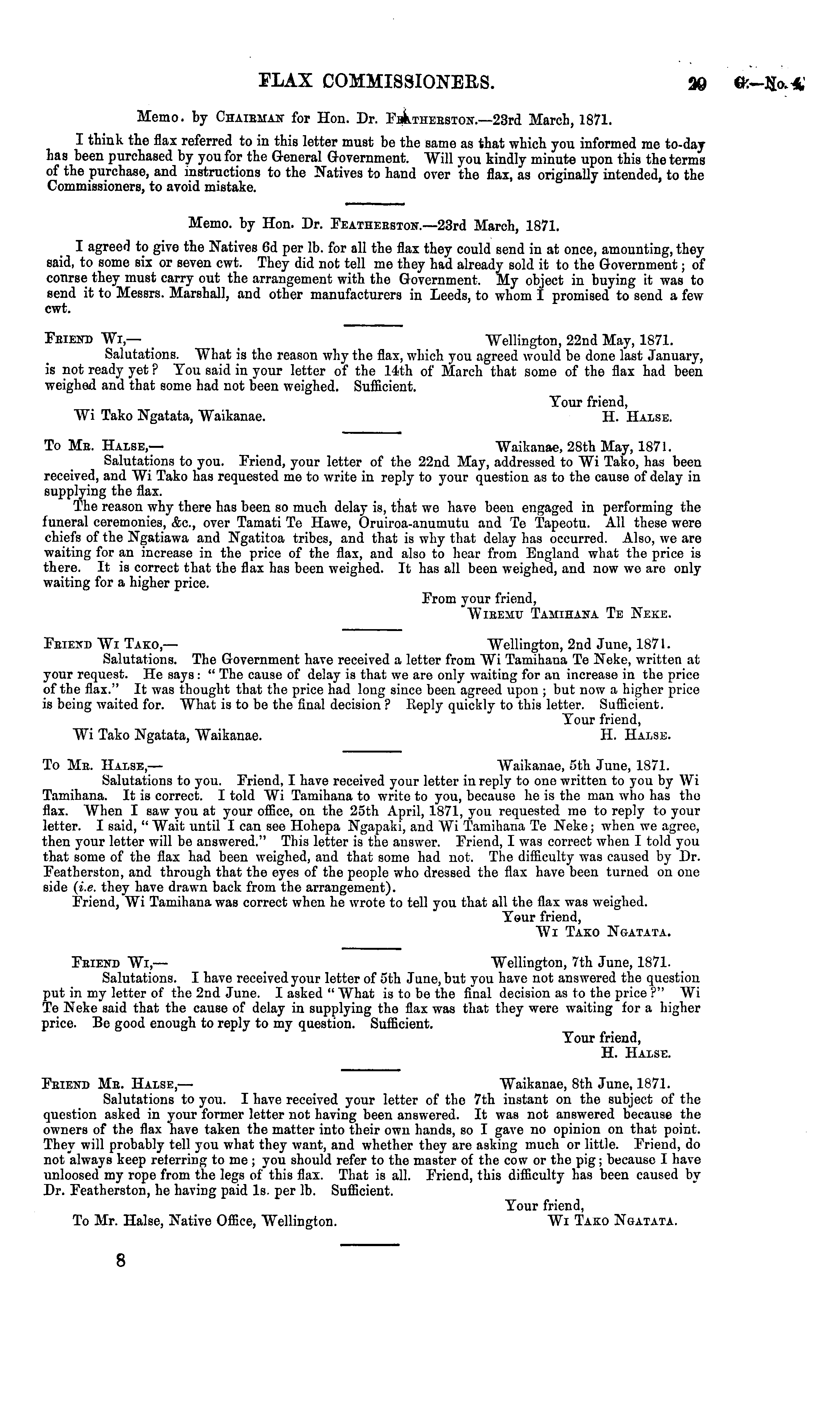 Memo, by Chaieman for Hon. Dr. FAthebston.—23rd March, 1871. I think the flax referred to in this letter must be the same as that which you informed me to-day has been purchased by you for the General Government. Will you kindly minute upon this the terms of the purchase, and instructions to the Natives to hand over the flax, as originally intended, to the Commissioners, to avoid mistake. Memo, by Hon. Dr. Featheeston.—23rd March, 1871. I agreed to give the Natives 6d per lb. for all the flax they could send in at once, amounting, they said, to some six or seven cwt. They did not tell me they had already sold it to the Government; of course they must carry out the arrangement with the Government. My object in buying it was to send it to Messrs. Marshall, and other manufacturers in Leeds, to whom I promised to send a few cwt. Feiend Wi,— _ Wellington, 22nd May, 1871. Salutations. What is tho reason why the flax, which you agreed would be done last January, is not ready yet ? You said in your letter of the 14th of March that some of the flax had been weighed and that some had not been weighed. Sufficient. Your friend, Wi Tako Ngatata, Waikanae. H. Halse. To Me. Halse,— Waikanae, 28th May, 1871. Salutations to you. Friend, your letter of the 22nd May, addressed to Wi Tako, has been received, and Wi Tako has requested me to write in reply to your question as to the cause of delay in supplying the flax. The reason why there has been so much delay is, that we have been engaged in performing the funeral ceremonies, &c, over Tamati Te Hawe, Oruiroa-anumutu and Te Tapeotu. All these were chiefs of the Ngatiawa and Ngatitoa tribes, and that is why that delay has occurred. Also, we are waiting for an increase in the price of the flax, and also to hear from England what the price is there. It is correct that the flax has been weighed. It has all been weighed, and now we are only waiting for a higher price. From your friend, Wieemu Tamihana Te Neke. Feiend Wi Tako,— Wellington, 2nd June, 1871. Salutations. The Government have received a letter from Wi Tamihana Te Neke, written at your request. He says: " The cause of delay is that we are only waiting for an increase in the price of the flax." It was thought that the price had long since been agreed upon ; but now a higher price is being waited for. What is to be the final decision ? Reply quickly to this letter. Sufficient. Your friend, Wi Tako Ngatata, Waikanae. H. Halse. To Me. Halse, — Waikanae, sth June, 1871. Salutations to you. Friend, I have received your letter in reply to one written to you by Wi Tamihana. It is correct. I told Wi Tamihana to write to you, because he is the man who has the flax. When I saw you at your office, on the 25th April, 1871, you requested me to reply to your letter. I said, " Wait until I can see Hohepa Ngapaki, and Wi Tamihana Te Neke; when we agree, then your letter will be answered." This letter is the answer. Friend, I was correct when I told you that some of the flax had been weighed, and that some had not. The difficulty was caused by Dr. Featherston, and through that the eyes of the people who dressed the flax have been turned on one side (i.e. they have drawn back from the arrangement). Friend, Wi Tamihana was correct when he wrote to tell you that all the flax was weighed. Your friend, Wi Tako Ngatata. Feiend Wi— Wellington, 7th June, 1871. Salutations. I have received your letter of sth June, but you have not answered the question put in my letter of the 2nd June. I asked " What is to be the final decision as to the price ?" Wi Te Neke said that the cause of delay in supplying the flax was that they were waiting for a higher price. Be good enough to reply to my question. Sufficient. Your friend, H. Halse. Feiend Mb. Halse, — Waikanae, Bth June, 1871. Salutations to you. I have received your letter of the 7th instant on the subject of the question asked in your former letter not having been answered. It was not answered because the owners of the flax have taken the matter into their own hands, so I gave no opinion on that point. They will probably tell you what they want, and whether they are asking much or little. Friend, do not always keep referring to me ; you should refer to the master of the cow or the pig; because I have unloosed my rope from the legs of this flax. That is all. Friend, this difficulty has been caused by Dr. Featherston, he having paid Is. per lb. Sufficient. Your friend, To Mr. Halse, Native Office, Wellington. Wi Tako Ngatata. 8