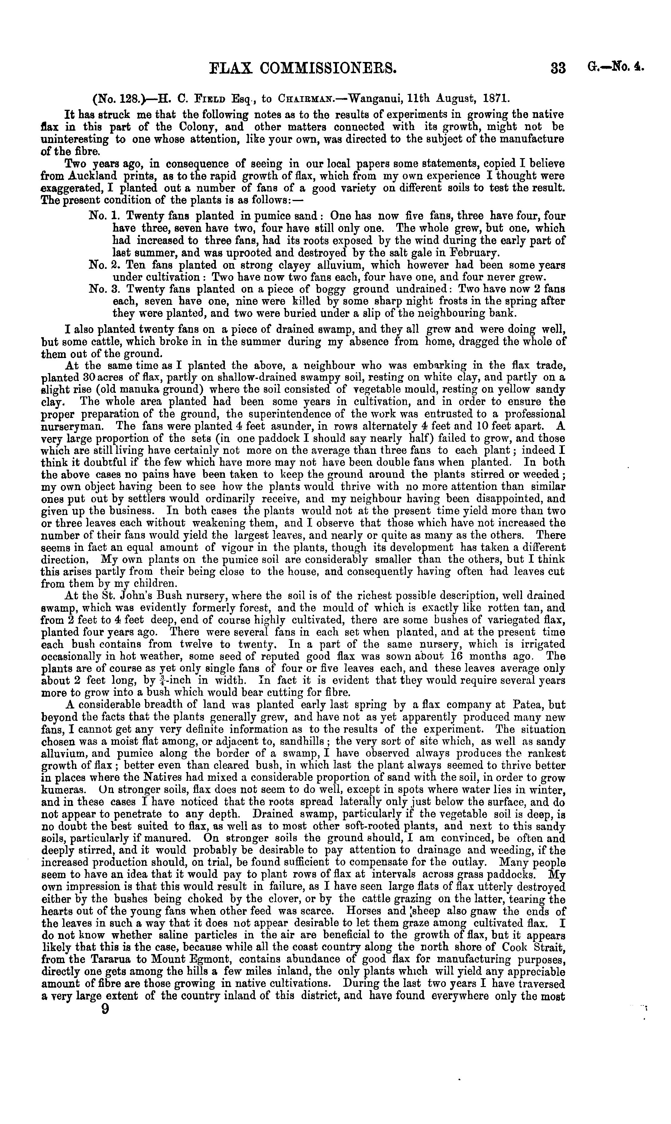 (No. 128.) —H. C. Field Esq, to Chaieman.—Wanganui, 11th August, 1871. It has struck me that the following notes as to the results of experiments in growing the native flax in this part of the Colony, and other matters connected with its growth, might not be uninteresting to one whose attention, like your own, was directed to the subject of the manufacture of the fibre. Two years ago, in consequence of seeing in our local papers some statements, copied I believe from Auckland prints, as to the rapid growth of flax, which from my own experience I thought were exaggerated, I planted out a number of fans of a good variety on different soils to test the result. The present condition of the plants is as follows: — No. 1. Twenty fans planted in pumice sand : One has now five fans, three have four, four have three, seven have two, four have still only one. The whole grew, but one, which had increased to three fans, had its roots exposed by the wind during the early part of last summer, and was uprooted and destroyed by the salt gale in February. No. 2. Ten fans planted on strong clayey alluvium, which however had been some year3 under cultivation : Two have now two fans each, four have one, and four never grew. No. 3. Twenty fans planted on a piece of boggy ground undrained: Two have now 2 fans each, seven have one, nine were killed by some sharp night frosts in the spring after they were planted, and two were buried under a slip of the neighbouring bank. I also planted twenty fans on a piece of drained swamp, and they all grew and were doing well, but some cattle, which broke in in the summer during my absence from home, dragged the whole of them out of the ground. At the same time as I planted the above, a neighbour who was embarking in the flax trade, planted 30 acres of flax, partly on shallow-drained swampy soil, resting on white clay, and partly on a slight rise (old manuka ground) where the soil consisted of vegetable mould, resting on yellow sandy clay. The whole area planted had been some years in cultivation, and in order to ensure the proper preparation of the ground, the superintendence of the work was entrusted to a professional nurseryman. The fans were planted 4 feet asunder, in rows alternately 4 feet and 10 feet apart. A very large proportion of the sets (in one paddock I should say nearly half) failed to grow, and those which are still living have certainly not more on the average than three fans to each plant; indeed I think it doubtful if the few which have more may not have been double fans when planted. In both the above cases no pains have been taken to keep the ground around the plants stirred or weeded ; my own object having been to see how the plants would thrive with no more attention than similar ones put out by settlers would ordinarily receive, and my neighbour having been disappointed, and given up the business. In both cases the plants would not at the present time yield more than two or three leaves each without weakening them, and I observe that those which have not increased the number of their fans would yield the largest leaves, and nearly or quite as many as the others. There seems in fact an equal amount of vigour in tho plants, though its development has taken a different direction, My own plants on the pumice soil are considerably smaller than the others, but I think this arises partly from their being close to the house, and consequently having often had leaves cut from them by my children. At the St. John's Bush nursery, where the soil is of the richest possible description, well drained swamp, which was evidently formerly forest, and the mould of which is exactly like rotten tan, and from 2 feet to 4 feet deep, end of course highly cultivated, there are some bushes of variegated flax, planted four years ago. There were several fans in each set when planted, and at the present time each bush contains from twelve to twenty. In a part of the same nursery, which is irrigated occasionally in hot weather, some seed of reputed good flax was sown about 16 months ago. The plants are of course as yet only single fans of four or five leaves each, and these leaves average only about 2 feet long, by f-inch in width. In fact it is evident that they would require several years more to grow into a bush which would bear cutting for fibre. A considerable breadth of land was planted early last spring by a flax company at Patea, but beyond the facts that the plants generally grew, and have not as yet apparently produced many new fans, I cannot get any very definite information as to the results of the experiment. The situation chosen was a moist flat among, or adjacent to, sandhills ; the very sort of site which, as well as sandy alluvium, and pumice along the border of a swamp, I have observed always produces the rankest growth of flax ; better even than cleared bush, in which last the plant always seemed to thrive better in places where the Natives had mixed a considerable proportion of sand with the soil, in order to grow kumeras. On stronger soils, flax does not seem to do well, except in spots where water lies in winter, and in these cases I have noticed that the roots spread laterally only just below the surface, and do not appear to penetrate to any depth. Drained swamp, particularly if the vegetable soil is deep, is no doubt the best suited to flax, as well as to most other soft-rooted plants, and next to this sandy soils, particularly if manured. On stronger soils the ground should, I am convinced, be often and deeply stirred, and it would probably be desirable to pay attention to drainage and weeding, if the increased production should, on trial, be found sufficient to compensate for the outlay. Many people seem to have an idea that it would pay to plant rows of flax at intervals across grass paddocks. My own impression is that this would result in failure, as I have seen large flats of fiax utterly destroyed either by the bushes being choked by the clove
