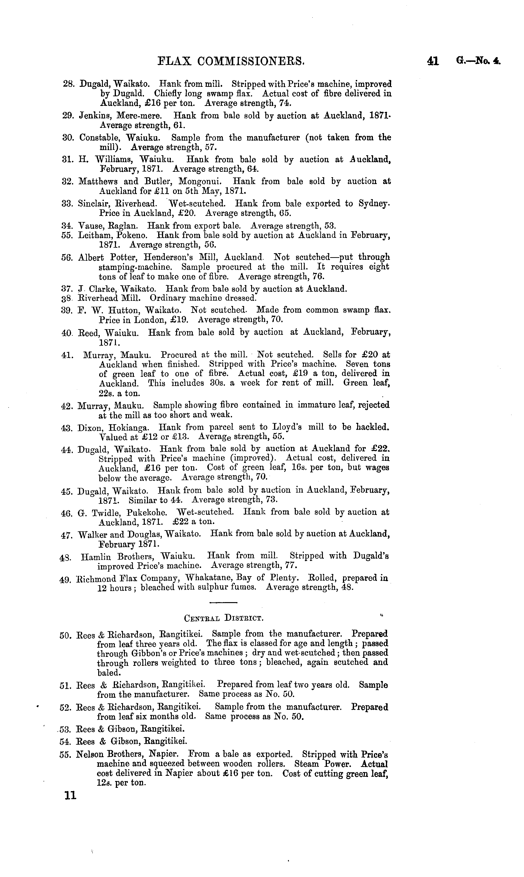 28. Dugald, Waikato. Hank from mill. Stripped with Price's machine, improved by Dugald. Chiefly long swamp flax. Actual cost of fibre delivered in Auckland, £16 per ton. Average strength, 74. 29. Jenkins, Mere-mere. Hank from bale sold by auction at Auckland, 1871Average strength, 61. 30. Constable, Waiuku. Sample from the manufacturer (not taken from the mill). Average strength, 57. 31. H. Williams, Waiuku. Hank from bale sold by auction at Auckland, February, 1871. Average strength, 64. 32. Matthews and Butler, Mongonui. Hank from bale sold by auction at Auckland for £11 on sth May, 1871. 33. Sinclair, Riverhead. Wet-scutched. Hank from bale exported to SydneyPrice in Auckland, £20. Average strength, 65. 34. Vause, Raglan. Hank from export bale. Average strength, 53. 55. Leitham, Pokeno. Hank from bale sold by auction at Auckland in February, 1871. Average strength, 56. 56. Albert Potter, Henderson's Mill, Auckland. Not scutched —put through stamping-machine. Sample procured at the mill. It requires eight tons of leaf to make one of fibre. Average strength, 76. 37. J Clarice, Waikato. Hank from bale sold by auction at Auckland. 38. Riverhead Mill. Ordinary machine dressed. 39. F. W. Hutton, Waikato. Not scutched. Made from common swamp flax. Price in London, £19. Average strength, 70. 40. Reed, Waiuku. Hank from bale sold by auction at Auckland, February, 1871. 41. Murray, Mauku. Procured at the mill. Not scutched. Sells for £20 at Auckland when finished. Stripped with Price's machine. Seven tons of green leaf to one of fibre. Actual cost, £19 a ton, delivered in Auckland. This includes 30s. a week for rent of mill. Green leaf, 225. a ton. 42. Murray, Mauku. Sample showing fibre contained in immature leaf, rejected at the mill as too short and weak. 43. Dixon, Hokianga. Hank from parcel sent to Lloyd's mill to be hackled. Valued at £12 or £13. Average strength, 55. 44. Dugald, Waikato. Hank from bale sold by auction at Auckland for £22. Stripped with Price's machine (improved). Actual cost, delivered in Auckland, £16 per ton. Cost of green leaf, 16s. per ton, but wages below the average. Average strength, 70. 45. Dugald, Waikato. Hank from bale sold by auction in Auckland, February, ° 1871. Similar to 44. Average strength, 73. 46 G. Twidle, Pukekohe. Wet-scutched. Hank from bale sold by auction at Auckland, 1871. £22 a ton. 47. Walker and Douglas, Waikato. Hank from bale sold by auction at Auckland, February 1871. 4S. Hamlin Brothers, Waiuku. Hank from mill. Stripped with Dugald's improved Price's machine. Average strength, 77. 49. Richmond Flax Company, Whakatane, Bay of Plenty. Rolled, prepared in 12 hours ; bleached with sulphur fumes. Average strength, 48. Centeal Disteict. 50. Eees & Richardson, Rangitikei. Sample from the manufacturer. Prepared from leaf three years old. The flax is classed for age and length ; passed through Gibbon's or Price's machines ; dry and wet-scutched ; then passed through rollers weighted to three tons ; bleached, again scutched and baled. 51. Rees & Richardson, Rangitikei. Prepared from leaf two years old. Sample from the manufacturer. Same process as No. 50. 52. Rees & Richardson, Rangitikei. Sample from the manufacturer. Prepared from leaf six months old. Same process as No. 50. 53. Rees & Gibson, Rangitikei. 54. Rees & Gibson, Rangitikei. 55. Nelson Brothers, Napier. From a bale as exported. Stripped with Price's machine and squeezed between wooden rollers. Steam Power. Actual cost delivered in Napier about £16 per ton. Cost of cutting green leaf, 12s. per ton. 11