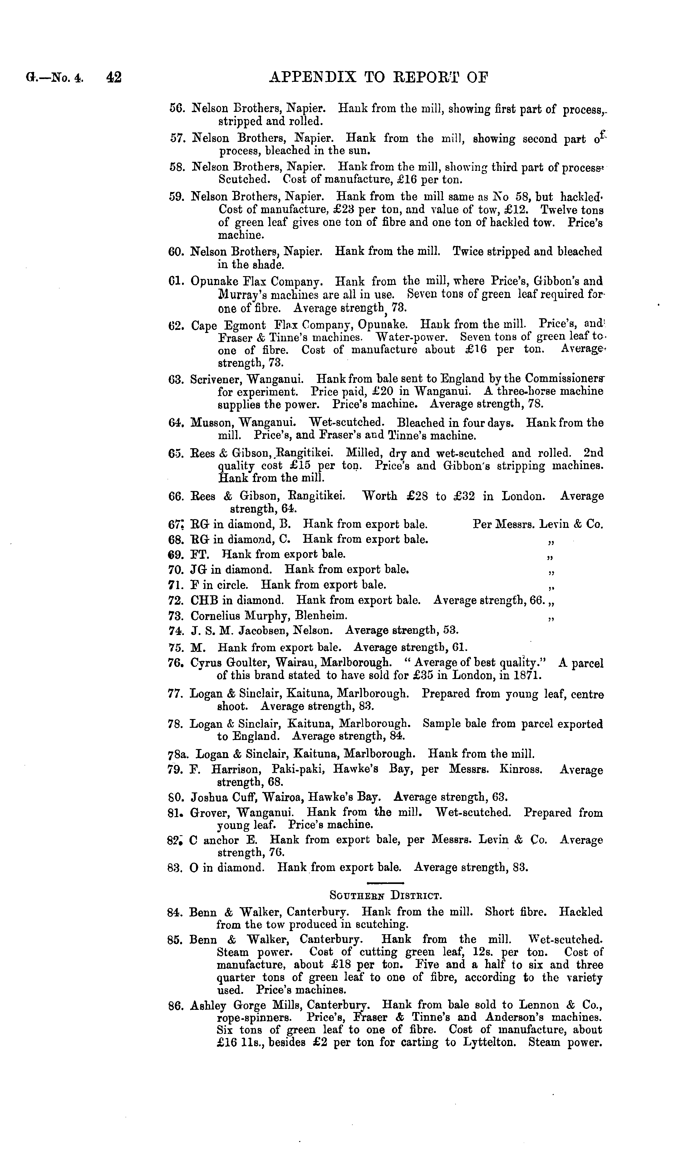 56. Nelson Brothers, Napier. Hank from the mill, showing first part of process,stripped and rolled. 57. Nelson Brothers, Napier. Hank from the mill, showing second part o process, bleached in the sun. 58. Nelson Brothers, Napier. Hank from the mill, showing third part of process* Scutched. Cost of manufacture, £16 per ton. 59. Nelson Brothers, Napier. Hank from the mill same as No 58, but hackledCost of manufacture, £23 per ton, and value of tow, £12. Twelve tons of green leaf gives one ton of fibre and one ton of hackled tow. Price's machine. 60. Nelson Brothers, Napier. Hank from the mill. Twice stripped and bleached in the shade. CI. Opunake Flax Company. Hank from the mill, where Price's, Gibbon's and Murray's machines are all in use. Seven tons of green leaf required forone of fibre. Average strength 73. 62. Cape Egmont Flax Company, Opunake. Hank from the mill. Price's, and: Fraser & Tinne's machines. Water-power. Seven tons of green leaf to • one of fibre. Cost of manufacture about £16 per ton. Averagestrength, 73. 63. Scrivener, Wanganui. Hank from bale sent to England by the Commissioners for experiment. Price paid, £20 in Wanganui. A three-horse machine supplies the power. Price's machine. Average strength, 7S. 64. Musson, Wanganui. Wet-scutched. Bleached in four days. Hank from the mill. Price's, and Fraser's and Tinne's machine. 65. Rees & Gibson, Rangitikei. Milled, dry and wet-scutched and rolled. 2nd quality cost £15 per ton. Price's and Gibbon's stripping machines. Hank from the mill. 66. Rees & Gibson, Rangitikei. Worth £28 to £32 in London. Average strength, 64. 67? RG in diamond, B. Hank from export bale. Per Messrs. Levin & Co. 68. RG in diamond, C. Hank from export bale. „ 69. FT. Hank from export bale. „ 70. JG in diamond. Hank from export bale. „ 71. Fin circle. Hank from export bale. ~ 72. CHB in diamond. Hank from export bale. Average strength, 66. „ 73. Cornelius Murphy, Blenheim. „ 74. J. S. M. Jacobsen, Nelson. Average strength, 53. 75. M. Hank from export bale. Average strength, 61. 76. Cyrus Goulter, Wairau, Marlborough. " Average of best quality." A parcel of this brand stated to have sold for £35 in London, in 1871. 77. Logan & Sinclair, Kaituna, Marlborough. Prepared from young leaf, centre shoot. Average strength, 83. 78. Logan & Sinclair, Kaituna, Marlborough. Sample bale from parcel exported to England. Average strength, 84. 78a. Logan & Sinclair, Kaituna, Marlborough. Hank from the mill. 79. F. Harrison, Paki-paki, Hawke's Bay, per Messrs. Kinross. Average strength, 68. 80. Joshua Cuff, Wairoa, Hawke's Bay. Average strength, 63. 81. Grover, Wanganui. Hank from the mill. Wet-scutched. Prepared from young leaf. Price's machine. 82. C anchor E. Hank from export bale, per Messrs. Levin & Co. Average strength, 76. 83. oin diamond. Hank from export bale. Average strength, S3. SOL'THEBN DISTEICT. 84. Benn & Walker, Canterbury. Hank from the mil! Short fibre. Hackled from the tow produced in scutching. 85. Benn & Walker, Canterbury. Hank from the mill. Wet-scutched. Steam power. Cost of cutting green leaf, 12s. per ton. Cost of manufacture, about £18 per ton. Five and a half to six and three quarter tons of green leaf to one of fibre, according to the variety used. Price's machines. 86. Ashley Gorge Mills, Canterbury. Hank from bale sold to Lennon & Co., rope-spinners. Price's, Fraser & Tinne's and Anderson's machines. Six tons of green leaf to one of fibre. Cost of manufacture, about £16 lis., besides £2 per ton for carting to Lyttelton. Steam power.