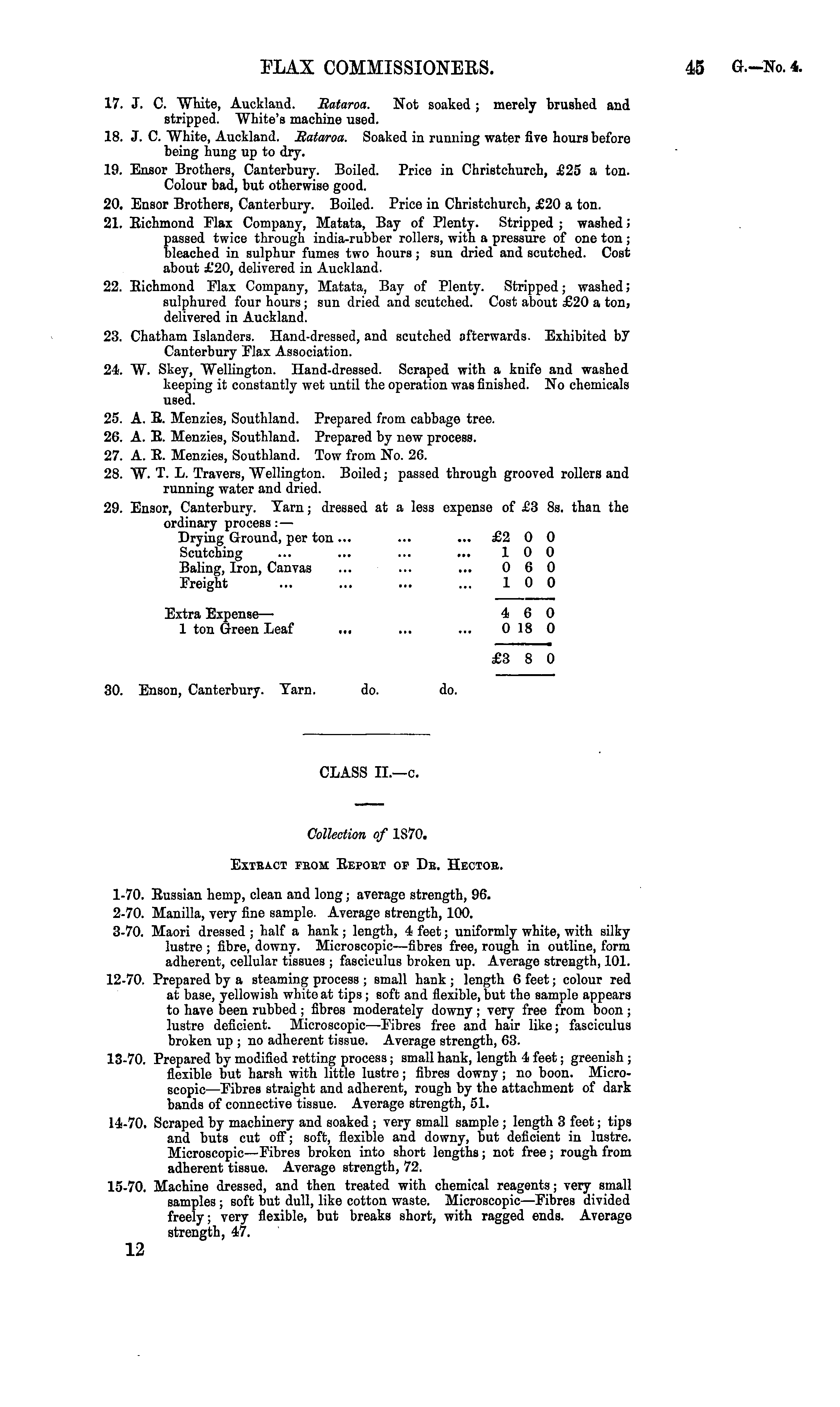 17. J. C. White, Auckland. Bataroa. Not soaked ; merely brushed and stripped. White's machine used. 18. J. C. White, Auckland. Bataroa. Soaked in running water five hours before being hung up to dry. 19. Ensor Brothers, Canterbury. Boiled. Price in Christchurch, £25 a ton. Colour bad, but otherwise good. 20. Ensor Brothers, Canterbury. Boiled. Price in Christchurch, £20 a ton. 21. Richmond Flax Company, Matata, Bay of Plenty. Stripped ; washed i passed twice through india-rubber rollers, with a pressure of one ton; bleached in sulphur fumes two hours ; sun dried and scutched. Cost about £20, delivered in Auckland. 22. Richmond Flax Company, Matata, Bay of Plenty. Stripped; washed; sulphured four hours; sun dried and scutched. Cost about £20 a ton, delivered in Auckland. 23. Chatham Islanders. Hand-dressed, and scutched afterwards. Exhibited by Canterbury Flax Association. 24. W. Skey, Wellington. Hand-dressed. Scraped with a knife and washed keeping it constantly wet until the operation was finished. No chemicals used. 25. A. E. Menzies, Southland. Prepared from cabbage tree. 26. A. R. Menzies, Southland. Prepared by new process. 27. A. R. Menzies, Southland. Tow from No. 26. 28. W. T. L. Travers, Wellington. Boiled; passed through grooved rollers and running water and dried. 29. Ensor, Canterbury. Tarn; dressed at a less expense of £3 Bs. than the ordinary process: — Drying Ground, per ton ... ... ... £2 0 0 Scutching ... ... ... ... 10 0 Baling, Iron, Canvas ... ... ... 0 6 0 Freight ... ... ... ... 10 0 Extra Expense— 4 6 0 1 ton Green Leaf ... ... ... 0 18 0 £3 8 0 30. Enson, Canterbury. Tarn. do. do. CLASS ll.—c.
