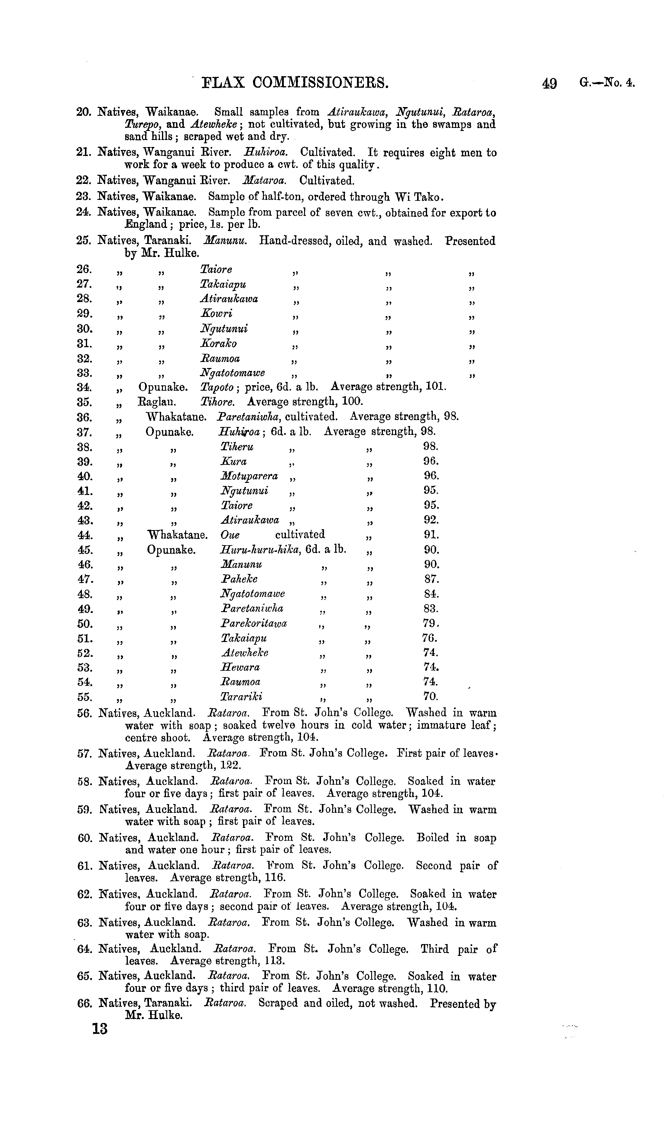 20. Natives, Waikanae. Small samples from Atiraukawa, Ngutunui, Rataroa, Turepo, and Atewheke ; not cultivated, but growing in the swamps and sand hills ; scraped wet and dry. 21. Natives, Wanganui Biver. Huldroa. Cultivated. It requires eight men to work for a week to produce a cwt. of this quality. 22. Natives, "Wanganui Eiver. Mataroa. Cultivated. 23. Natives, "Waikanae. Samplo of half-ton, ordered through Wi Tako. 24. Natives, "Waikanae. Sample from parcel of seven cwt., obtained for export to England; price, Is. per lb. 25. Natives, Taranaki. Manunu. Hand-dressed, oiled, and washed. Presented by Mr. Hulke. 26. „ „ Taiore 27. „ „ TaJcaiapu „ „ „ 28. ~ ~ Atiraukawa „ „ „ 29. „ „ Kowri „ „ „ 30. „ „ Ngutunui „ „ „ 81. „ „ KoraJco „ „ „ 32. „ „ Eaumoa „ „ „ 33. „ ~ Ngatotomawe „ „ „ 34. „ Opunake. Tapoto ; price, 6d. a lb. Average strength, 101. 35. „ Eaglau. Tihore. Average strength, 100. 36. „ "Whakatane. ParetaniwTia, cultivated. Average strength, 98. 37. „ Opunake. Huhiroa ; 6d. a lb. Average strength, 98. 38. „ „ Tiheru „ „ 98. 39. „ „ Kura „ „ 90. 40. ~ ~ Motuparera ~ „ 96. 41. „ „ Ngutunui „ „ 95. 42. „ „ Taiore „ „ 95. 43. ~ „ Atiraukawa „ „ 92. 44. „ "Whakatane. One cultivated „ 91. 45. „ Opunake. ITuru-Jiuru-hika, 6d. a lb. „ 90. 46. „ „ Manunu „ „ 90. 47. „ „ Paheke „ „ 87. 48. „ ~ Ngatotomawe ~ „ 84. 49. „ ~ Paretaniwha ~ „ 83. 50. ~ „ Parekoritawa ~ ~ 79. 51. „ „ Takaiapu „ „ 76. 52. „ „ Atewheke „ „ 74. 53. „ „ Hewara „ „ 74. 54. „ „ Raumoa „ „ 74. 55. „ „ Tarariki „ „ 70. SG. Natives, Auckland. Rataroa. Prom St. John's College. "Washed in warm water with soap ; soaked twelve hours in cold water; immature leaf; centre shoot. Average strength, 104. 57. Natives, Auckland. Rataroa. From St. John's College. First pair of leavesAverage strength, 122. 58. Natives, Auckland. Rataroa. From St. John's College. Soaked in water four or five days; first pair of leaves. Average strength, 104. 59. Natives, Auckland. Rataroa. From St. John's College. Washed in warm water with soap ; first pair of leaves. GO. Natives, Auckland. Rataroa. From St. John's College. Boiled in soap and water one hour ; first pair of leaves. 61. Natives, Auckland. Rataroa. From St. John's College. Second pair of leaves. Average strength, 116. 62. Natives, Auckland. Rataroa. From St. John's College. Soaked in water four or five days ; second pair of leaves. Average strength, 104. 63. Natives, Auckland. Rataroa. From St. John's College. "Washed in warm water with soap. 64. Natives, Auckland. Rataroa. From St. John's College. Third pair of leaves. Average strength, 113. 65. Natives, Auckland. Rataroa. From St. John's College. Soaked in water four or five days ; third pair of leaves. Average strength, 110. 66. Natives, Taranaki. Rataroa. Scraped and oiled, not washed. Presented by Mr. Hulke. 13