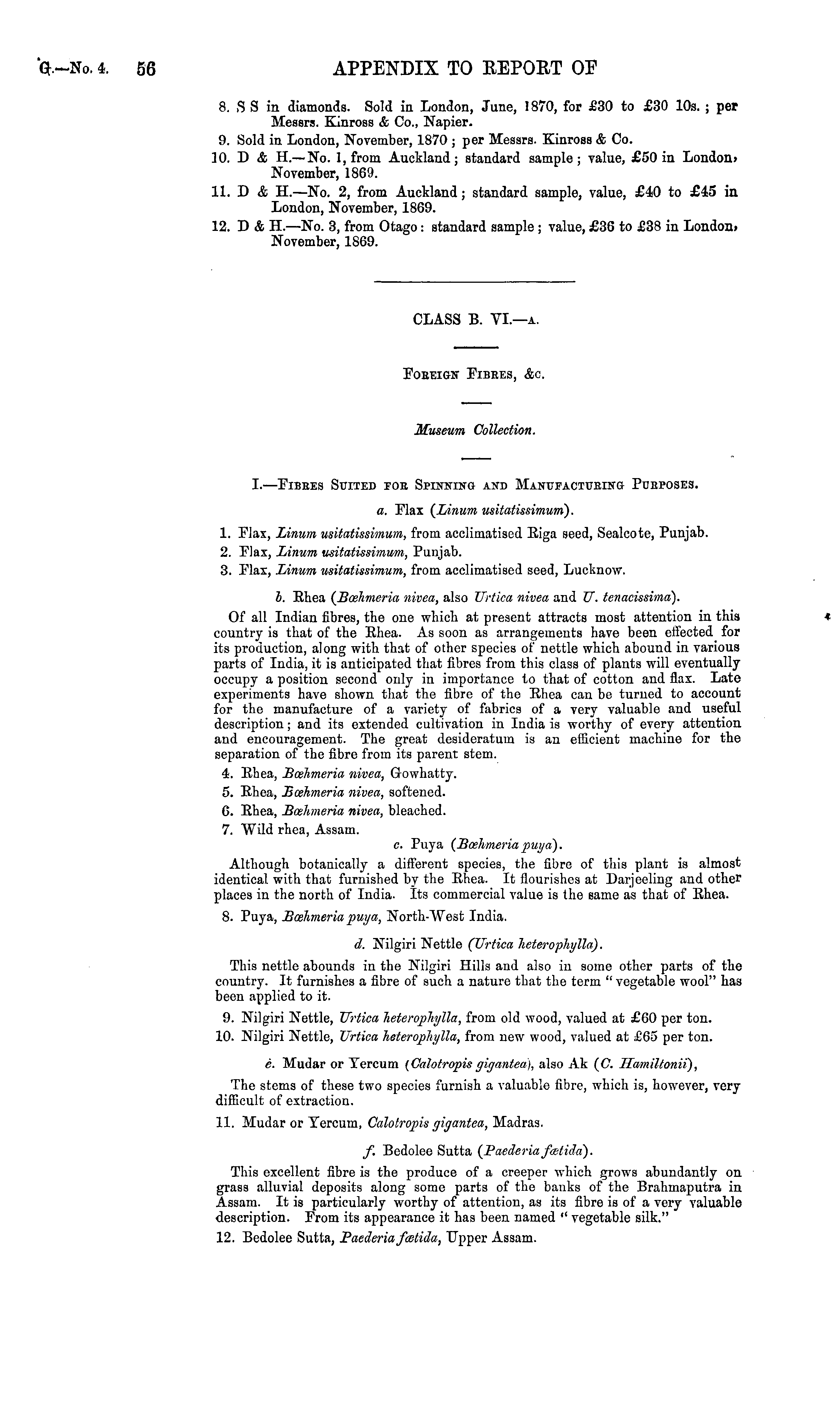 CLASS B. Vl.—a. FOEEIGN FIBEES, &C. Museum Collection. I. —Fibees Suited fob Spinning and Manufactubing Pubposes. a. Flax (Linum usitatissimum). 1. Flax, Linum usitatissimum, from acclimatised Riga seed, Sealcote, Punjab. 2. Flax, Linum usitatissimum, Punjab. 3. Flax, Linum usitatissimum, from acclimatised seed, Lucknow. b. Rhea (Beehmeria nivea, also Tfrtica nivea and TJ. tenacissimd). Of all Indian fibres, the one which at present attracts most attention in this country is that of the Rhea. As soon as arrangements have been effected for its production, along with that of other species of nettle which abound in various parts of India, it is anticipated that fibres from this class of plants will eventually occupy a position second only in importance to that of cotton and flax. Late experiments have shown that the fibre of the Rhea can be turned to account for the manufacture of a variety of fabrics of a very valuable and useful description; and its extended cultivation in India is worthy of every attention and encouragement. The great desideratum is an efficient machine for the separation of the fibre from its parent stem. 4. Rhea, Beehmeria nivea, Gowhatty. 5. Rhea, Beehmeria nivea, softened. 6. Rhea, Boehmeria nivea, bleached. 7. Wild rhea, Assam. c. Puya (Beehmeriapuya). Although botanically a different species, the fibre of this plant is almost identical with that furnished by the Rhea. It flourishes at Darjeeling and other places in the north of India. Its commercial value is the same as that of Rhea. 8. Puya, Beehmeria puya, North-West India. d. Nilgiri Nettle (TJrtica heterophylla). This nettle abounds in the Nilgiri Hills and also in some other parts of the country. It furnishes a fibre of such a nature that the term " vegetable wool" has been applied to it. 9. Nilgiri Nettle, TJrtica heterophylla, from old wood, valued at £60 per ton. 10. Nilgiri Nettle, TJrtica heterophylla, from new wood, valued at £65 per ton. e. Mudar or Tercum (Calotropis gigantea), also Ak (C Samiltonii), The stems of these two species furnish a valuable fibre, which is, however, very difficult of extraction. 11. Mudar or Tercum, Calotropis gigantea, Madras. f. Bedolee Sutta (Paederiafadidd). This excellent fibre is the produce of a creeper which grows abundantly on grass alluvial deposits along some parts of the banks of the Brahmaputra in Assam. It is particularly worthy of attention, as its fibre is of a very valuable description. From its appearance it has been named " vegetable silk." 12. Bedolee Sutta, Paederiafstida, Upper Assam.