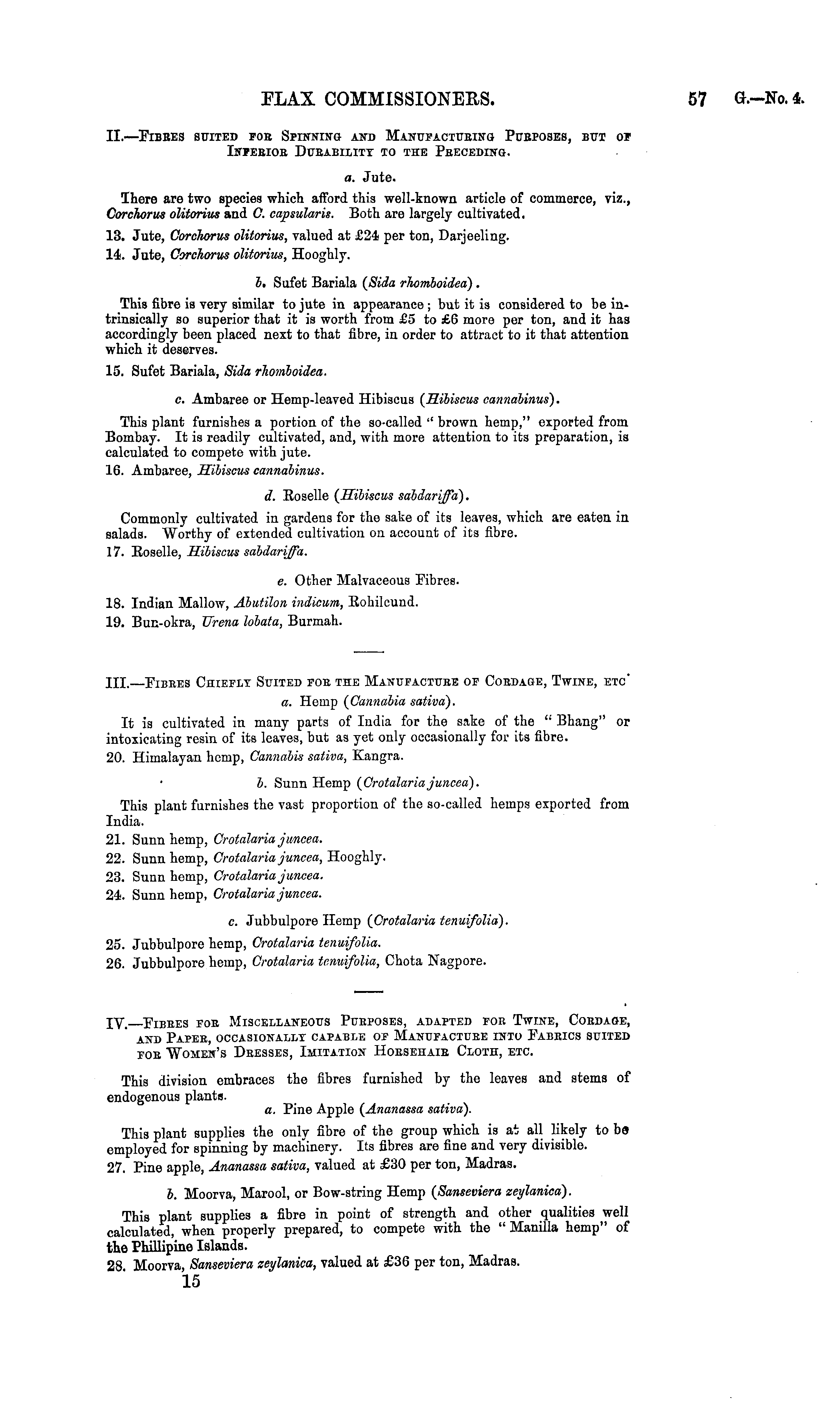 lI.—FIBBES SUITED FOB SPINNING AND MANUFACTUBING PUEPOSES, BUT 0! INFEBIOE DUEABILITY TO THE PbECEDING. a. Jute. Ihere are two species which afford this well-known article of commerce, viz., Corckorus olitorius and ft capsularis. Both are largely cultivated. 13. Jute, Corchorus olitorius, valued at £24 per ton, Darjeeling. 14. Jute, Corchorus olitorius, Hooghly. b. Sufet Bariala (Sida rhomboidea) . This fibre is very similar to jute in appearance ; but it is considered to be intrinsically so superior that it is worth from £5 to £6 more per ton, and it has accordingly been placed next to that fibre, in order to attract to it that attention which it deserves. 15. Sufet Bariala, Sida rhomboidea. c. Ambaree or Hemp-leaved Hibiscus (Hibiscus cannahinus). This plant furnishes a portion of the so-called " brown hemp," exported from Bombay. It is readily cultivated, and, with more attention to its preparation, is calculated to compete with jute. 16. Ambaree, Sibiscus cannahinus. d. Roselle (Sibiscus sabdariffa). Commonly cultivated in gardens for the sake of its leaves, which are eaten in salads. Worthy of extended cultivation on account of its fibre. 17. Roselle, Sibiscus sabdariffa. e. Other Malvaceous Fibres. 18. Indian Mallow, Ahutilon indicum, Rohilcund. 19. Bun-okra, TJrena lobata, Burmah. Hl.—Fibees Chiefly Suited fob the Manufactube of Coedage, Twine, etc' a. Hemp (Cannabia sativa). It is cultivated in many parts of India for the sake of the " Bhang" or intoxicating resin of its leaves, but as yet only occasionally for its fibre. 20. Himalayan hemp, Cannabis sativa, Kangra. b. Sunn Hemp (Crotalaria juncea). This plant furnishes the vast proportion of the so-called hemps exported from India. 21. Sunn hemp, Crotalaria juncea. 22. Sunn hemp, Crotalaria juncea, Hooghly. 23. Sunn hemp, Crotalaria juncea. 24. Sunn hemp, Crotalaria juncea. c. Jubbulpore Hemp (Crotalaria tenuifolia). 25. Jubbulpore hemp, Crotalaria tenuifolia. 26. Jubbulpore hemp, Crotalaria tenuifolia, Chota Nagpore. JY. Fibees foe Miscellaneous Pueposes, adapted foe Twine, Coedage, and Papee, occasionally capable of Manufacture into Fabeics suited foe Women's Deesses, Imitation Hoesehaie Cloth, etc. This division embraces the fibres furnished by the leaves and stems of endogenous plants. a. Pine Apple (Ananassa sativa). This plant supplies the only fibre of the group which is at all likely to be employed for spinning by machinery. Its fibres are fine and very divisible. 27. Pine apple, Ananassa sativa, valued at £30 per ton, Madras. b. Moorva, Marool, or Bow-string Hemp (Sanseviera zeylanica). This plant supplies a fibre in point of strength and other qualities well calculated, when properly prepared, to compete with the "Manilla hemp" of the Phillipine Islands. 28 Moorva, Sanseviera zeylanica, valued at £36 per ton, Madras. 15