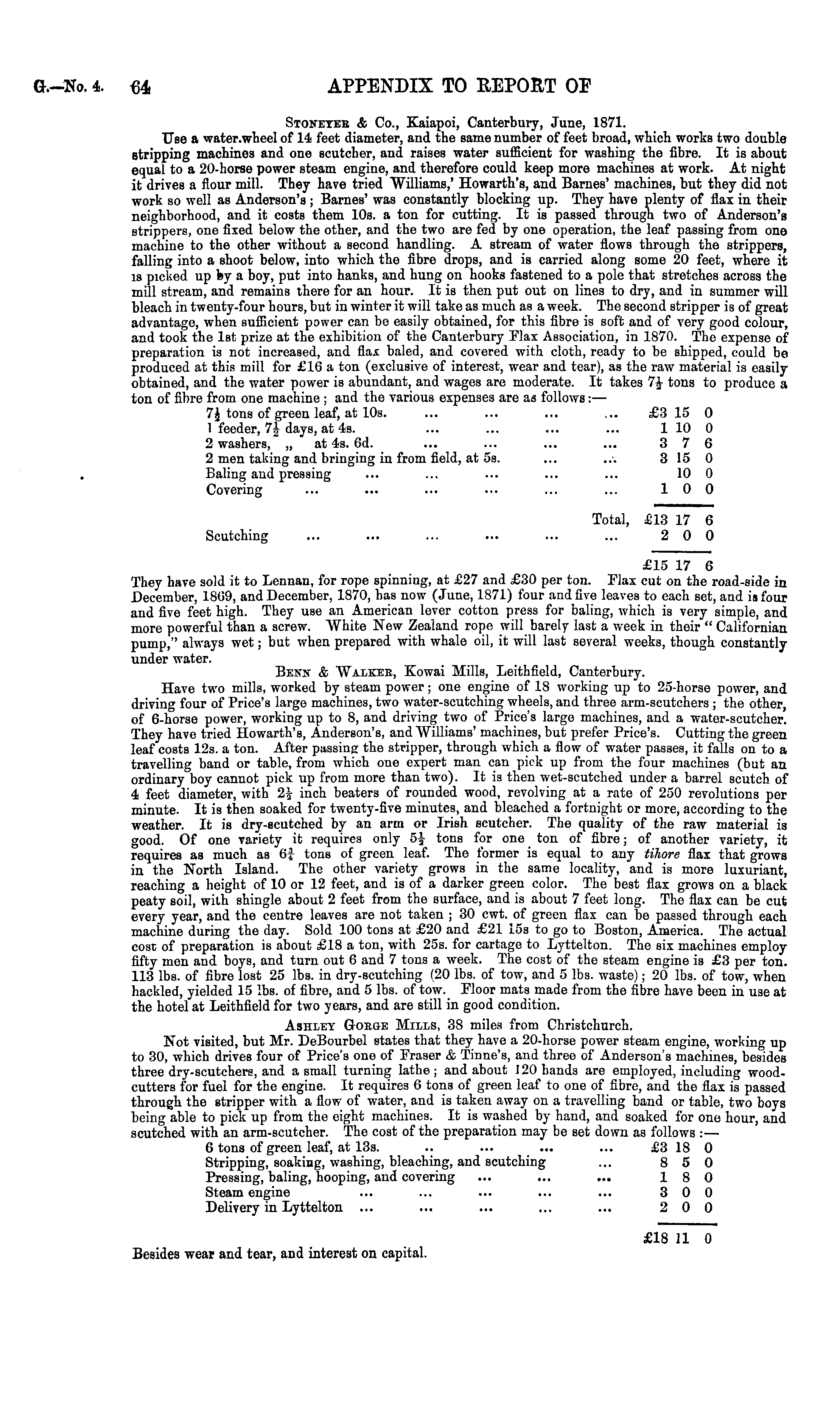 Stoneyee & Co., Kaiapoi, Canterbury, June, 1871. Use a water.wheel of 14 feet diameter, and the same number of feet broad, which works two double stripping machines and one scutcher, and raises water sufficient for washing the fibre. It is about equal to a 20-horse power steam engine, and therefore could keep more machines at work. At night it drives a flour mill. They have tried Williams,' Howarth's, and Barnes' machines, but they did not work so well as Anderson's ; Barnes' was constantly blocking up. They have plenty of flax in their neighborhood, and it costs them 10s. a ton for cutting. It is passed through two of Anderson's strippers, one fixed below the other, and the two are fed by one operation, the leaf passing from one machine to the other without a second handling. A stream of water flows through the strippers, falling into a shoot below, into which the fibre drops, and is carried along some 20 feet, where it is picked up by a boy, put into hanks, and hung on hooks fastened to a pole that stretches across the mill stream, and remains there for an hour. It is then put out on lines to dry, and in summer will bleach in twenty-four hours, but in winter it will take as much as a week. The second stripper is of great advantage, when sufficient power can be easily obtained, for this fibre is soft and of very good colour, and took the Ist prize at the exhibition of the Canterbury Flax Association, in 1870. The expense of preparation is not increased, and flax baled, and covered with cloth, ready to be shipped, could be produced at this mill for £16 a ton (exclusive of interest, wear and tear), as the raw material is easily obtained, and the water power is abundant, and wages are moderate. It takes 7% tons to produce a ton of fibre from one machine ; and the various expenses are as follows: — 7\ tons of green leaf, at 10s. ... ... ... ... £3 15 0 1 feeder, 7i days, at 4s. ... ... ... ... 1 10 0 2 washers,",, at 4s. 6d. ... ... ... ... 3 7 6 2 men taking and bringing in from field, at ss. ... ... 3 15 0 Baling aud pressing ... ... ... ... ... 10 0 Covering ... ... ... ••■ ... ... 10 0 Total, £13 17 6 Scutching ... ... ... ... ... ... 2 0 0 £15 17 6 They have sold it to Lennan, for rope spinning, at £27 and £30 per ton. Flax cut on the road-side in December, 1869, and December, 1870, has now (June, 1871) four and five leaves to each set, and is four and five feet high. They use an American lever cotton press for baling, which is very simple, and more powerful than a screw. White New Zealand rope will barely last a week in their " Californian pump," always wet; but when prepared with whale oil, it will last several weeks, though constantly under water. Benn & Walkee, Kowai Mills, Leithfield, Canterbury. Have two mills, worked by steam power; one engine of 18 working up to 25-horse power, and driving four of Price's large machines, two water-scutching wheels, and three arm-scutchers ; the other, of 6-horse power, working up to 8, and driving two of Price's large machines, and a water-scutcher. They have tried Howarth's, Anderson's, and Williams' machines, but prefer Price's. Cutting the green leaf costs 12s. a ton. After passing the stripper, through which a flow of water passes, it falls on to a travelling band or table, from which one expert man can pick up from the four machines (but an ordinary boy cannot pick up from more than two). It is then wet-scutched under a barrel scutch of 4 feet diameter, with 2\ inch beaters of rounded wood, revolving at a rate of 250 revolutions per minute. It is then soaked for twenty-five minutes, and bleached a fortnight or more, according to the weather. It is dry-scutched by an arm or Irish scutcher. The quality of the raw material is good. Of one variety it requires only 5£ tons for one ton of fibre; of another variety, it requires as much as 6i tons of green leaf. The former is equal to any tihore flax that grows in the North Island. The other variety grows in the same locality, and is more luxuriant, reaching a height of 10 or 12 feet, and is of a darker green color. The best flax grows on a black peaty soil, with shingle about 2 feet from the surface, and is about 7 feet long. The flax can be cut every year, and the centre leaves are not taken ; 30 cwt. of green flax can be passed through each machine during the day. Sold 100 tons at £20 and £21 15s to go to Boston, America. The actual cost of preparation is about £18 a ton, with 255. for cartage to Lyttelton. The six machines employ fifty men and boys, and turn out 6 and 7 tons a week. The cost of the steam engine is £3 per ton. 113 lbs. of fibre lost 25 lbs. in dry-scutching (20 lbs. of tow, and 5 lbs. waste); 20 lbs. of tow, when hackled, yielded 15 lbs. of fibre, and 5 lbs. of tow. Floor mats made from the fibre have been in use at the hotel at Leithfield for two years, and are still in good condition. Ashley Goege Mills, 38 miles from Christchurch. Not visited, but Mr. Deßourbel states that they have a 20-horse power steam engine, working up to 30, which drives four of Price's one of Fraser & Tinne's, and three of Anderson's machines, besides three dry-scutchers, and a small turning lathe; and about 120 hands are employed, including woodcutters for fuel for the engine. It requires 6 tons of green leaf to one of fibre, and the flax is passed through the stripper with a flow of water, and is taken away on a travelling band or table, two boys being able to pick up from the eight machines. It is washed by hand, and soaked for one hour, and scutched with an arm-scutcher. The cost of the preparation may be set down as follows :— 6 tons of green leaf, at 13s. .. ... ... ... £3 18 0 Stripping, soaking, washing, bleaching, and scutching ... 8 5 0 Pressing, baling, hooping, and covering ... ... ... 18 0 Steam engine ... ... ... ... ... 3 0 0 Delivery in Lyttelton ... ... ... ... ... 2 0 0 £18 11 0 Besides wear and tear, and interest on capita!
