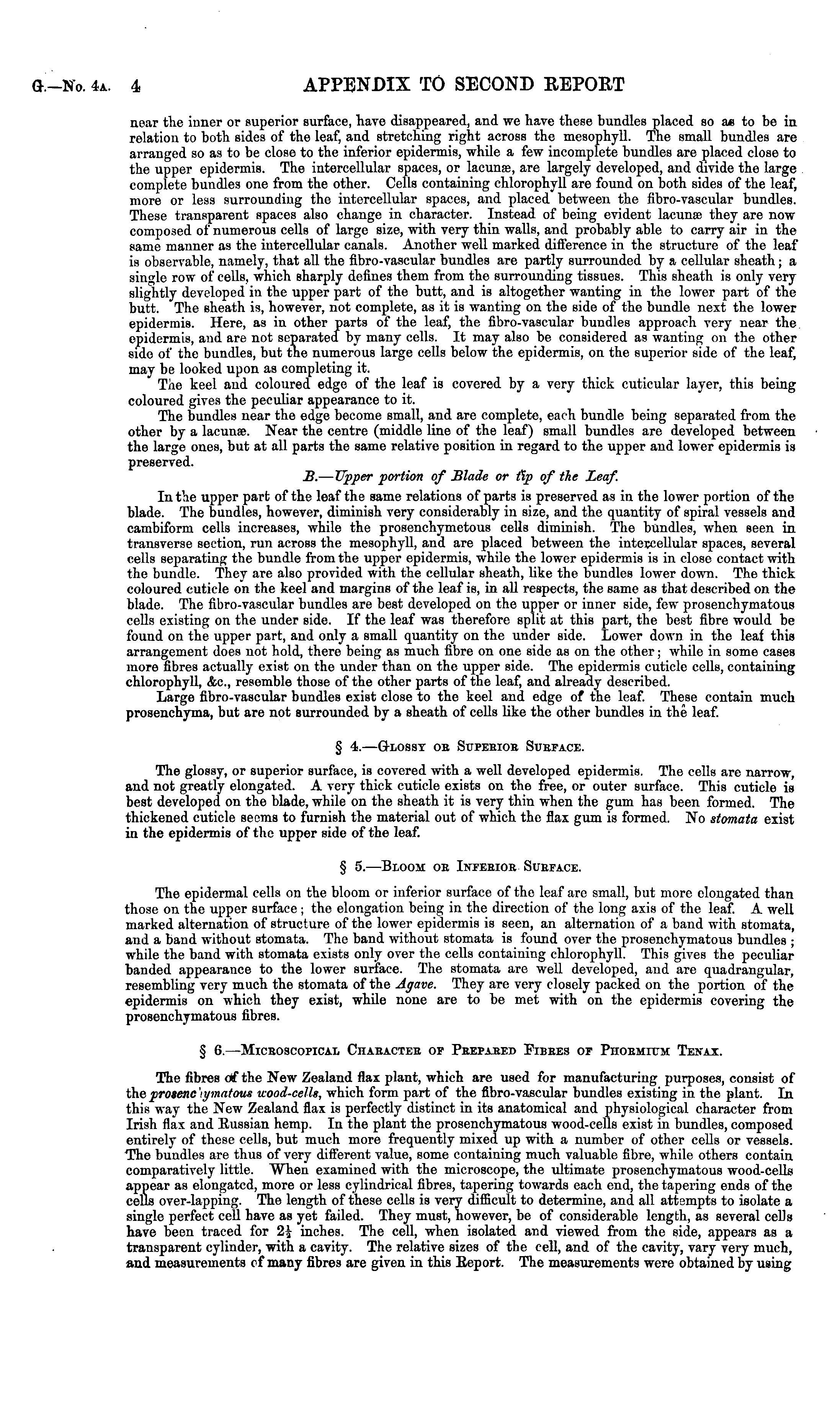 near the inner or superior surface, have disappeared, and we have these bundles placed so ae to be in relation to both sides of the leaf, and stretching right across the mesophyll. The small bundles are arranged so as to be close to the inferior epidermis, while a few incomplete bundles are placed close to the upper epidermis. The intercellular spaces, or lacunae, are largely developed, and divide tho large complete bundles one from the other. Cells containing chlorophyll are found on both sides of the leaf, more or less surrounding the intercellular spaces, and placed between tho fibro-vascular bundles. These transparent spaces also change in character. Instead of being evident lacunae they are now composed of numerous cells of large size, with very thin walls, and probably able to carry air in the same manner as the intercellular canals. Another well marked difference in the structure of the leaf is observable, namely, that all the fibro-vascular bundles are partly surrounded by a cellular sheath; a single row of cells, which sharply defines them from the surrounding tissues. This sheath is only very slightly developed in the upper part of the butt, and is altogether wanting in the lower part of the butt. The sheath is, however, not complete, as it is wanting on the side of the bundle next the lower epidermis. Here, as in other parts of the leaf, the fibro-vascular bundles approach very near the epidermis, and are not separated by many cells. It may also be considered as wanting on the other side of the bundles, but the numerous large cells below the epidermis, on the superior side of the leaf, may be looked upon as completing it. The keel and coloured edge of the leaf is covered by a very thick cuticular layer, this being coloured gives the peculiar appearance to it. The bundles near the edge become small, and are complete, each bundle being separated from the other by a lacunae. Near the centre (middle line of the leaf) small bundles are developed between the large ones, but at all parts the same relative position in regard to the upper and lower epidermis is preserved. B. — Upper portion of Blade or Hip of the Leaf. In the upper part of the leaf the same relations of parts is preserved as in the lower portion of the blade. The bundles, however, diminish very considerably in size, and the quantity of spiral vessels and cambiform cells increases, while the prosenchymetous cells diminish. The bundles, when seen in transverse section, run across the mesophyll, and are placed between the intercellular spaces, several cells separating the bundle from the upper epidermis, while the lower epidermis is in close contact with the bundle. They are also provided with the cellular sheath, like the bundles lower down. The thick coloured cuticle on the keel and margins of the leaf is, in all respects, the same as that described on the blade. The fibro-vascular bundles are best developed on the upper or inner side, few prosenchymatous cells existing on the under side. If the leaf was therefore split at this part, the best fibre would be found on the upper part, and only a small quantity on the under side. Lower down in the leaf this arrangement does not hold, there being as much fibre on one side as on the other; while in some cases more fibres actually exist on the under than on the upper side. The epidermis cuticle cells, containing chlorophyll, Ac, resemble those of the other parts of the leaf, and already described. Large fibro-vascular bundles exist close to the keel and edge of the leaf. These contain much prosenchyma, but are not surrounded by a sheath of colls like the other bundles in the leaf. § 4.—Glossy os Superior Surface. The glossy, or superior surface, is covered with a well developed epidermis. The cells are narrow, and not greatly elongated. A very thick cuticle exists on the free, or outer surface. This cuticle is best developed on the blade, while on the sheath it is very thin when the gum has been formed. The thickened cuticle seems to furnish the material out of which the flax gum is formed. No stomata exist in the epidermis of the upper side of the leaf. § 5. —Bloom or Inferior Surface. The epidermal cells on the bloom or inferior surface of the leaf are small, but more elongated than those on the upper surface ; the elongation being in the direction of the long axis of the leaf. A welL marked alternation of structure of the lower epidermis is seen, an alternation of a band with stomata, and a band without stomata. The band without stomata is found over the prosenchymatous bundles ; while the band with stomata exists only over the cells containing chlorophyll. This gives the peculiar banded appearance to the lower surface. The stomata are well developed, and are quadrangular, resembling very much the stomata of the Agave. They are very closely packed on the portion of the epidermis on which they exist, while none are to be met with on the epidermis covering the prosenchymatous fibres. § 6.—Microscopical Character of Prepared Fibres of Phormium Tenax. The fibres otf the New Zealand flax plant, which are used for manufacturing purposes, consist of the prosenc lymatous wood-cells, which form part of the fibro-vascular bundles existing in the plant. In this way the New Zealand flax is perfectly distinct in its anatomical and physiological character from Irish flax and Russian hemp. In the plant the prosenchymatous wood-cells exist in bundles, composed entirely of these cells, but much more frequently mixed up with a number of other cells or vessels. The bundles are thus of very different value, some containing much valuable fibre, while others contain comparatively little. When examined with the microscope, the ultimate prosenchymatous wood-cells appear as elongated, more or less cylindrical fibres, tapering towards each end, the tapering ends of the cells over-lapping. The length of these cells is very difficult to determine, and all attempts to isolate a single perfec