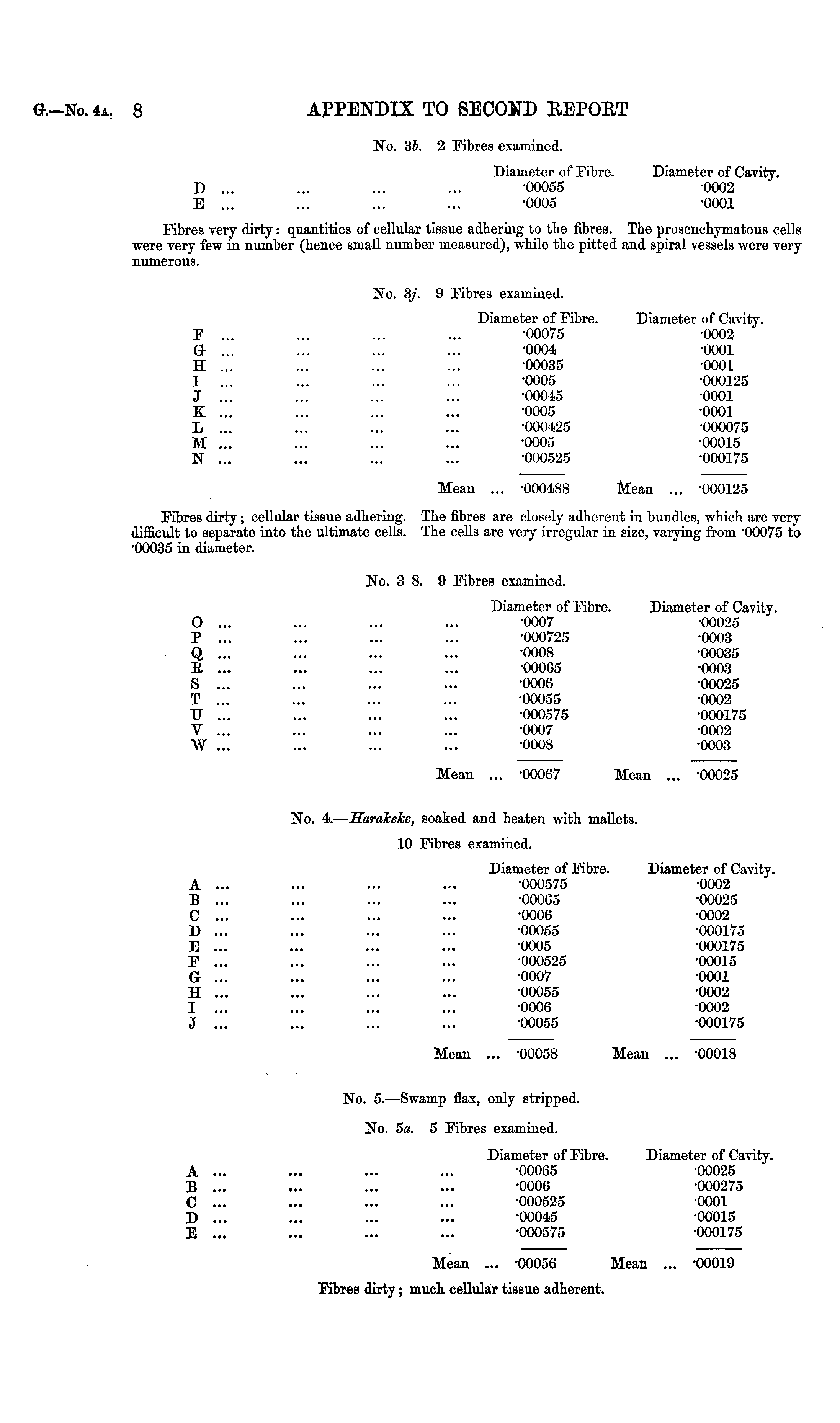 No. 3b. 2 Fibres examined. Diameter of Fibre. Diameter of Cavity. D ... ... ... ... -00055 -0002 E ... ... ... ... -0005 -0001 Fibres very dirty: quantities of cellular tissue adhering to the fibres. The prosenchymatous cells were very few in number (hence small number measured), while the pitted and spiral vessels were very numerous. No. 3/. 9 Fibres examined. Diameter of Fibre. Diameter of Cavity. F ... ... ... ... -00075 -0002 G ... ... ... ... -0004 -0001 H ... ... ... ... -00035 -0001 I ... ... ... ... -0005 -000125 J ... ... ... ... -00045 -0001 X ... ... ... ... -0005 -0001 L ... ... ... ... -000425 -000075 M ... ... ... ... -0005 -00015 N ... ... ... ... -000525 -000175 Mean ... -000488 Mean ... -000125 Fibres dirty; cellular tissue adhering. The fibres are closely adherent in bundles, which are very difficult to separate into the ultimate cells. The cells are very irregular in size, varying from -00075 to "00035 in diameter. No. 38. 9 Fibres examined. Diameter of Fibre. Diameter of Cavity. O ... ... ... ... -0007 -00025 P... ... ... ... -000725 -0003 . Q ... ... ... ... -0008 -00035 E ... ... ... ... -00065 -0003 S ... ... ... ... -0006 -00025 T ... ... ... ... -00055 -0002 U ... ... ... ... -000575 -000175 V ... ... ... ... -0007 -0002 W ... ... ... ... -0008 -0003 Mean ... -00067 Mean ... "00025 No. 4. — Sarakeke, soaked and beaten with mallets. 10 Fibres examined. Diameter of Fibre. Diameter of Cavity. A ... ... ... ... -000575 -0002 B ... ... ... ... -00065 -00025 C ... ... ... ... -0006 -0002 D ... ... ... ... -00055 -000175 E ... ... ... ... -0005 -000175 F ... ... ... ... -000525 -00015 a ... ... ... ... -0007 -0001 H ... ... ... ... -00055 -0002 I ... ... ... ... -0006 -0002 J ... ... ... ... -00055 -000175 Mean ... -00058 Mean ... -00018 No. 5. —Swamp flax, only stripped. No. sa. 5 Fibres examined. Diameter of Fibre. Diameter of Cavity. A ... ... ... ... -00065 -00025 B ... ... ... ... -0006 -000275 C ... ... ... ... -000525 -0001 D ... ... ... ... -00045 -00015 E ... ... ... ... -000575 -000175 Mean ... -00056 Mean ... -00019 Fibres dirty; much cellular tissue adherent.
