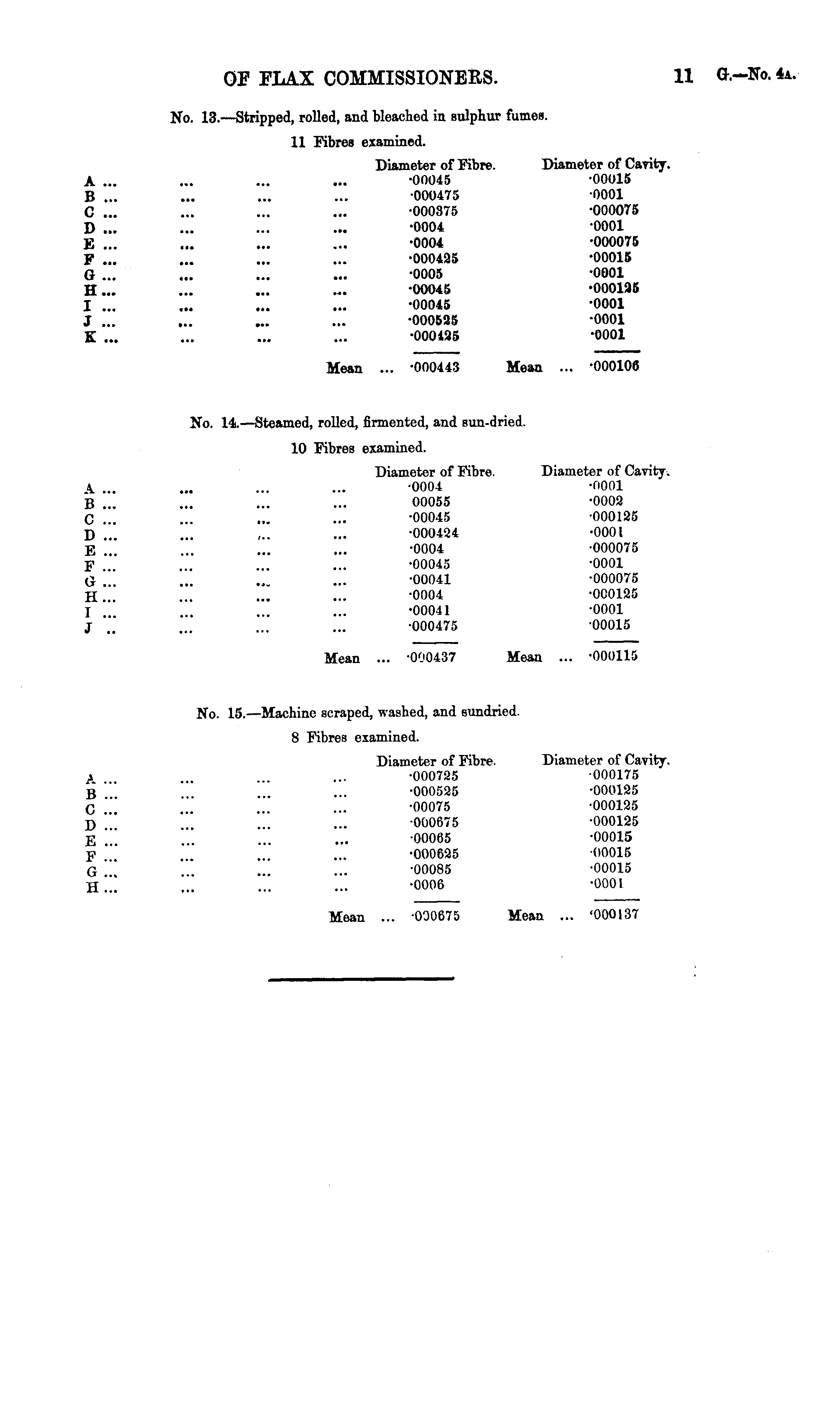 No. 13.—Stripped, rolled, and bleached in sulphur fumes. 11 Fibres examined. Diameter of Fibre. Diameter of Cavity. A ... ... ... ... -00045 -00015 B ... ... ... ... -000475 -0001 C ... ... ... ... -000375 -000075 D ... ... ... ... -0004 -0001 E ... ... ... ... -0004 -000075 F ... ... ... ... -000425 -00015 G ... ... ... ... -0005 -0001 H... ... ... «. -00045 -000195 I ... ... ... ... -00045 -0001 J ... ... ... ... -000525 -0001 K ... ... ... ... -000435 -0001 Mean ... -000443 Mean ... -000106 No. 14 —Steamed, rolled, firmented, and sun-dried. 10 Fibres examined. Diameter of Fibre. Diameter of Cavity. \ . . ... ... ... -0004 -0001 B ... ... ... ... 00055 -0002 C . ... ... ... -00045 -000125 D ... ... ... ... -000424 -0001 E ... ... ... ... "0004 -000075 F ... ... ... ... -00045 -0001 G . . ... ... ... -00041 -000075 H ... ... ... ... '0004 -000125 I ... ... ... ... -00041 -0001 J ... ... ... ... -000475 -00015 Mean ... -000437 Mean ... -000115 No. 15. —Machine scraped, washed, and sundried. 8 Fibres examined. Diameter of Fibre. Diameter of Cavity. £ .. ... -000725 -000175 B ... ... ... -000525 -000125 C .." ... ... .« -00075 -000125 D " ... -000675 -000125 E ... ... ... -00065 -00015 F '" ... -000625 (10015 G !'.. ... ... ... -00085 -00015 H... ... ... ... -0006 -0001 Mean ... 000675 Mean ... '000137