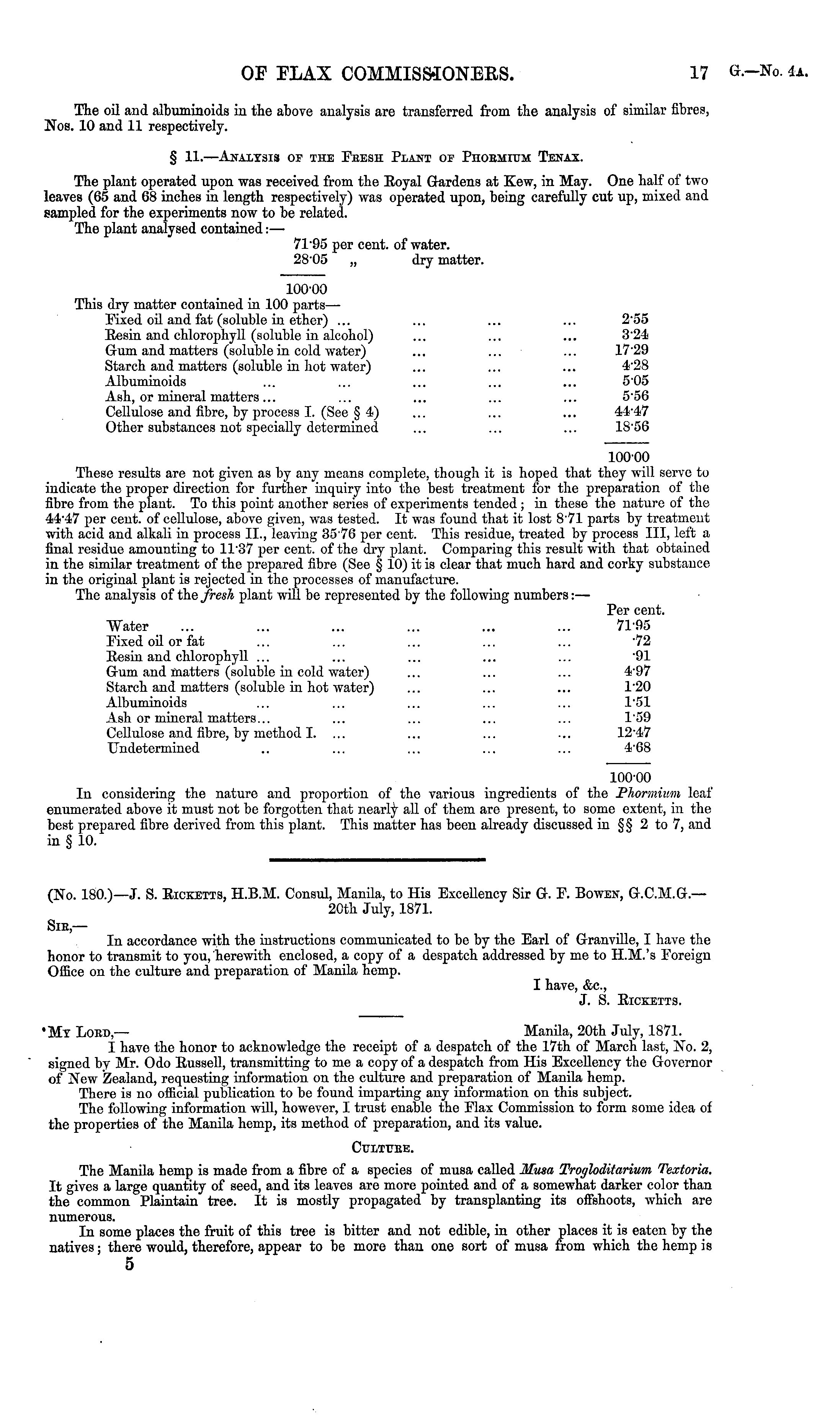(No. 180.)—J. S. Ricketts, H.B.M. Consul, Manila, to His Excellency Sir G. F. Bowen, G.C.M.G.— 20th July, 1871. Sir — In accordance with the instructions communicated to be by the Earl of Granville, I Lave the honor to transmit to you, herewith enclosed, a copy of a despatch addressed by me to H.M.'s Foreign Office on the culture and preparation of Manila hemp. I have, Ac, J. S. Ricketts. •My Lord,— Manila, 20th July, 1871. I have the honor to acknowledge the receipt of a despatch of the 17th of Alarch last, No. 2, signed by Air. Odo Russell, transmitting to me a copy of a despatch from His Excellency the Governor of New Zealand, requesting information on the culture and preparation of Alanila hemp. There is no official publication to be found imparting any information on this subject. The following information will, however, I trust enable the Flax Commission to form some idea of the properties of the Manila hemp, its method of preparation, and its value. Culture. The Manila hemp is made from a fibre of a species of musa called Musa Trogloditarium Textoria. It gives a large quantity of seed, and its leaves are more pointed and of a somewhat darker color than the common Plaintain tree. It is mostly propagated by transplanting its offshoots, which are numerous. In some places the fruit of this tree is bitter and not edible, in other places it is eaten by the natives; there would, therefore, appear to be more than one sort of musa from which the hemp is 5