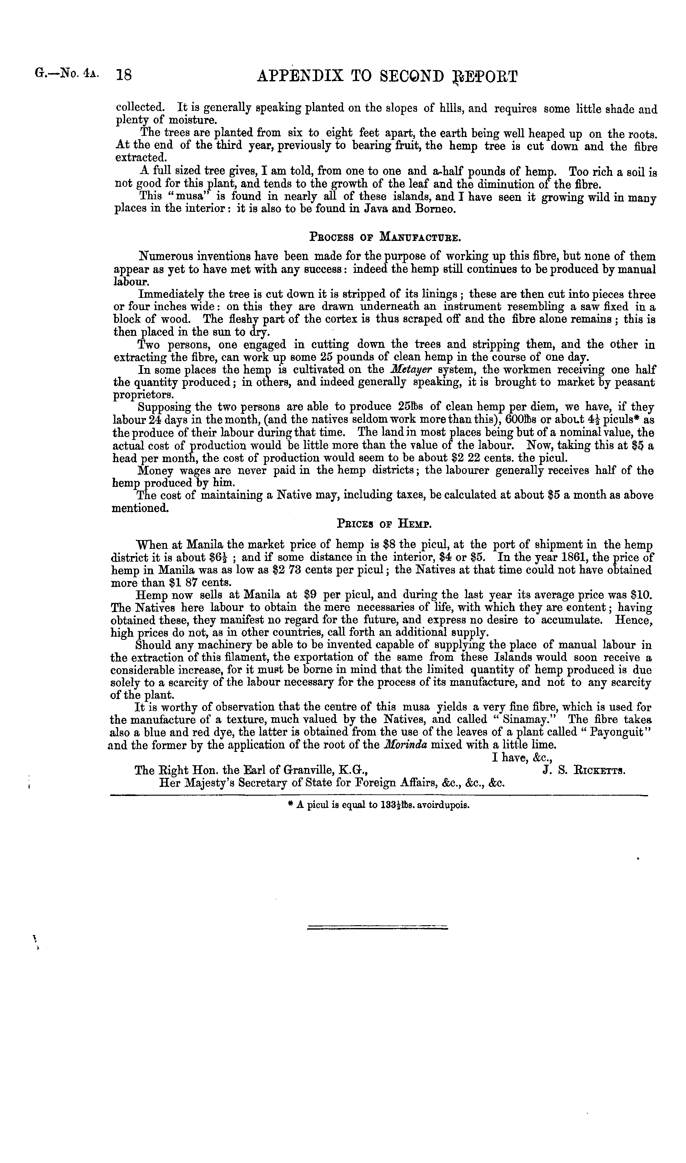 collected. It is generally speaking planted on the slopes of hills, and requires some little shade and plenty of moisture. The trees are planted from six to eight feet apart, the earth being well heaped up on the roots. At the end of the third year, previously to bearing fruit, the hemp tree is cut down and the fibre extracted. A full sized tree gives, lam told, from one to one and a-half pounds of hemp. Too rich a soil is not good for this plant, and tends to the growth of the leaf and the diminution of the fibre. This " musa" is found in nearly all of these islands, and I have seen it growing wild in many places in the interior: it is also to be found in Java and Borneo. Process of Manufacture. Numerous inventions have been made for the purpose of working up this fibre, but none of them appear as yet to have met with any success: indeed the hemp still continues to be produced by manual labour. Immediately the tree is cut down it is stripped of its linings ; these are then cut into pieces three or four inches wide: on this they are drawn underneath an instrument resembling a saw fixed in a block of wood. The fleshy part of the cortex is thus scraped off and the fibre alone remains ; this is then placed in the sun to dry. Two persons, one engaged in cutting down the trees and stripping them, and the other in extracting the fibre, can work up some 25 pounds of clean hemp in the course of one day. In some places the hemp is cultivated on the Metayer system, the workmen receiving one half the quantity produced ; in others, and indeed generally speaking, it is brought to market by peasant proprietors. Supposing the two persons are able to produce 251hs of clean hemp per diem, we have, if they labour 24 days in the month, (and the natives seldom work more than this), 600ihs or about 4| piculs* as the produce of their labour during that time. The land in most places being but of a nominal value, the actual cost of production would be little more than the value of the labour. Now, taking this at 85 a head per month, the cost of production would seem to be about 32 22 cents, the picul. Aloney wages arc never paid in the hemp districts; the labourer generally receives half of the hemp produced by him. The cost of maintaining a Native may, including taxes, be calculated at about §5 a month as above mentioned. Prices of Hemp. AVhen at Alanila the market price of hemp is §8 the picul, at the port of shipment in the hemp district it is about 86| ; and if some distance in the interior, §4 or §5. In the year 1861, the price of hemp in Manila was as low as %2 73 cents per picul; the Natives at that time could not have obtained more than §1 87 cents. Hemp now sells at Manila at 89 per picul, and during the last year its average price was $10. The Natives here labour to obtain the mere necessaries of life, with which they are content; having obtained these, they manifest no regard for the future, and express no desire to accumulate. Hence, high prices do not, as in other countries, call forth an additional supply. Should any machinery be able to be invented capable of supplying the place of manual labour in the extraction of this filament, the exportation of the same from these Islands would soon receive a considerable increase, for it must be borne in mind that the limited quantity of hemp produced is due solely to a scarcity of the labour necessary for the process of its manufacture, and not to any scarcity of the plant. It is worthy of observation that the centre of this musa yields a very fine fibre, which is used for the manufacture of a texture, much valued by the Natives, and called " Sinamay." The fibre takes also a blue and red dye, the latter is obtained from the use of the leaves of a plant called " Payonguit" and the former by the application of the root of the Morinda mixed with a little lime. I have, Ac, The Right Hon. the Earl of Granville, K.G, J. S. Ricketts. Her Alajesty's Secretary of State for Foreign Affairs, Ac, Ac, Ac. * A picul is equal to 133i_bs. avoirdupois.