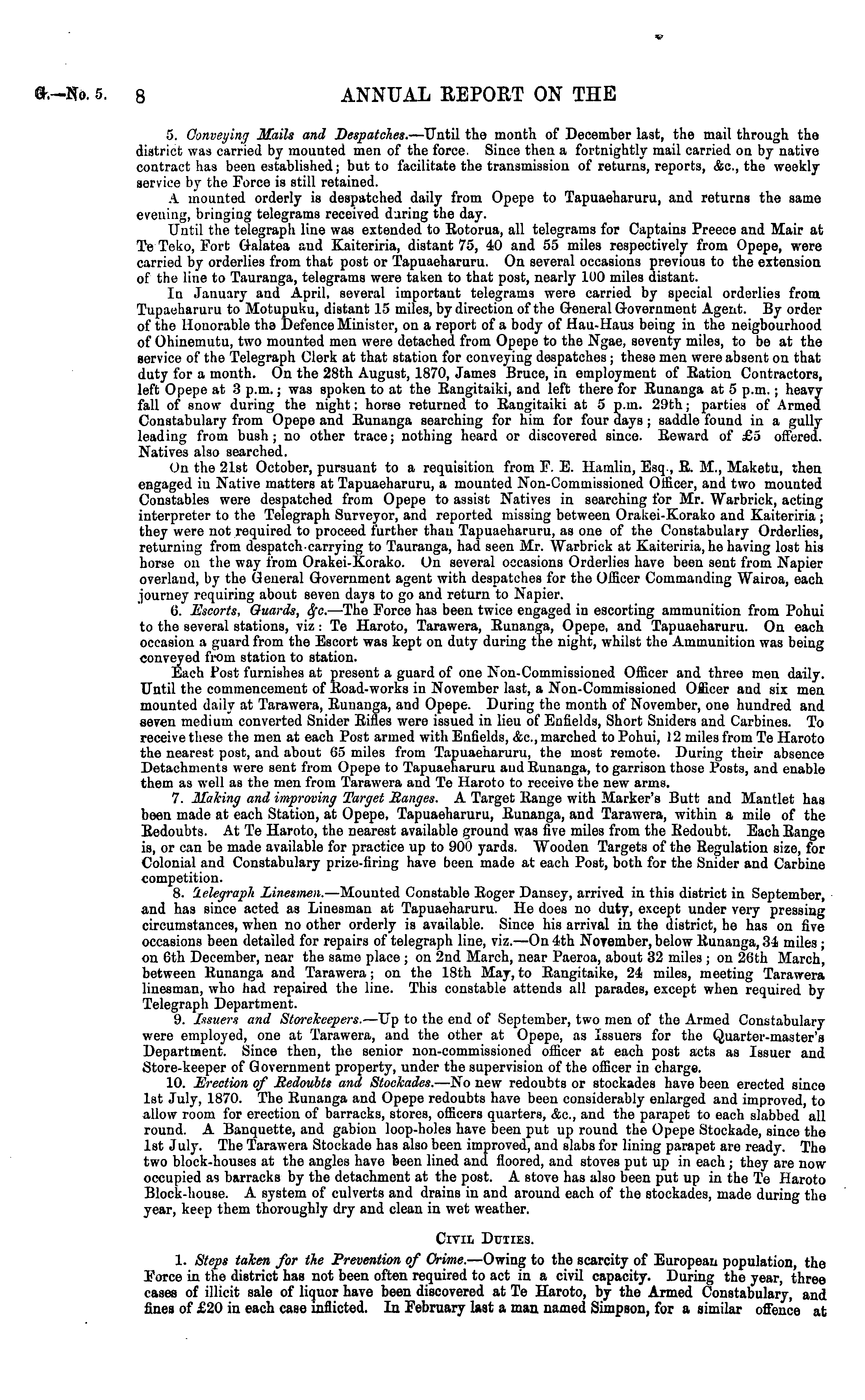 5. Conveying Mails and Despatches. —Until the month of December last, the mail through the district was carried by mounted men of the force. Since then a fortnightly mail carried on by native contract has been established; but to facilitate the transmission of returns, reports, &c, the weekly service by the Force is still retained. A mounted orderly is despatched daily from Opepe to Tapuaeharuru, and returns the same evening, bringing telegrams received during the day. Until the telegraph line was extended to Rotorua, all telegrams for Captains Preece and Mair at Te Teko, Fort Galatea aud Kaiteriria, distant 75, 40 and 55 miles respectively from Opepe, were carried by orderlies from that post or Tapuaeharuru. On several occasions previous to the extension of the line to Tauranga, telegrams were taken to that post, nearly 100 miles distant. In January and April, several important telegrams were carried by special orderlies from Tupaeharuru to Motupuku, distant 15 miles, by direction of the General Government Agent. By order of the Honorable the Defence Minister, on a report of a body of Hau-Haus being in the neigbourhood of Ohinemutu, two mounted men were detached from Opepe to the Ngae, seventy miles, to be at the service of the Telegraph Clerk at that station for conveying despatches ; these men were absent on that duty for a month. On the 28th August, 1870, James Bruce, in employment of Ration Contractors, left Opepe at 3 p.m.; was spoken to at the Rangitaiki, and left there for Runanga at 5 p.m.; heavy fall of snow during the night; horse returned to Rangitaiki at 5 p.m. 29th; parties of Armed Constabulary from Opepe and Runanga searching for him for four days ; saddle found in a gully leading from bush; no other trace; nothing heard or discovered since. Reward of £5 offered. Natives also searched. On the 21st October, pursuant to a requisition from F. E. Hamlin, Esq., R. M., Maketu, then engaged iu Native matters at Tapuaeharuru, a mounted Non-Commissioned Officer, and two mounted Constables were despatched from Opepe to assist Natives in searching for Mr. Warbrick, acting interpreter to the Telegraph Surveyor, and reported missing between Orakei-Korako and Kaiteriria; they were not required to proceed further than Tapuaeharuru, as one of the Constabulary Orderlies, returning from despatch-carrying to Tauranga, had seen Mr. AVarbrick at Kaiteriria, he having lost his horse on the way from Orakei-Korako. On several occasions Orderlies have beeu sent from Napier overland, by the General Government agent with despatches for the Officer Commanding Wairoa, each journey requiring about seven days to go and return to Napier. 6. Escorts, Guards, tyc. —The Force has been twice engaged in escorting ammunition from Pohui to the several stations, viz: Te Haroto, Tarawera, Runanga, Opepe, and Tapuaeharuru. On each occasion a guard from the Escort was kept on duty during the night, whilst the Ammunition was being conveyed from station to station. Each Post furnishes at present a guard of one Non-Commissioned Officer and three men daily. Until the commencement of Road-works in November last, a Non-Commissioned Officer and six men mounted daily at Tarawera, Runanga, and Opepe. During the month of November, one hundred and seven medium converted Snider Rifles were issued in lieu of Enfields, Short Sniders and Carbines. To receive these the men at each Post armed with Enfields, &c, marched to Pohui, 12 miles from Te Haroto the nearest post, and about 65 miles from Tapuaeharuru, the most remote. During their absence Detachments were sent from Opepe to Tapuaeharuru and Runanga, to garrison those Posts, and enable them as well as the men from Tarawera and Te Haroto to receive the new arms. 7. Making and improving Target Ranges. A Target Range with Marker's Butt and Mantlet has been made at each Station, at Opepe, Tapuaeharuru, Runanga, and Tarawera, within a mile of the Redoubts. At Te Haroto, the nearest available ground was five miles from the Redoubt. Each Range is, or can be made available for practice up to 900 yards. AVooden Targets of the Regulation size, for Colonial and Constabulary prize-firing have been made at each Post, both for the Snider and Carbine competition. 8. lelegraph Linesmen. —Mounted Constable Roger Dansey, arrived in this district in September, and has since acted as Linesman at Tapuaeharuru. He does no duty, except under very pressing circumstances, when no other orderly is available. Since his arrival in the district, he has on five occasions been detailed for repairs of telegraph line, viz.—On 4th November, below Runanga, 34 miles ; on 6th December, near the same place ; on 2nd March, near Paeroa, about 32 miles ; on 26th March, between Runanga and Tarawera; on the 18th May, to Rangitaike, 24 miles, meeting Tarawera linesman, who had repaired the line. This constable attends all parades, except when required by Telegraph Department. 9. Issuers and Storekeepers. —Up to the end of September, two men of the Armed Constabulary were employed, one at Tarawera, and the other at Opepe, as Issuers for the Quarter-master's Department. Since then, the senior non-commissioned officer at each post acts as Issuer and Store-keeper of Government property, under the supervision of the officer in charge. 10. Erection of Redoubts and Stockades.—No new redoubts or stockades have been erected since Ist July, 1870. The Runanga and Opepe redoubts have been considerably enlarged and improved, to allow room for erection of barracks, stores, officers quarters, &c, and the parapet to each slabbed all round. A Banquette, and gabion loop-holes have been put up round the Opepe Stockade, since the Ist July. The Tarawera Stockade has also been improved, and slabs for lining parapet are ready. The two block-houses at the angles have been lined and floored, and stoves put up in each ; they are now occupied as barracks by the detachment at the post. A stove has also been put up in the Te Haroto Bl