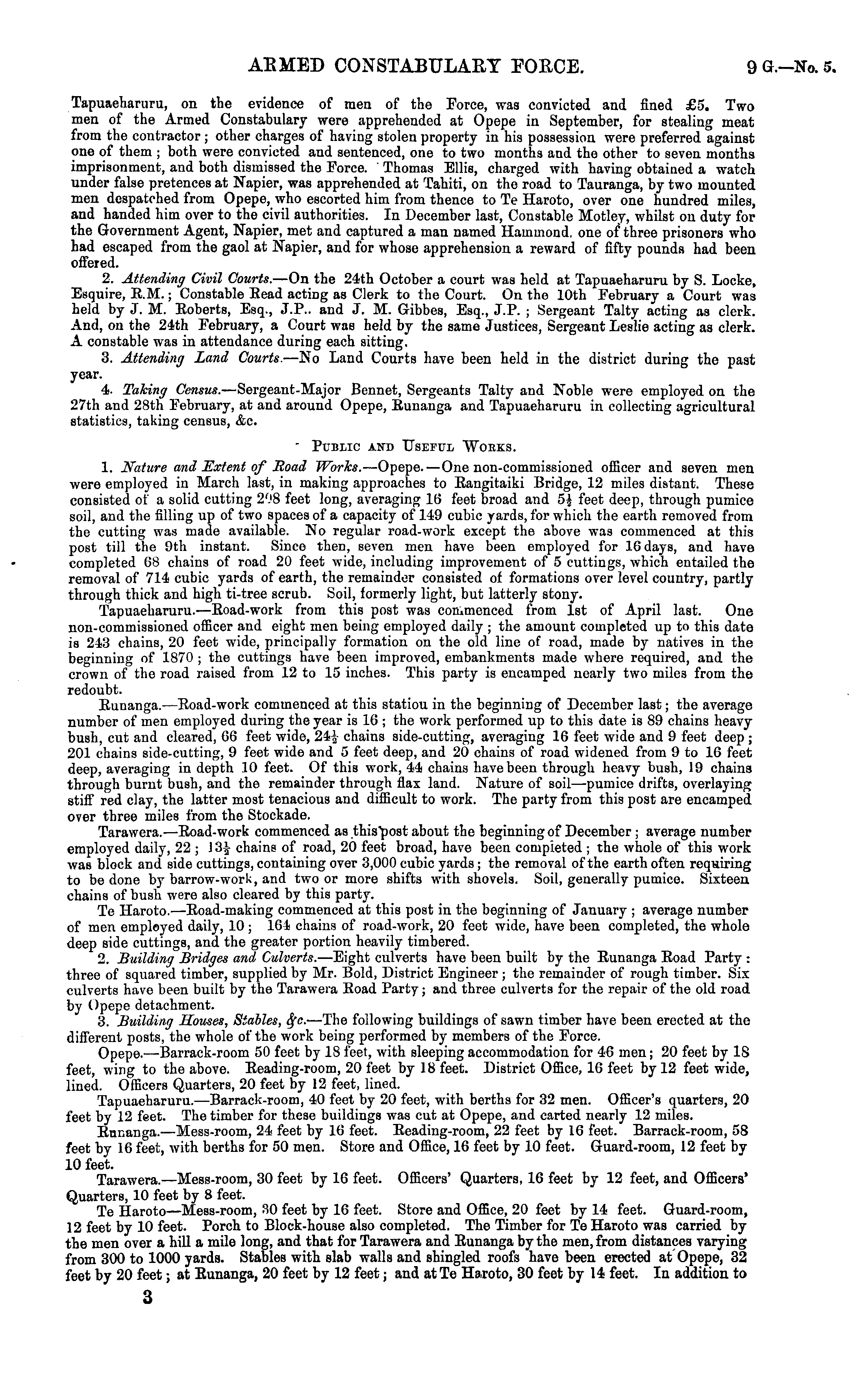 Tapuaeharuru, on the evidence of men of the Force, was convicted and fined £5. Two men of the Armed Constabulary were apprehended at Opepe in September, for stealing meat from the contractor ; other charges of having stolen property in his possession were preferred against one of them ; both were convicted and sentenced, one to two months and the other to seven months imprisonment, and both dismissed the Force. ' Thomas Ellis, charged with having obtained a watch under false pretences at Napier, was apprehended at Tahiti, on the road to Tauranga, by two mounted men despatched from Opepe, who escorted him from thence to Te Haroto, over one hundred miles, and handed him over to the civil authorities. In December last, Constable Motley, whilst on duty for the Government Agent, Napier, met and captured a man named Hammond, one of three prisoners who had escaped from the gaol at Napier, and for whose apprehension a reward of fifty pounds had been offered. 2. Attending Civil Courts. —On the 24th October a court was held at Tapuaeharuru by S. Locke, Esquire, R.M. • Constable Read acting as Clerk to the Court. On the 10th February a Court was held by J. M. Roberts, Esq., J.P.. and J. M. Gibbes, Esq., J.P. ; Sergeant Talty acting as clerk. And, on the 24th February, a Court was held by the same Justices, Sergeant Leslie acting as clerk. A constable was in attendance during each sitting. 3. Attending Land Courts. —No Land Courts have been held in the district during the past year. 4. Taking Census. —Sergeant-Major Bennet, Sergeants Talty and Noble were employed on the 27th and 28th February, at and around Opepe, Runanga and Tapuaeharuru in collecting agricultural statistics, taking census, &c. - Public and Useful Works. 1. Nature and Extent of Road Works. —Opepe.—One non-commissioned officer and seven men were employed in March last, in making approaches to Rangitaiki Bridge, 12 miles distant. These consisted of a solid cutting 208 feet long, averaging 16 feet broad and 51 feet deep, through pumice soil, and the filling up of two spaces of a capacity of 149 cubic yards, for which the earth removed from the cutting was made available. No regular road-work except the above was commenced at this post till the 9th instant. Since then, seven men have been employed for 16 days, and have completed 68 chains of road 20 feet wide, including improvement of 5 cuttings, which entailed the removal of 714 cubic yards of earth, the remainder consisted of formations over level country, partly through thick and high ti-tree scrub. Soil, formerly light, but latterly stony. Tapuaeharuru. —Road-work from this post was commenced from Ist of April last. One non-commissioned officer and eight men being employed daily ; the amount completed up to this date is 243 chains, 20 feet wide, principally formation on the old line of road, made by natives in the beginning of 1870 ; the cuttings have been improved, embankments made where required, and the crown of the road raised from 12 to 15 inches. This party is encamped nearly two mile3 from the redoubt. Runanga. —Road-work commenced at this statiou in the beginning of December last; the average number of men employed during the year is 16 ; the work performed up to this date is 89 chains heavy bush, cut and cleared, 66 feet wide, 24£ chains side-cutting, averaging 16 feet wide and 9 feet deep ; 201 chains side-cutting, 9 feet wide and 5 feet deep, and 20 chains of road widened from 9 to 16 feet deep, averaging in depth 10 feet. Of this work, 44 chains have been through heavy bush, 19 chains through burnt bush, and the remainder through flax land. Nature of soil —pumice drifts, overlaying stiff red clay, the latter most tenacious and difficult to work. The party from this post are encamped over three miles from the Stockade. Tarawera. —Road-work commenced as this'post about the beginning of December ; average number employed daily, 22 ; \3\ chains of road, 20 feet broad, have been completed ; the whole of this work was block and side cuttings, containing over 3,000 cubic yards; the removal of the earth often requiring to be done by barrow-work, and two or more shifts with shovels. Soil, generally pumice. Sixteen chains of bush were also cleared by this party. Te Haroto. —Road-making commenced at this post in the beginning of January ; average number of men employed daily, 10; 164 chains of road-work, 20 feet wide, have been completed, the whole deep side cuttings, and the greater portion heavily timbered. 2. Building Bridges and Culverts. —Eight culverts have been built by the Runanga Road Party : three of squared timber, supplied by Mr. Bold, District Engineer ; the remainder of rough timber. Six culverts have been built by the Tarawera Road Party; and three culverts for the repair of the old road by Opepe detachment. 3. Building Houses, Stables, eye. —The following buildings of sawn timber have been erected at the different posts, the whole of the work being performed by members of the Force. Opepe. —Rarrack-room 50 feet by 18 feet, with sleeping accommodation for 46 men; 20 feet by 18 feet, wing to the above. Reading-room, 20 feet by 18 feet. District Office, 16 feet by 12 feet wide, lined. Officers Quarters, 20 feet by 12 feet, lined. Tapuaeharuru. —Barrack-room, 40 feet by 20 feet, with berths for 32 men. Officer's quarters, 20 feet by 12 feet. The timber for these buildings was cut at Opepe, and carted nearly 12 miles. Runanga.—Mess-room, 24 feet by 16 feet. Reading-room, 22 feet by 16 feet. Barrack-room, 58 feet by 16 feet, with berths for 50 men. Store and Office, 16 feet by 10 feet. Guard-room, 12 feet by 10 feet. Tarawera. —Mess-room, 30 feet by 16 feet. Officers' Quarters, 16 feet by 12 feet, and Officers' Quarters, 10 feet by 8 feet. Te Haroto —Mess-room, 30 feet by 16 feet. Store and Office, 20 feet by 14 feet. Guard-room, 12 feet by 10 feet. Porch to Block-house also completed. The Timber for Te Haroto was carried by the men 