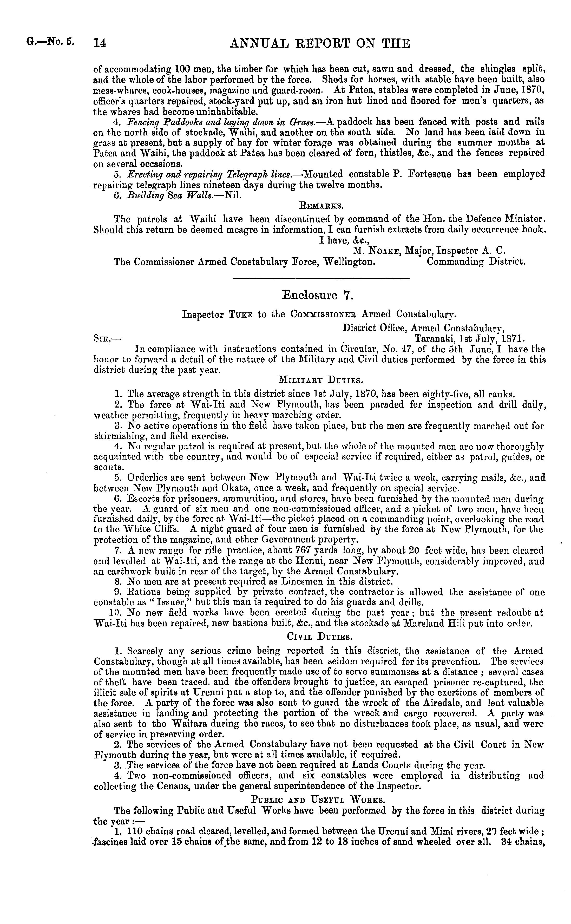 of accommodating 100 men, the timber for which has been cut, sawn and dressed, the shingles split, and the whole of the labor performed by the force. Sheds for horses, with stable have been built, also mess-whares, cook-houses, magazine and guard-room. At Patea, stables were completed in June, 1870, officer's quarters repaired, stock-yard put up, and an iron hut lined and floored for men's quarters, as the whares had become uninhabitable. 4. Fencing Paddocks and laying down in Grass —A paddock has been fenced with posts and rails on the north side of stockade, Waihi, and another on the south side. No land has been laid down in grass at present, but a supply of hay for winter forage was obtained during the summer months at Patea and AVaihi, the paddock at Patea has been cleared of fern, thistles, Ac., and the fences repaired on several occasions. 5. Erecting and repairing Telegraph lines. —Mounted constable P. Fortescue has been employed repairing telegraph lines nineteen days during the twelve months. 6. Building Sea Walls. —Nil. Remarks. The patrols at Waihi have been discontinued by command of the Hon. the Defence Minister. Should this return be deemed meagre in information, I can furnish extracts from daily occurrence book. I have, Ac, M. Noake, Major, Inspector A. C. The Commissioner Armed Constabulary Force, AVellington. Commanding District.