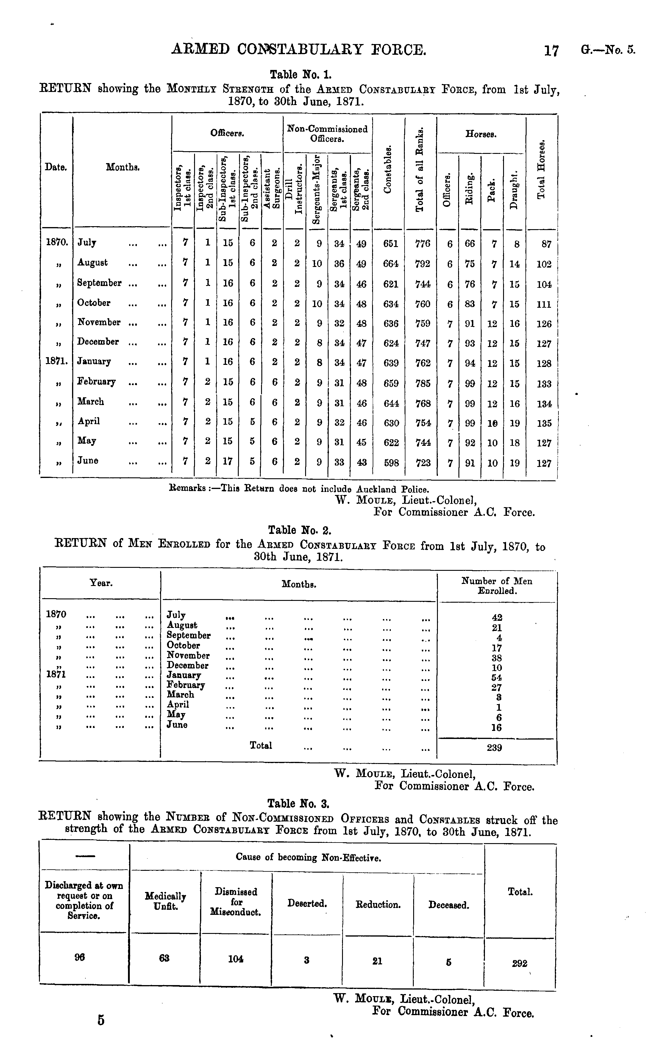Table No. 3. RETURN showing the NUMBER of NON-COMMISSIONED OFFICERS and CONSTABLES struck off the strength of the ARMED CONSTABULARY FORCE from 1st July, 1870, to 30th June, 1871.