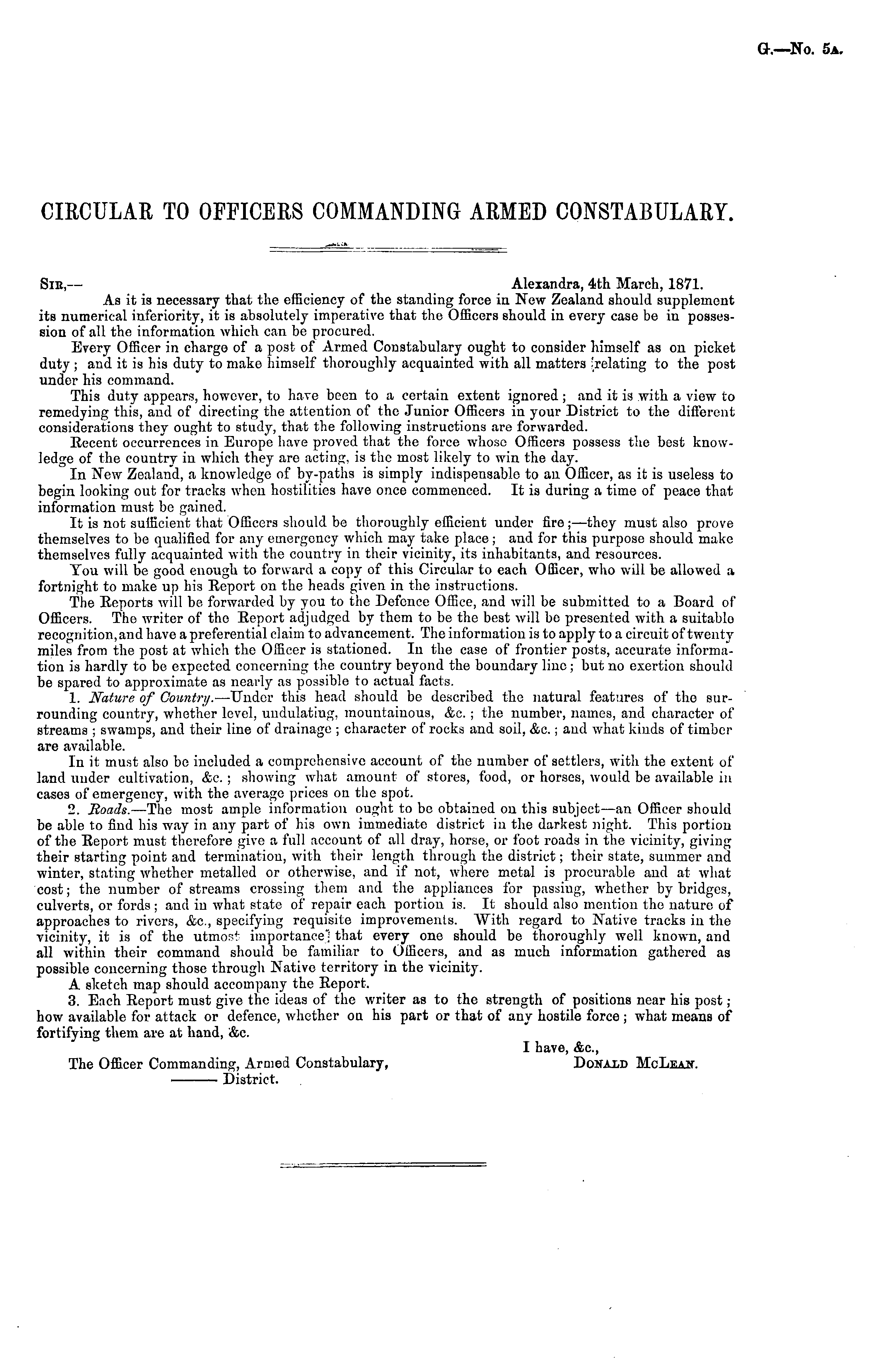 Sir, — Alexandra, 4th March, 1871. As it is necessary that the efficiency of the standing force in New Zealand should supplement its numerical inferiority, it is absolutely imperative that the Officers should in every case be in possession of all the information which can be procured. Every Officer in charge of a post of Armed Constabulary ought to consider himself as on picket duty ; and it is his duty to make himself thoroughly acquainted with all matters 'relating to the post under his command. This duty appears, however, to havo been to a certain extent ignored ; and it is with a view to remedying this, and of directing the attention of the Junior Officers in your District to the different considerations they ought to study, that the following instructions are forwarded. Recent occurrences in Europe have proved that the force whoso Officers possess the best knowledge of the country iu which they are acting, is the most likely to win the day. In New Zealand, a knowledge of by-paths is simply indispensable to an Officer, as it is useless to begin looking out for tracks when hostilities have once commenced. It is during a time of peace that information must be g.ained. It is not sufficient that Officers should be thoroughly efficient under fire ; —they must also prove themselves to be qualified for any emergency which may take place; and for this purpose should make themselves fully acquainted with the country in their vicinity, its inhabitants, and resources. Tou will be good enough to forward a copy of this Circular to each Officer, who will be allowed a fortnight to make up his Report on the heads given in the instructions. The Reports will be forwarded by you to the Defence Office, and will be submitted to a Board of Officers. The writer of tho Report adjudged by them to be the best will be presented with a suitablo recognition, aud have a preferential claim to advancement. The information is to apply to a circuit of twenty miles from the post at which the Officer is stationed. In the case of frontier posts, accurate information is hardly to bo expected concerning the country beyond the boundary lino; but no exertion should be spared to approximate as nearly as possible to actual facts. 1. Nature of Country. —Under this head should be described the natural features of the surrounding country, whether level, undulating, mountainous, &c. ; the number, names, and character of streams ; swamps, and their line of drainage ; character of rocks and soil, &c.; and what kinds of timber are available. In it must also be included a comprehensive account of the number of settlers, with the extent of hand under cultivation, &c. ; showing what amount of stores, food, or horses, would be available in cases of emergency, with the average prices on the spot. 2. Boads. —The most ample information ought to be obtained on this subject —an Officer should be able to find his way in any part of his own immediate district in the darkest night. This portion of tho Report must therefore give a full account of all dray, horse, or foot roads in the vicinity, giving their starting point and termination, with their length through the district; their state, summer and winter, stating whether metalled or otherwise, and if not, where metal is procurable aud at what cost; the number of streams crossing them and the appliances for passing, whether by bridges, culverts, or fords ; and iu what state of repair each portion is. It should also mention tho nature of approaches to rivers, &c., specifying requisite improvements. AVith regard to Native tracks in the vicinity, it is of the utmost importance] that every one should be thoroughly well known, and all within their command should be familiar to Officers, and as much information gathered as possible concerning those through Native territory in the vicinity. A sketch map should accompany the Report. 3. Each Report must give the ideas of the writer as to the strength of positions near his post; how available for attack or defence, whether on his part or that of any hostile force ; what means of fortifying them are at hand, &c. I have, _c, The Officer Commanding, Armed Constabulary, Donalh McLean. District.