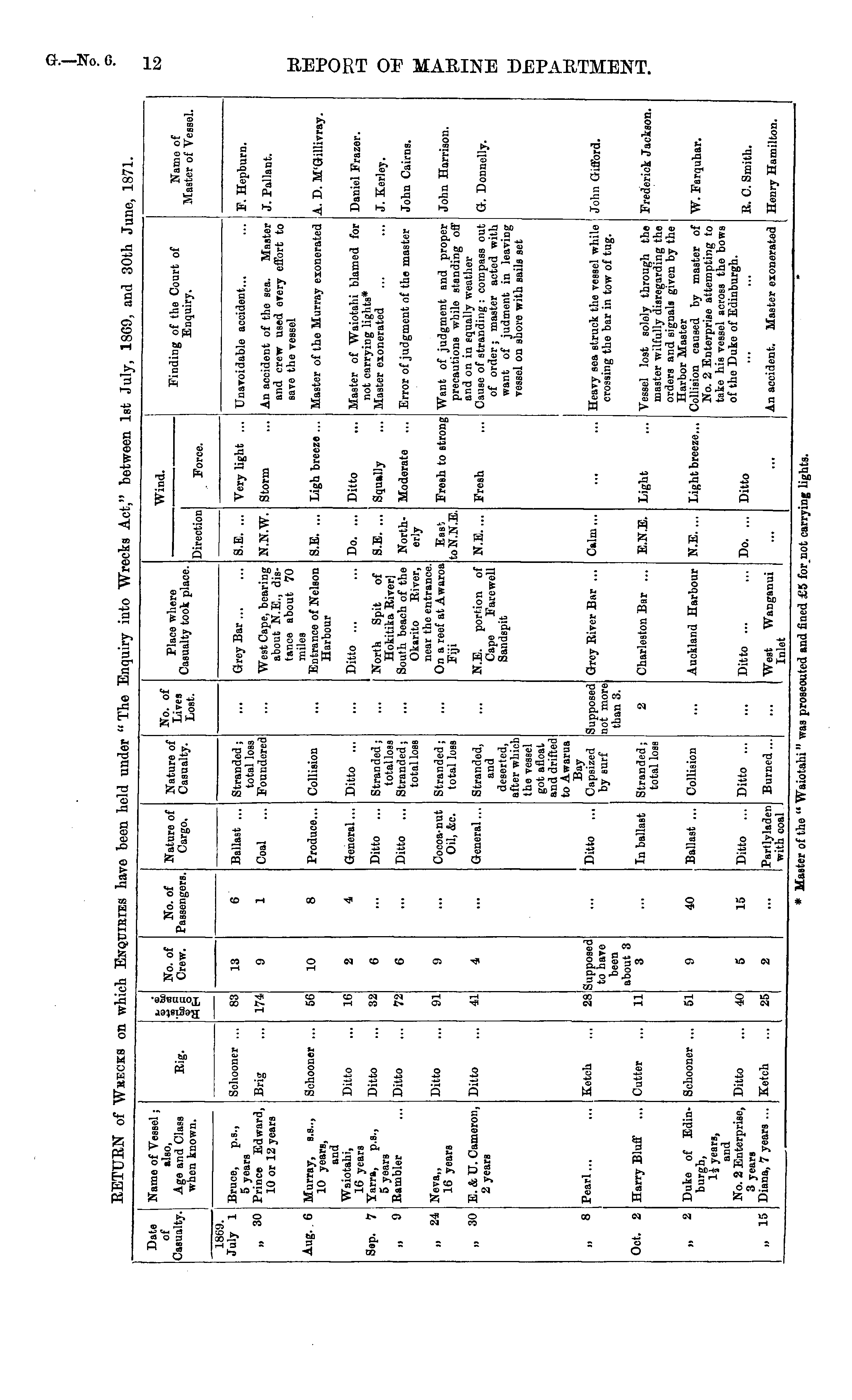 Date of Casualty. Name of Vessel; also, Age and Class when known. No. of Crew. No. of Nature of Cargo, Nature of Casualty. No. of Lives Lost. Wind. Finding of the Court of Enquiry. Name of Master of Vessel. Rig. Passengers. Casualty took place. Direction Force. 1869. July 1 Bruce, p.s., 5 years Prince Edward, 10 or 12 years Schooner .,. 83 6 r.i Ballast ... Stranded ; total loss Foundered G-rey Bar ... S.E. ... Very light ... Unavoidable accident... F. Hepburn. „ 30 Brig 174 9 1 Coal West Cape, bearing about N.E., distance about 70 miles Entrance of Nelson Harbour N.N.W. Storm An accident of the sea. Master and crew used every effort to save the vessel J. Pallant. Aug. 6 Murray, s.s.., 10 years, and Waiotahi, 16 years Yarra, p.s., 5 years Rambler Schooner ... 10 8 Produce... Collision S.E. ... Ligh breeze ... A. D. M'Gillivray. 5G Master of the Murray exonerated Ditto 10 2 4 General... Ditto ... Ditto ... Do. ... Ditto Master of Waiotahi blamed for not carrying lights* Master exonerated Daniel Frazer. Sep. 7 Ditto 32 6 Ditto ... Stranded; totalloss Stranded; totalloss North Spit of Hokitika River] South beach of the Okarito River, near the entrance. On a reef at Awaroa Fiji S.E. ... Squally J. Kerley. ,. 9 Ditto 72 6 Ditto ... Northerly Moderate Error of judgment of the master John Cairns, „ 24 Neva,, 16 years Ditto 01 9 Cocoa-nut Oil, &c. Stranded; total loss Easi toN.N.E. Fresh to strong Want of judgment and proper precautions while standing off and on in equally weather Cause of stranding : compass out of order; master acted with want of judment in leaving vessel on shore with sails set John Harrison. „ 30 E. & U. Cameron, 2 years Ditto 4 Genoral... Stranded, and deserted, after which the vessel got afloat and drifted to Awarua Bay Capsized by surf N.E. portion of Cape Farewell Sandspit N.E.... Fresh G-. Donnelly. ■11 Pearl... Grey River Bar ... Heavy sea struck the vessel while crossing the bar in tow of tug. John Gilford. . 8 Ketch 2S Supposed to have been about 3 3 Ditto ... .Supposed not more tban 3. Calm... Oct. 2 Harry Bluff ... Cutter 11 In ballast Stranded; total loss 2 Charleston Bar ... E.N.E. Light Vessel lost solely through the master wilfully disregarding the orders and signals given by the Harbor Master Collision caused by master of No. 2 Enterprise attempting to take hie vessel across the bows of the Duke of Edinburgh. Frederick Jackson. ,. 2 Duke of Edinburgh, 1J- years, and No. 2 Enterprise, 3 years Diana, 7 years ... Schooner ... 51 9 40 Ballast ... Collision Auckland Harbour N.E. ... Light breeze.., W. Farquhar. Ditto 5 15 Ditto ... Ditto ... Ditto ... Do. ... Ditto R. C. Smith, 40' » 15 Ketch J 2 Partlyladen with coal Burned... -. West Wanganui Inlet An accident. Master exonerated Henry Hamilton, * Master of the " Waiotahi" was prosecuted and fined £5 for not carrying li| :hts.