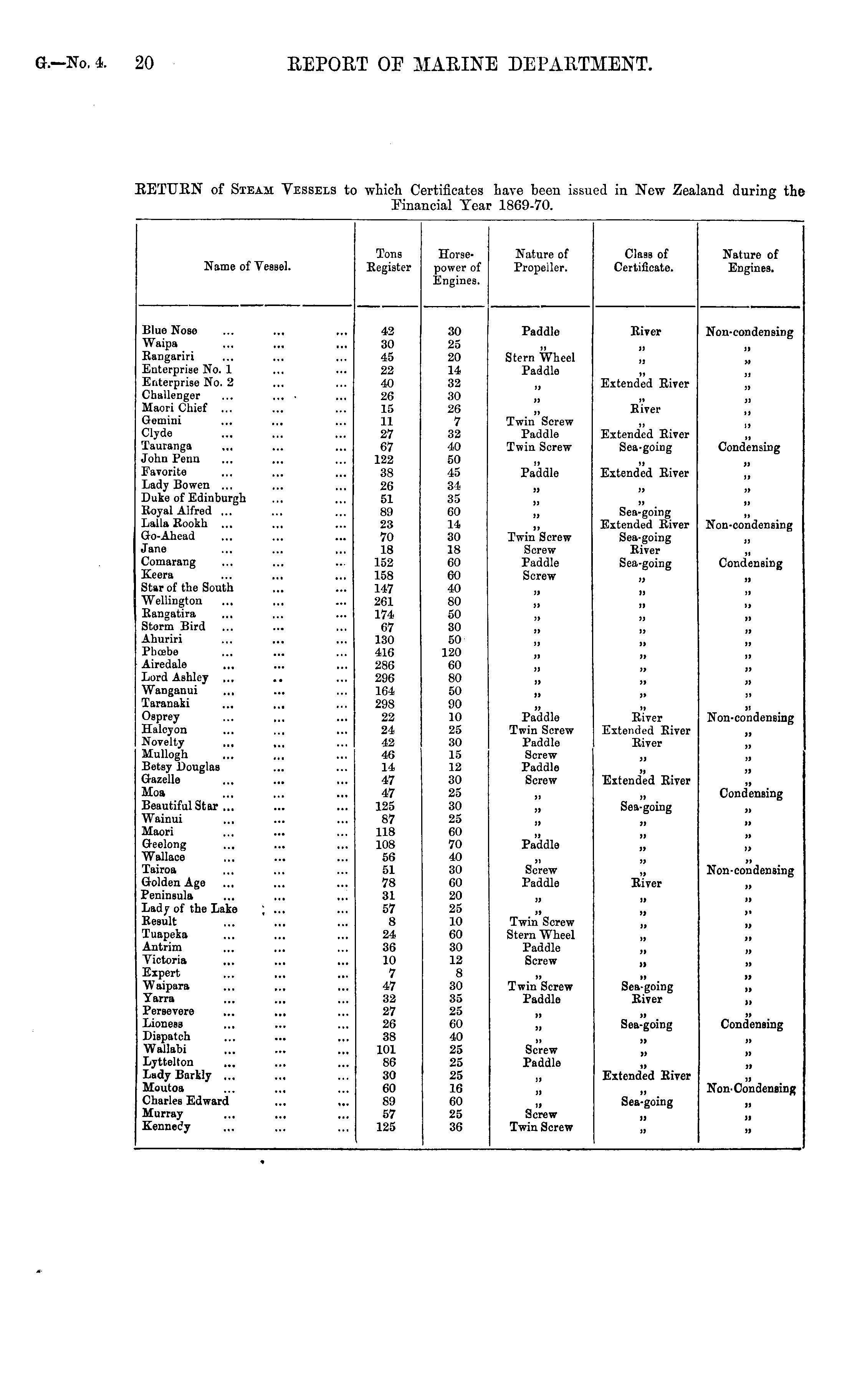 Name of Vessel. Tons Register Horsepower of Engines. Nature of Propeller. Class of Certificate. Nature of Engines. Blue Nose Waipa Rangariri Enterprise No. 1 Enterprise No. 2 Challenger Maori Chief ... Gemini Clyde Tauranga John Penn Favorite Lady Bowen ... Duke of Edinburgh Royal Alfred ... Lalla Kookh ... Go-Ahead Jane Comarang Keera Star of the South "Wellington Rangatira Storm Bird Ahuriri Phcebe Airedale ... Lord Ashley Wanganui ... Taranaki Osprey Halcyon Novelty Mullogh Betsy Douglas Gazelle Moa Beautiful Star ... Wainui Maori Geelong Wallace Tairoa Golden Age Peninsula Lady of the Lake Result Tuapeka Antrim Victoria Expert Waipara Yarra Persevere Lioness Dispatch Wailabi Lyttelton Lady Barkly ... Houtoa Charles Edward Murray Kennedy 42 30 45 22 40 26 15 11 27 67 122 38 26 51 89 23 70 18 152 158 147 261 174 67 130 416 286 296 164 298 22 24 42 46 14 47 47 125 87 118 108 56 51 78 31 57 8 24 36 10 7 47 32 27 26 38 101 86 30 60 89 57 125 30 25 20 14 32 30 26 7 32 40 50 45 34 35 60 14 30 18 60 60 40 80 50 30 50 120 60 80 50 90 10 25 30 15 12 30 25 30 25 60 70 40 30 60 20 25 10 60 30 12 8 30 35 25 60 40 25 25 25 16 60 25 36 Paddle Stern Wheel Paddle ii H H Twin Screw Paddle Twin Screw Paddle » a it Twin Screw Screw Faddle Screw M n )» ii )j M }) i> )i Paddle Twin Screw Paddle Screw Paddle Screw River ii JJ JJ Extended River n River ii Extended River Sea-going u Extended River » ii Sea-going Extended River Sea-going River Sea-going » n 31 || JJ II II » IS JJ River Extended River River Non-condensing n M )» n a a II H Condensing >} it » j) it Non-condensing M Condensing M jj it M If jj j) 3) || J) 1! Non-condensing i) a ii M n Extended River n ]) M Sea-going n Condensing » n H H )t Paddle II it H ii Screw Paddle )> it Non-condensing River M it ii Jl ii Twin Screw Stern Wheel Paddle Screw n )» n n ii n ii )t i> it Twin Screw Paddle H Sea-going River it )» ii )) jj Sea-going it Condensing 3) Screw Paddle JJ n It it )j Extended River it ii Sea-going it Non-Condensing M Screw Twin Screw H )» ii n M