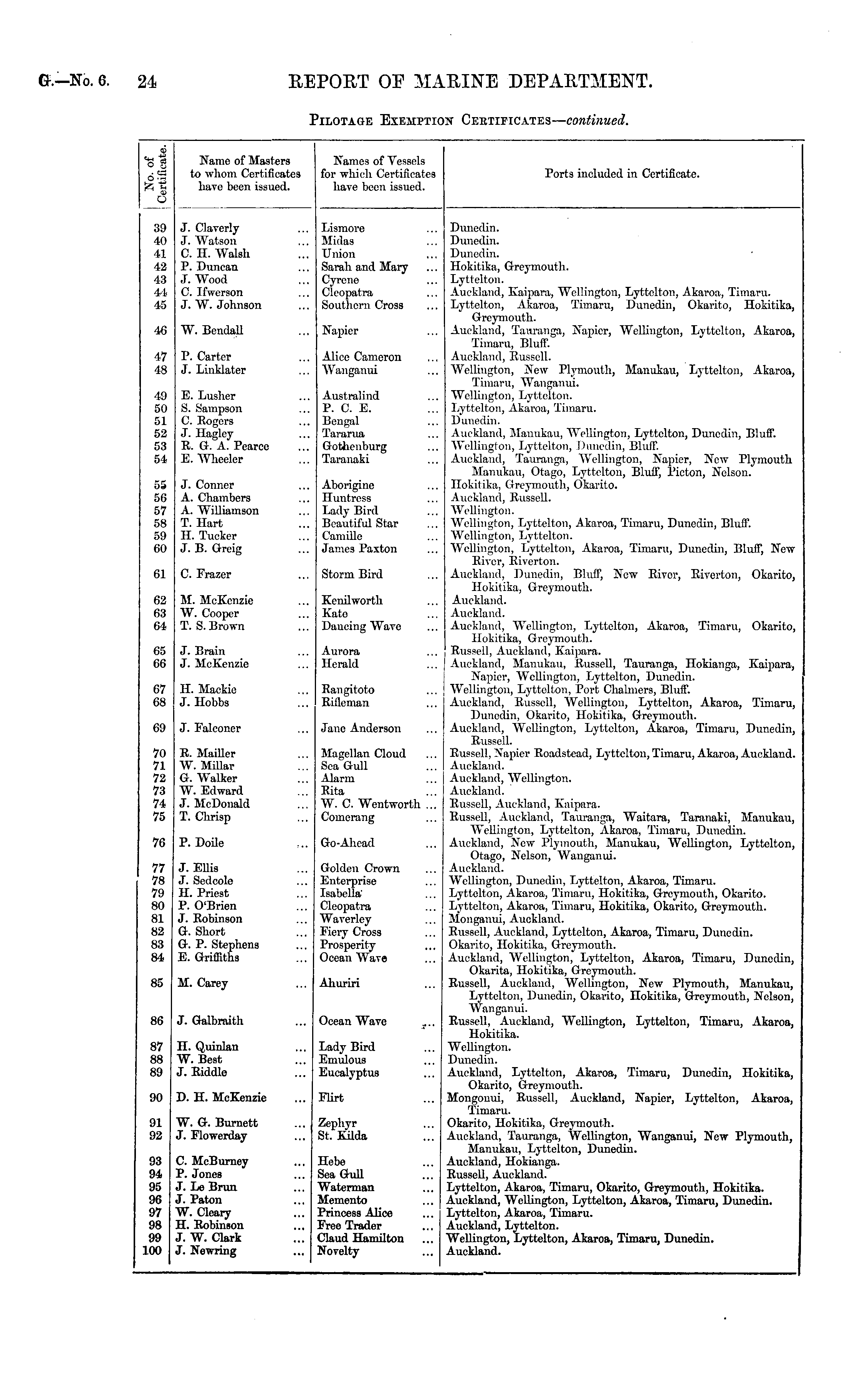 'ILOTAGE EXEMPTK in Ceetificates — continued. o 3 Name of Masters to whom Certificates have been issued. Names of Vessels for which Certificates have been issued. Ports included in Certificate. 39 10 II ■VI 43 44 45 46 47 48 49 50 r,l 62 53 54 66 66 67 58 69 60 61 62 63 64 66 66 67 68 69 J. Claverly J. Watson C. H. Walsh P. Duncan J. Wood C. Ifwerson J. W. Johnson W. Bendall P. Carter J. Linklater E. Lusher S. Sampson C. Rogers J. Hagley R. G. A. Pearce E. Wheeler J. Conner A. Chambers A. Williamson T. Hart H. Tucker J. B. Greig C. Frazer M. McKcnzie W. Cooper T. S. Brown J. Brain J. McKenzie II. Mackio J. Hobbs J. Falconer Lismore Midas TJnion Sarali and Mary Cyrene Cleopatra Soutliern Cross Napier Alice Cameron Wanganui Australind P. C. E. Bengal Tararua Gothenburg Taranaki Aborigine Huntress Lady Bird Beautiful Star Camille James Paxton Storm Bird Kenilworth Kato Dancing Ware Aurora Herald Eangitoto Eilleman Jane Anderson Dunedin. Dunedin. Dunedin. Hokitika, Greymouth. Lyttelton. Auckland, Kaipara, Wellington, Lyttelton, Akaroa, Timaru. Lyttelton, Akaroa, Timaru, Dunedin, Okarito, Hokitika, Greymouth. Auckland, Tauranga, Napier, Wellington, Lyttelton, Akaroa, Timaru, Bluff. Auckland, Russell. Wellington, New Plymouth, Manukau, Lyttelton, Akaroa, Timaru, Wanganui. Wellington, Lyttelton. Lyttelton, Akaroa, Tiinaru. Dunedin. Auckland, Manukau, Wellington, Lyttelton, Dunedin, Bluff. Wellington, Lyttelton, Dunedin, Bluff. Auckland, Tauranga, Wellington, Napier, New Plymouth Manukau, Otago, Lyttelton, Bluff, Pieton, Nelson. Hokitika, Greymouth, Okarito. Auckland, Russell. Wellington. Wellington, Lyttelton, Akaroa, Timaru, Dunedin, Bluff. Wellington, Lyttelton. Wellington, Lyttelton, Akaroa, Timaru, Dunedin, Bluff, New River, Riverton. Auckland, Dunedin, Bluff, Now River, Riverton, Okarito, Hokitika, Greymouth. Auckland. Auckland. Auckland, Wellington, Lyttelton, Akaroa, Timaru, Okarito, Hokitika, Greymouth. Russell, Auckland, Kaipara. Auckland, Manukau, Russell, Tauranga, Hokianga, Kaipara, Napier, Wellington, Lyttelton, Dunedin. Wellington, Lyttelton, Port Chalmers, Bluff. Auckland, Russell, Wellington, Lyttelton, Akaroa, Timaru, Dunedin, Okarito, Hokitika, Greymouth. Auckland, Wellington, Lyttolton, Akaroa, Timaru, Dunedin, Russell. Russell, Napier Roadstead, Lyttelton, Timaru, Akaroa, Auckland. Auckland. Auckland, Wellington. Auckland. Russell, Auckland, Kaipara. Ru9sell, Auckland, Tauranga, Waitara, Taranaki, Manukau, Wellington, Lyttelton, Akaroa, Timaru, Dunedin. Auckland, New Plymouth, Manukau, Wellington, Lyttelton, Otago, Nelson, Wanganui. Auckland. Wellington, Dunedin, Lyttelton, Akaroa, Timaru. Lyttelton, Akaroa, Timaru, Hokitika, Greymouth, Okarito. Lyttelton, Akaroa, Timaru, Hokitika, Okarito, Greymouth. Monganui, Auckland. Russell, Auckland, Lyttelton, Akaroa, Timaru, Dunedin. Okarito, Hokitika, Greymouth. Auckland, Wellington, Lyttelton, Akaroa, Timaru, Dunedin, Okarita, Hokitika, Greymouth. Russell, Auckland, Wellington, New Plymouth, Manukau, Lyttelton, Dunedin, Okarito, Hokitika, Greymouth, Nelson, Wanganui. Russell, Auckland, Wellington, Lyttelton, Timaru, Akaroa, Hokitika. Wellington. Dunedin. Auckland, Lyttelton, Akaroa, Timaru, Dunedin, Hokitika, Okarito, Greymouth. Mongonui, Russell, Auckland, Napier, Lyttelton, Akaroa, Timaru. Okarito, Hokitika, Greymouth. Auckland, Tauranga, Wellington, Wanganui, New Plymouth, Manukau, Lyttelton, Dunedin. Auckland, Hokianga. Russell, Auckland. Lyttelton, Akaroa, Timaru, Okarito, Greymouth, nokitika. Auckland, Wellington, Lyttelton, Akaroa, Timaru, Dunedin. Lyttelton, Akaroa, Timaru. Auckland, Lyttelton. Wellington, Lyttelton, Akaroa, Timaru, Dunedin. Auckland. 70 71 72 78 74 75 R. Mauler W. Millar G. Walker W. Edward J. McDonald T. Clirisp Magellan Cloud Sea Gull Alarm Rita W. C. Wentworth ... Comerang 76 P. Doile Go-Ahead 77 78 79 80 81 82 83 84 J. Ellis J. Sedcolc H. Priest P. O'Brien J. Robinson G. Short G. P. Stephens E. Griffiths Golden Crown Enterprise Isabella 1 Cleopatra Waverley Fiery Cross Prosperity Ocean Wave 85 M. Carey Ahuriri 86 J. Galbraith Ocean Wave ? .. 87 88 89 n. Quinlan W. Best J. Riddle Lady Bird Emulous Eucalyptus 90 D. H. McKenzie Flirt 91 92 W. G. Burnett J. Flowerday Zephyr St. Kilda 93 94 95 96 97 98 99 100 C. McBurney P. Jones J. Le Brun J. Paton W. Cleary H. Robinson J. W. Clark J. Newring Hebe Sea Gull Waterman Memento Princess Alice Free Trader Claud Hamilton Novelty