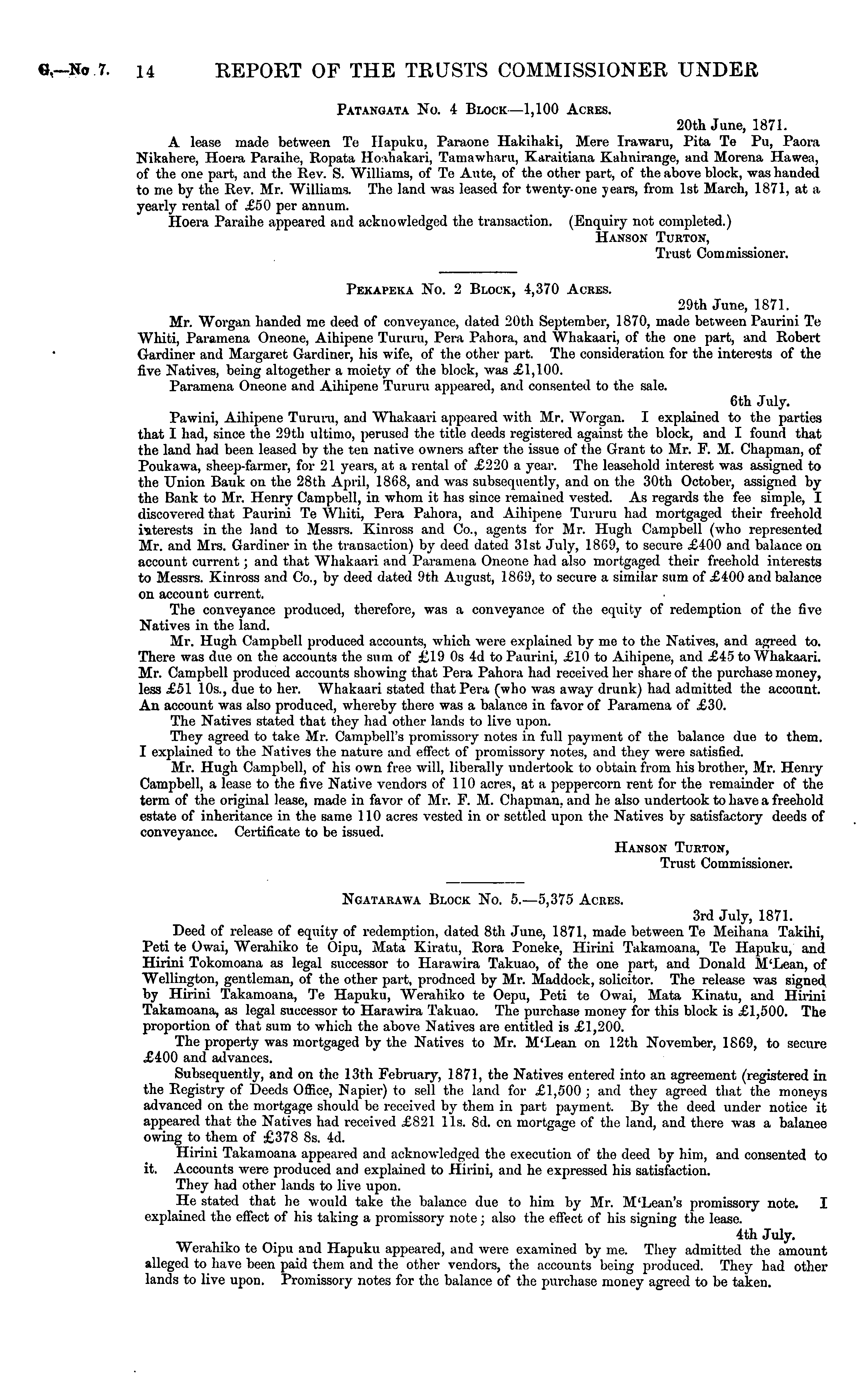 Patangata No. 4 Block—l,loo Acres. 20th June, 1871. A lease made between Te Ilapuku, Paraone Hakihaki, Mere Irawaru, Pita Te Pu, Paora Nikahere, Hoera Paraihe, Ropata Hoahakari, Tamawharu, Karaitiana Kalinirange, and Morena Hawea, of the one part, and the Rev. S. Williams, of Te Ante, of the other part, of the above block, was handed to me by the Rev. Mr. Williams. The land was leased for twenty-one years, from Ist March, 1871, at a yearly rental of .£5O per annum. Hoera Paraihe appeared and acknowledged the transaction. (Enquiry not completed.) Hanson Turton, Trust Commissioner. Pekapeka No. 2 Block, 4,370 Acres. 29th June, 1871. Mr. Worgan handed me deed of conveyance, dated 20th September, 1870, made between Paurini Te Whiti, Paramena Oneone, Aihipene Tururu, Pera Pahora, and Whakaari, of the one part, and Robert Gardiner and Margaret Gardiner, his wife, of the other part. The consideration for the interests of the five Natives, being altogether a moiety of the block, was £1,100. Paramena Oneone and Aihipene Tururu appeared, and consented to the sale. 6th July. Pawini, Aihipene Tururu, and Whakaari appeared with Mr. Worgan. I explained to the parties that I had, since the 29th ultimo, perused the title deeds registered against the block, and I found that the land had been leased by the ten native owners after the issue of the Grant to Mr. F. M. Chapman, of Poukawa, sheep-farmer, for 21 years, at a rental of £220 a year. The leasehold interest was assigned to the Union Bauk on the 28th April, 18G8, and was subsequently, and on the 30th October, assigned by the Bank to Mr. Henry Campbell, in whom it has since remained vested. As regards the fee simple, I discovered that Paurini Te Whiti, Pera Pahora, and Aihipene Tururu had mortgaged their freehold interests in the land to Messrs. Kinross and Co., agents for Mr. Hugh Campbell (who represented Mr. and Mrs. Gardiner in the transaction) by deed dated 31st July, 1869, to secure £400 and balance on account cui-rent; and that Whakaari and Paramena Oneone had also mortgaged their freehold interests to Messrs. Kinross and Co., by deed dated 9th August, 18GD, to secure a similar sum of £400 and balance on account current. The conveyance produced, therefore, was a conveyance of the equity of redemption of the five Natives in the land. Mr. Hugh Campbell produced accounts, which were explained by me to the Natives, and agreed to. There was due on the accounts the sum of £19 0s 4d to Paurini, £10 to Aihipene, and £45 to Whakaari. Mr. Campbell produced accounts showing that Pera Pahora had received her share of the purchase money, less £51 10s., due to her. Whakaari stated that Pera (who was away drunk) had admitted the account. An account was also produced, whereby there was a balance in favor of Paramena of £30. The Natives stated that they had other lands to live upon. They agreed to take Mr. Campbell's promissory notes in full payment of the balance due to them. I explained to the Natives the nature and effect of promissory notes, and they were satisfied. Mr. Hugh Campbell, of his own free will, liberally undertook to obtain from his brother, Mr. Henry Campbell, a lease to the five Native vendors of 110 acres, at a peppercorn rent for the remainder of the term of the original lease, made in favor of Mr. F. M. Chapman, and he also undertook to have a freehold estate of inheritance in the same 110 acres vested in or settled upon the Natives by satisfactory deeds of conveyance. Certificate to be issued. Hanson Tueton, Trust Commissioner. Ngatarawa Block No. 5.—5,375 Acres. 3rd July, 1871. Deed of release of equity of redemption, dated Bth June, 1871, made between Te Meihana Takihi, Peti te Owai, Werahiko te Oipu, Mata Kiratu, Rora Poneke, Hirini Takamoana, Te Hapuku, and Hirini Tokomoana as legal successor to Harawira Takuao, of the one part, and Donald M'Lean, of Wellington, gentleman, of the other part, prodnced by Mr. Maddock, solicitor. The release was signed by Hirini Takamoana, Te Hapuku, Werahiko te Oepu, Peti te Owai, Mata Kinatu, and Hirini Takamoana, as legal successor to Harawira Takuao. The purchase money for this block is £1,500. The proportion of that sum to which the above Natives are entitled is £1,200. The property was mortgaged by the Natives to Mr. M'Lean on 12th November, 1869, to secure £400 and advances. Subsequently, and on the 13th February, 1871, the Natives entered into an agreement (registered in the Registry of Deeds Office, Napier) to sell the land for £1,500 ; and they agreed that the moneys advanced on the mortgage should bo received by them in part payment. By the deed under notice it appeared that the Natives had received £821 lls. Bd. on mortgage of the land, and there was a balanee owing to them of £378 Bs. 4d. Hirini Takamoana appeared and acknowledged the execution of the deed by him, and consented to it. Accounts were produced and explained to Hirini, and he expressed his satisfaction. They had other lands to live upon. He stated that he would take the balance due to him by Mr. M'Lean's promissory note. I explained the effect of his taking a promissory note; also the effect of his signing the lease. 4th July. Werahiko te Oipu and Hapuku appeared, and were examined by me. They admitted the amount alleged to have been paid them and the other vendors, the accounts being produced. They had other lands to live upon. Promissory notes for the balance of the purchase money agreed to be taken.