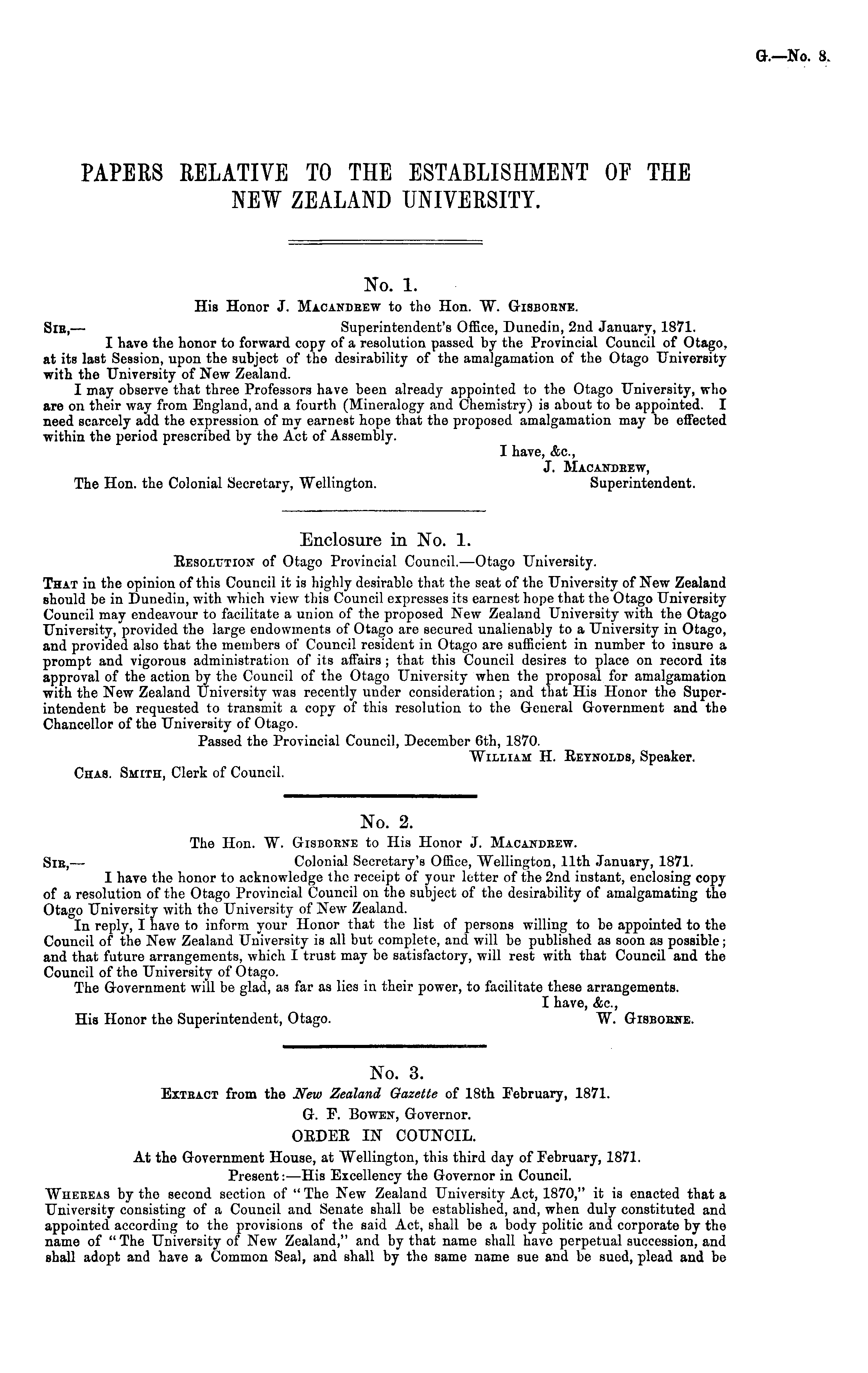 No. 1. His Honor J. Macandbew to tho Hon. W. Gisboene. Sie, — Superintendent's Office, Dunedin, 2nd January, 1871. I have the honor to forward copy of a resolution passed by the Provincial Council of Otago, at its last Session, upon the subject of the desirability of the amalgamation of the Otago University with the University of New Zealand. I may observe that three Professors have been already appointed to tho Otago University, who are on their way from England, and a fourth (Mineralogy and Chemistry) is about to be appointed. I need scarcely add the expression of my earnest hope that the proposed amalgamation may be effected within the period prescribed by the Act of Assembly. I have, Ac, J. Macandrew, The Hon. the Colonial Secretary, Wellington. Superintendent.