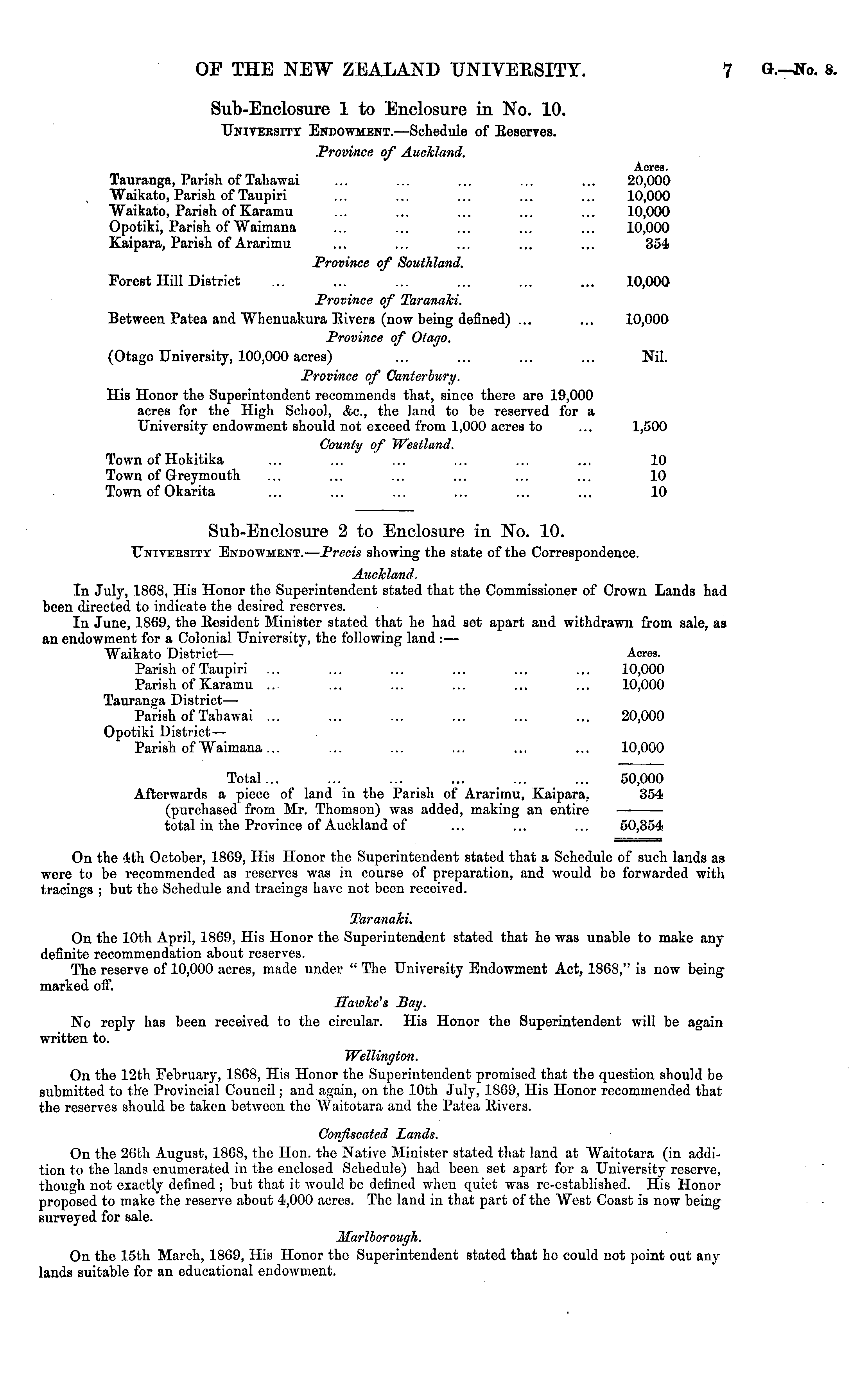 Sub-Enclosure 1 to Enclosure in No. 10. Univeesitt Endowment.—Schedule of Eeserves. Province of Auckland. Acres. Tauranga, Parish of Tahawai ... ... ... ... ... 20,000 x Waikato, Parish of Taupiri ... ... ... ... ... 10,000 Waikato, Parish of Karamu ... ... ... ... ... 10,000 Opotiki, Parish of Waimana ... ... ... ... ... 10,000 Kaipara, Parish of Ararimu ... ... ... ... ... 354 Province of Southland. Forest Hill District ... ... ... ... ... ... 10,000 Province of Taranaki. Between Patea and Whenuakura Bivers (now being defined) ... ... 10,000 Province of Otago. (Otago University, 100,000 acres) ... ... ... ... Nil. Province of Canterbury. His Honor the Superintendent recommends that, since there are 19,000 acres for the High School, Ac, the land to be reserved for a University endowment should not exceed from 1,000 acres to ... 1,500 County of Westland. Town of Hokitika ... ... " ... ... ... ... 10 Town of Greymouth ... ... ... ... ... ... 10 Town of Okarita ... ... ... ... ... ... 10 Sub-Enclosure 2 to Enclosure in No. 10. Univeesity Endowment. — Precis showing the state of the Correspondence. Auckland. In July, 1868, His Honor the Superintendent stated that the Commissioner of Crown Lands had been directed to indicate the desired reserves. In June, 1869, the Eesident Minister stated that he had set apart and withdrawn from sale, as an endowment for a Colonial University, the following land : — Waikato District— Acres. Parish of Taupiri ... ... ... ... ... ... 10,000 Parish of Karamu ... ... ... ... ... ... 10,000 Tauranea District — Parish of Tahawai ... ... ... ... ... ... 20,000 Opotiki District— Parish of Waimana... ... ... ... ... ... 10,000 Total... ... ... ... ... ... 50,000 Afterwards a piece of land in the Parish of Ararimu, K!aipara, 354 (purchased from Mr. Thomson) was added, making an entire — total in the Province of Auckland of ... ... ... 50,354 On the 4th October, 1869, His Honor the Superintendent stated that a Schedule of such lands as were to be recommended as reserves was in course of preparation, and would be forwarded with tracings ; but the Schedule and tracings have not been received. Taranaki. On the 10th April, 1869, His Honor the Superintendent stated that he was unable to make anydefinite recommendation about reserves. The reserve of 10,000 acres, made under " The University Endowment Act, 1868," is now being marked off. Hawke's Bay. No reply has been received to the circular. His Honor the Superintendent will be again written to. Wellington. On the 12th February, 1868, His Honor the Superintendent promised that the question should be submitted to the Provincial Council; and again, on the 10th July, 1869, His Honor recommended that the reserves should be taken between the AVaitotara and the Patea Eivers. Confiscated Lands. On the 26th August, 1868, the Hon. the Native Minister stated that land at AVaitotara (in addition to the lands enumerated in the enclosed Schedule) had been set apart for a University reserve, though not exactly defined ; but that it would be defined when quiet was re-established. His Honor proposed to make the reserve about 4,000 acres. The land in that part of the West Coast is now being surveyed for sale. Marlborough. On the 15th March, 1569, His Honor the Superintendent stated that ho could not point out any lands suitable for an educational endowment.