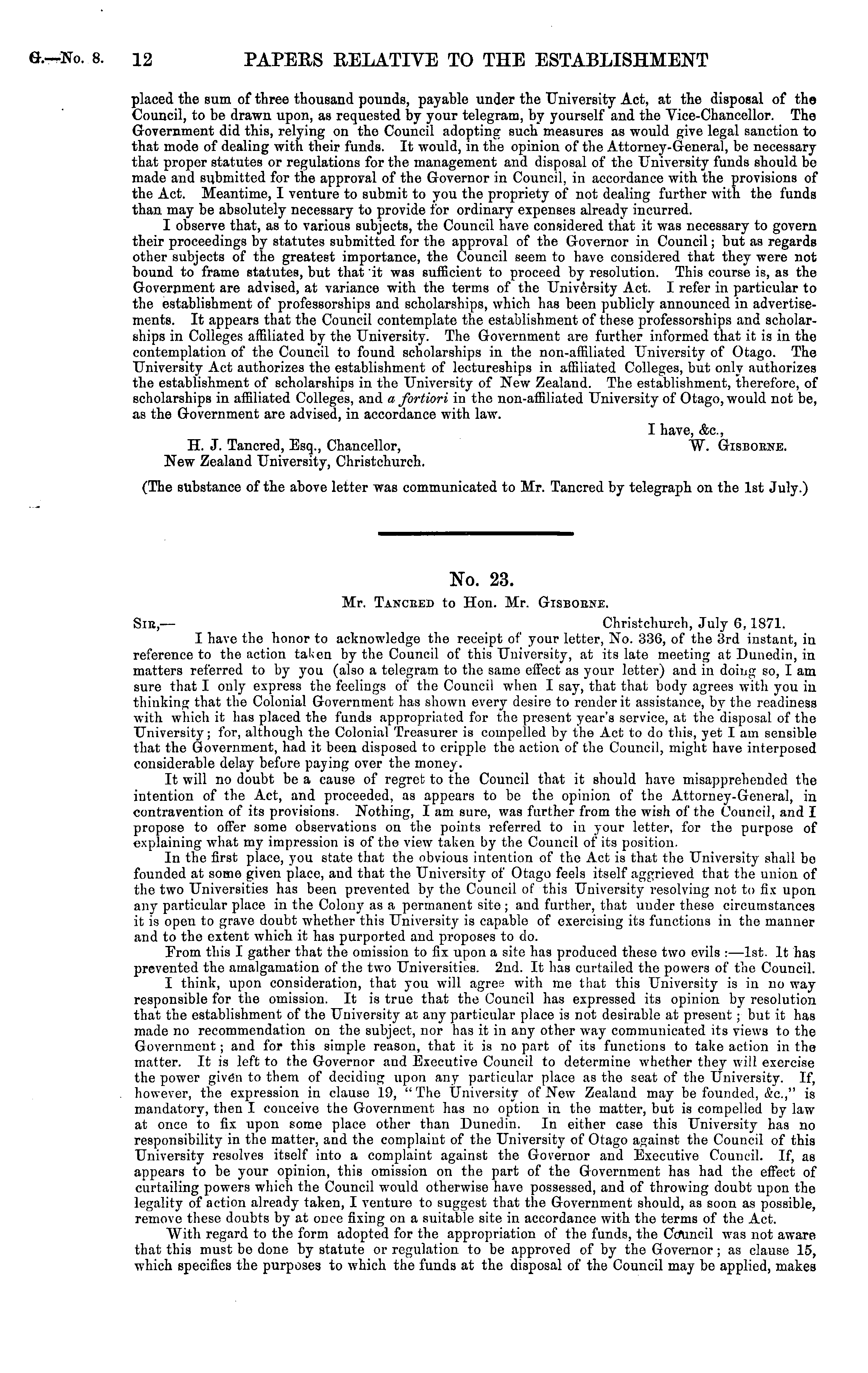 No. 23. Mr. Tanceed to Hon. Mr. Gisbobne. Sie,— Christchurch, July 6,1871. I have the honor to acknowledge the receipt of your letter, No. 336, of the 3rd instant, in reference to the action taken by the Council of this University, at its late meeting at Dunedin, in matters referred to by you (also a telegram to tho same effect as your letter) and in doing so, I am sure that I only express the feelings of the Council when I say, that that body agrees with you in thiuking that the Colonial Government has shown every desire to render it assistance, by the readiness with which it has placed the funds appropriated for the present year's service, at the disposal of the University; for, although the Colonial Treasurer is compelled by the Act to do this, yet lam sensible that the Government, had it been disposed to cripple the action of the Council, might have interposed considerable delay before paying over the money. It will no doubt be a cause of regret to the Council that it should have misapprehended the intention of the Act, and proceeded, as appears to be the opinion of the Attorney-General, in contravention of its provisions. Nothing, lam sure, was further from the wish of the Council, and I propose to offer some observations on the points referred to in your letter, for the purpose of explaining what my impression is of the view taken by the Council of its position. In the first place, you state that the obvious intention of the Act is that the University shall be founded at some given place, and that the University of Otago feels itself aggrieved that the union of the two Universities has been prevented by the Council of this University resolving not to fix upon any particular place in the Colony as a permanent site ; and further, that under these circumstances it is open to grave doubt whether this University is capable of exercising its functions in the manner and to the extent which it has purported and proposes to do. From this I gather that the omission to fix upon a site has produced these two evils : —lst. It has prevented the amalgamation of the two Universities. 2nd. It has curtailed the powers of the Council. I think, upon consideration, that you will agree with me that this University is in no way responsible for the omission. It is true that the Council has expressed its opinion by resolution that the establishment of the University at any particular place is not desirable at present; but it has made no recommendation on the subject, nor has it in any other way communicated its views to the Government; and for this simple reason, that it is no part of its functions to take action in the matter. It is left to the Governor and Executive Council to determine whether they will exercise the power given to them of deciding upon any particular place as the seat of the University. If, however, the expression in clause 19, "The University of New Zealand may be founded, &c," is mandatory, then I conceive the Government has no option in the matter, but is compelled by law at once to fix upon some place other than Dunedin. In either case this University has no responsibility in the matter, and the complaint of the University of Otago against the Council of this University resolves itself into a complaint against the Governor and Executive Council. If, as appears to be your opinion, this omission on the part of the Government has had the effect of curtailing powers which the Council would otherwise have possessed, and of throwing doubt upon the legality of action already taken, I venture to suggest that the Government should, as soon as possible, remove these doubts by at once fixing on a suitable site in accordance with the terms of the Act. With regard to the form adopted for the appropriation of the funds, the Council was not aware that this must be done by statute or regulation to be approved of by the Governor; as clause 15, which specifies the purposes to which the funds at the disposal of the Council may be applied, makes
