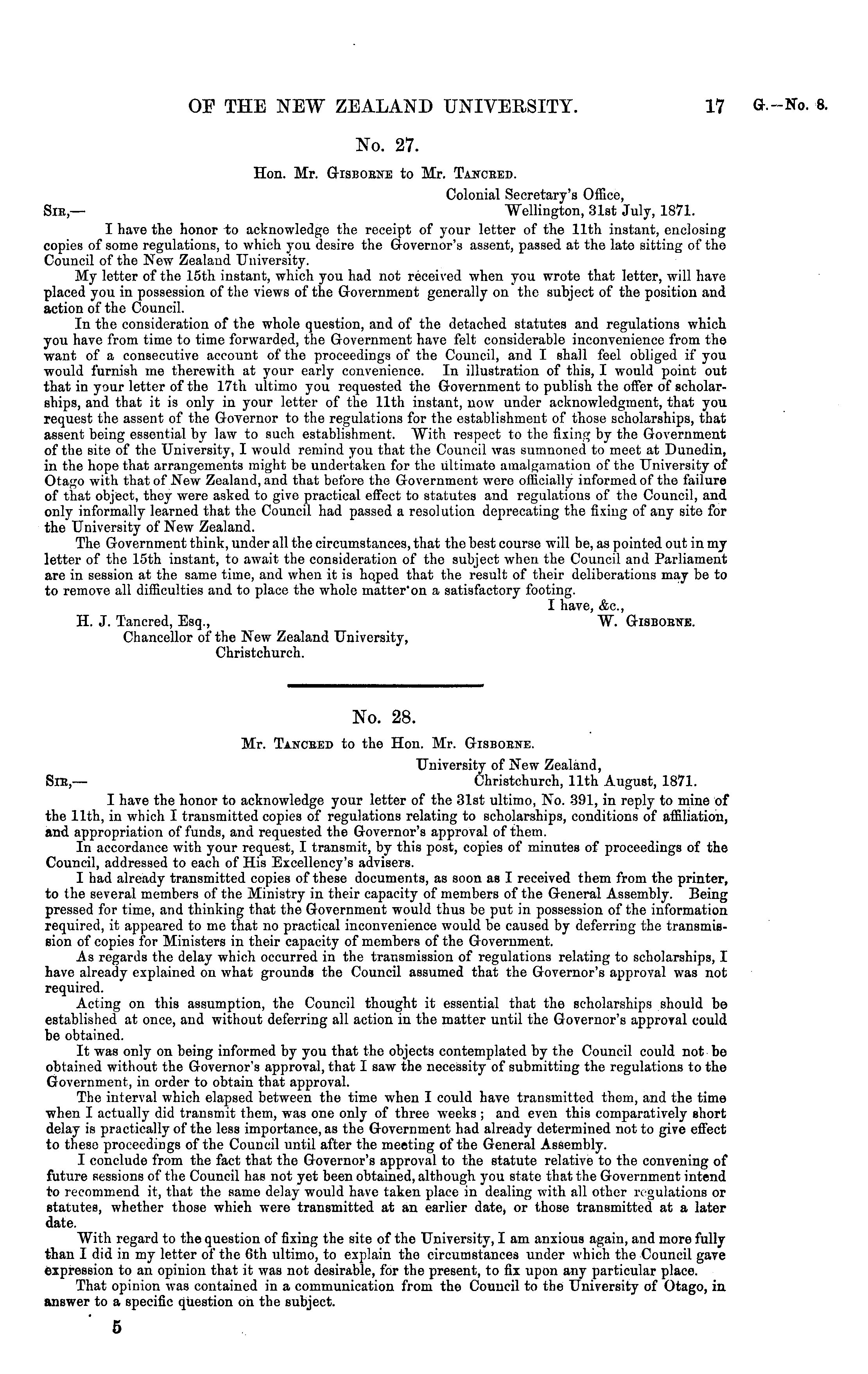 No. 27. Hon. Mr. Gisbobne to Mr. Tancbed. Colonial Secretary's Office, Sir,— Wellington, 31st July, 1871. I have the honor to acknowledge the receipt of your letter of the 11th instant, enclosing copies of some regulations, to which you desire the Governor's assent, passed at the late sitting of the Council of the New Zealand University. My letter of the 15th instant, which you had not received when you wrote that letter, will have placed you in possession of the views of the Government generally on the subject of the position and action of the Council. In the consideration of the whole question, and of the detached statutes and regulations which you have from time to time forwarded, the Government have felt considerable inconvenience from the want of a consecutive account of the proceedings of the Council, and I shall feel obliged if you would furnish me therewith at your early convenience. In illustration of this, I would point out that in your letter of the 17th ultimo you requested the Government to publish the offer of scholarships, and that it is only in your letter of the 11th instant, now under acknowledgment, that you request the assent of the Governor to the regulations for the establishment of those scholarships, that assent being essential by law to such establishment. AVith respect to the fixing by the Government of the site of the University, I would remind you that the Council was sumnoned to meet at Dunedin, in the hope that arrangements might be undertaken for the ultimate amalgamation of the University of Otago with that of New Zealand, and that before the Government were officially informed of the failure of that object, they were asked to give practical effect to statutes and regulations of the Council, and only informally learned that the Council had passed a resolution deprecating the fixing of any site for the University of New Zealand. The Government think, under all the circumstances, that the best course will be, as pointed out in my letter of the 15th instant, to await the consideration of the subject when the Council and Parliament are in session at the same time, and when it is ho.ped that the result of their deliberations may be to to remove all difficulties and to place the whole matter'on a satisfactory footing. I have, Ac, H. J. Tancred, Esq., W. Gisborne. Chancellor of the New Zealand University, Christchurch.
