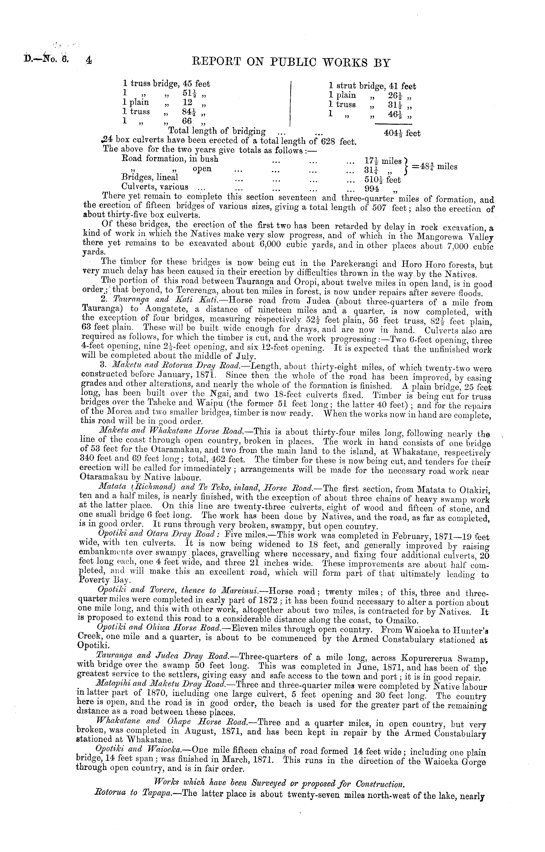 1 truss bridge, 45 feet 1 s t ru fc bridge, 41 feet 1 » „ 5H „ 1 plain „ 26-i- „ 1 plain „ 12 „ 1 truss „ 3H „ 1 truss „ 84^- „ 1 4ri 1 » „ t>6 „ Total length of bridging ... ... 404* feet .24 box culverts have been erected of a total length of 628 feet. The above for the two years give totals as follows :— Road formation, in bush I7i -milpO „ open 31| n j =48| miles Bridges, lineal ... ... ... ... 510 a f ee t Culverts, various ... ... ... 994 There yet remain to complete this section seventeen and three-quarter" miles of formation and the erection of fifteen bridges of various sizes, giving a total length of 507 feet; also the erection of about thirty-five box culverts. •j °J theSe brid Ses> the erection of the first two has been retarded by delay in rock excavation a kind of work in which the Natives make very slow progress, and of which in the Mangorewa Valley there yet remains to bo excavated about 6,000 cubic yards, and in other places about 7 000 cubic yards. The timber for these bridges is now being cut in the Parekerangi and Horo Horo forests but very much delay has been caused in their erection by difficulties thrown in the way by the Natives. The portion of this road between Tauranga and Oropi, about twelve miles in open land, is in good order.; "that beyond, to Tererenga, about ten miles in forest, is now under repairs after severe floods 2. Tauranga and Kati Kati—Rovae road from Judea (about three-quarters of a mile from Tauranga) to Aongatete, a distance of nineteen miles and a quarter, is now completed with the exception of four bridges, measuring respectively 52| feet plain, 56 feet truss, 82i- feet'plain 63 feet plain. These will be built wide enough for drays, and are now in hand. Culverts also are required as follows, for which the timber is cut, and the work progressing:— Two 6-feet opening three 4-feet opening, nine 2-J-feefc opening, and six 12-feet opening. It is expected that the unfinished work will be completed about the middle of July. 3. Maketu and Rotorua Bray Boad.— -Length, about thirty-eight miles, of which twenty-two were constructed before January, 187.1. Since then the whole of the road has been improved, by easing grades and other alterations, and nearly the whole of the formation is finished. A plain bridge 25 feet long, has been built over the Ngai, and two 18-feet culverts fixed. Timber is being cut for truss bridges over the Taheke and Waipu (the former 51 feet long ; the latter 40 feet) ; and for the repairs of the Morea and two smaller bridges, timber is now ready. When the works now in hand are complete this road will be 111 good order. Maketu mid Whakatane Horse Boad,— -This is about thirty-four miles long, following nearly the line of the coast through open country, broken in places. The work in hand consists o°f one bridge ot oS feet for the Otaramakau, and two from the main land to the island, at Whakatane respectively 340 feet and 69 feet long; total, 462 feet. The timber for these is now being cut, and tenders for their erection will be called for immediately ; arrangements will be made for the necessary road work near Otaramakau by Native labour. Matata [Richmond) and Te Teko, inland, Horse Boad.—The first section, from Matata to Otakiri ten and a half miles, is nearly finished, with the exception of about three chains of heavy swamp work at the latter place. On this line are twenty-three culverts, eight of wood and fifteen" of stone and one small bridge 6 feet long. The work has been done by Natives, and the road, as far as completed is in good order. It runs through very broken, swampy, but open country. _ Opotiki and Otara Bray Boad : Five miles.—This work was completed in February 1871—19 feet wide, with ten culverts. It is now being widened to 18 feet, and generally improved by raising embankments over swampy places, gravelling where necessary, and fixing four additional culverts 20 feet long each, one 4 feet wide, and three 21 inches wide. These improvements are about half completed, and will make this an excellent road, which will form part of that ultimately leading to Poverty Bay. J b Opotiki and Torere, thence to Mareinui — -Horse road; twenty miles; of this, three and threequarter miles were completed in early part of 1872 ; it has been found necessary to alter a portion about one mile long, and this with other work, altogether about two miles, is contracted for by Natives. It is proposed to extend this road to a considerable distance along the coast, to Omaiko. Opotiki and Oliiwa Horse Boad.— Eleven miles through open country. From Waioeka to Hunter's Creek one mile and a quarter, is about to be commenced by the Armed Constabulary stationed at Opotiki. J _ Tauranga and Judea Bray Boad.— Three-quarters of a mile long, across Kopurererua Swamp with bridge over the swamp 50 feet long. This was completed in June, 1871, and has been of the greatest service to the settlers, giving easy and safe access to the town and port; it is in good repair Matapihi and Maketu Bray Boad— -Three and three-quarter miles were completed by Native labour in latter part of 1870, including one large culvert, 5 feet opening and 30 feet long. The country here is open, and the road is in good order, the beach is used for the greater part of the remaining distance as a road between these places. Whakatane and Ohape Horse Boad.— Three and a quarter miles, in open country but very broken, was completed in August, 1871, and has been kept in repair by the Armed Constabulary stationed at Whakatane. J Opotiki and Waioeka.—One mile fifteen chains of road formed 14 feet wide; including one plain bridge, 14 feet span; was finished in March, 1871. This runs in the direction of the Waioeka Gorge through open country, and is in fair order. Works which have been Surveyed or proposed for Construction. Rotorua to Tapapa.—The latter place is about twenty-seven miles north-west of the lake, nearly