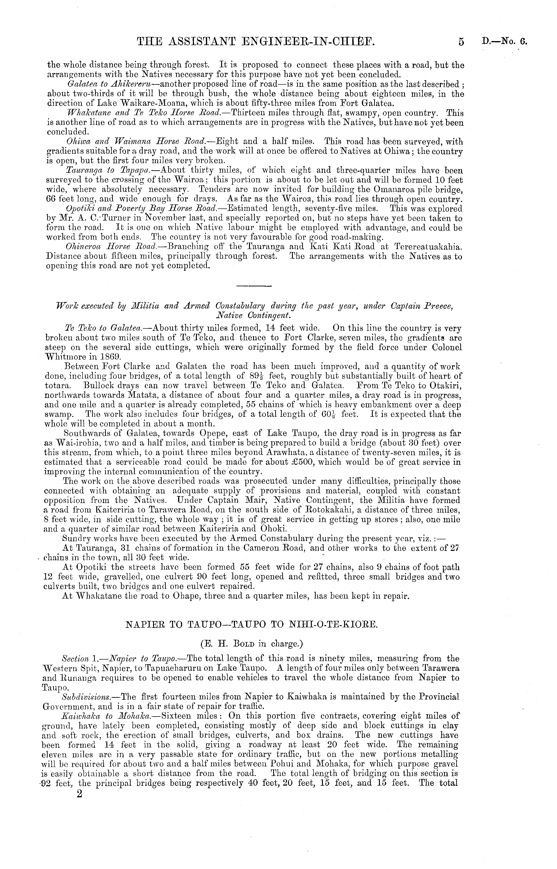 the whole distance being through forest. It is proposed to connect these places with a road, but the arrangements with the Natives necessary for this purpose have not yet been concluded. Galatea to Aliikereru —another proposed line of road —is in the same position as the last described ; about two-thirds of it will be through bush, the whole distance being about eighteen miles, in the direction of Lake Waikare-Moana, which is about fifty-three miles from Fort Galatea. WhaJcatane and Te Teho Horse Road. —Thirteen miles through flat, swampy, open country. This is another line of road as to which arrangements are in progress with the Natives, but have not yet been concluded. Ohiwa and Waimana Horse Road. —Eight and a half miles. This road has been surveyed, with gradients suitable for a dray road, and the work will at once be offered to Natives at Ohiwa; the country is open, but the first four miles very broken. Tauranga to Tapapa. —About thirty miles, of which eight and three-quarter miles have been surveyed to the crossing of the Wairoa; this portion is about to be let out and will be formed 10 feet wide, where absolutely necessary. Tenders are now invited for building the Omanaroa pile bridge, 66 feet long, and wide enough for drays. As far as the Wairoa, this road lies through open country. Opotilci and Poverty Bay Horse Road. —Estimated length, seventy-five miles. This was explored by Mr. A. C.'Turner in November last, and specially reported on, but no steps have yet been taken to form the road. It is one on which Native labour might be employed with advantage, and could bo worked from both ends. The country is not very favourable for good road-making. Ohineroa Horse Road. —Branching off the Tauranga and Kati Kati Road at Terereatuakahia. Distance about fifteen miles, principally through forest. The arrangements with the Natives as to opening this road are not yet completed.