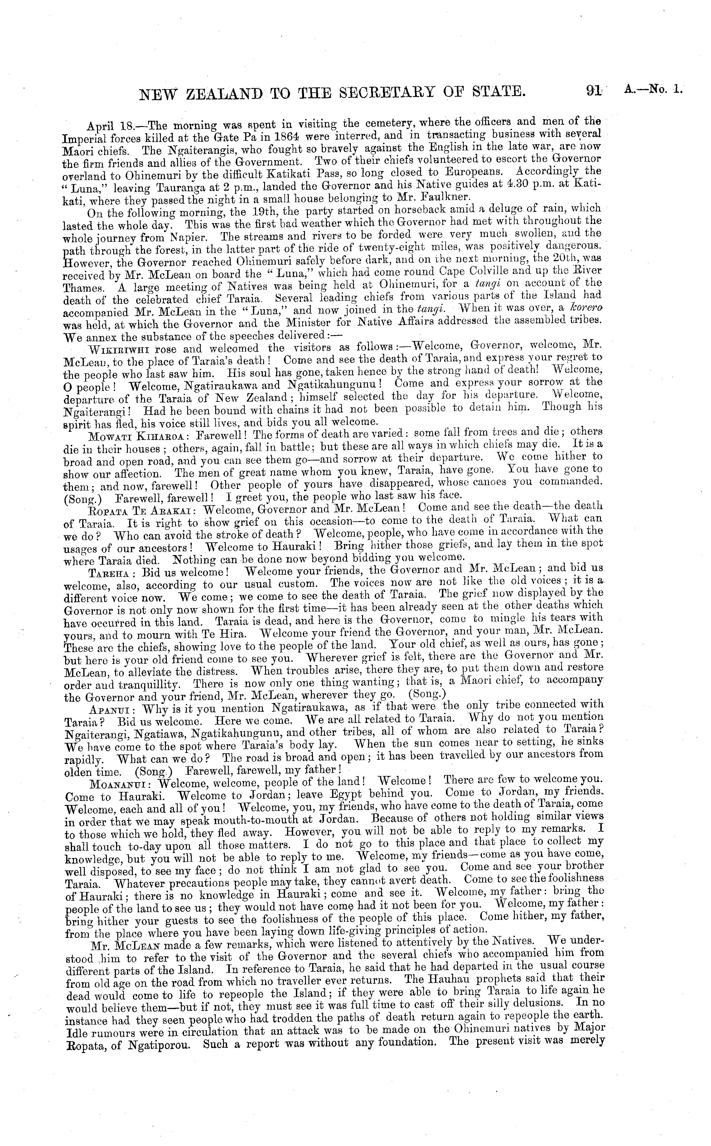 April is _The morning was spent in visiting the cemetery, where the officers and men of the Imperial forces killed at the Gate Pa in 1864 were interred, and in transacting business with several Maori chiefs The Ngaiterangis, who fought so bravely against the English in the late war, are now the firm friends and allies of the Government. Two of their chiefs volunteered to escort the Governor overland to Ohinemuri by the difficult Katikati Pass, so long closed to Europeans. Accordingly the " Luna," leaving Tauranga at 2 p.m., landed the Governor and his Native guides at 4.30 p.m. at Katikati where they° passed the night in a small house belonging to Mr. Faulkner On the following morning, the 19th, the party started on horseback amid a deluge ot rain, which lasted the whole day. This was the first bad weather which the Governor had met with throughout the whole iournev from Napier. The streams and rivers to be forded were very much swollen, and tne path through the forest, in the latter part of the ride of twenty-eight miles, was positively dangerous. However the Governor reached Ohinemuri safely before dark, and on the next morning the 20in was received by Mr. McLean on board the " Luna," which had come round Cape Colville and up the Eiver Thames A large meeting of Natives was being held at Ohinemuri, for a tangi on account ot the death of the celebrated chief Taraia. Several leading chiefs from various parts of the Island had accompanied Mr. McLean in the "Luna," and now joined in the tangi. When it was over a korero was held, at which the Governor and the Minister for Native Affairs addressed the assembled tribes. We annex the substance of the speeches delivered:— Wikiriwhi rose and welcomed the visitors as follows :—Welcome, Governor, welcome, Mr. McLean to the place of Taraia's death ! Come and see the death of Taraia, and express your regret to the people who last saw him. His soul has gone, taken hence by the strong hand of death! Welcome, O people,' Welcome, Ngatiraukawa and Ngatikahungunu ! Come and express your sorrow at the departure of the Taraia of New Zealand; himself selected the day for his departure. Welcome, Ngaiterangi! Had he been bound with chains it had not been possible to detain him. Ihough his spirit has fled, his voice still lives, and bids you all welcome. Mowati Kiharoa : Farewell! The forms of death are varied: some fall from trees and die ; others die in their houses ; others, again, fall in battle; but these are all ways in which chiefs may die It is a broad and open road, and you can see them go—and sorrow at their departure. We come hither to show our affection. The men of great name whom you knew, Taraia, have gone, lou have gone to them; and now, farewell! Other people of yours have disappeared, whose, canoes you commanded. (Song.) Farewell, farewell! I greet you, the people who last saw his face. Eopata Te Aeakai : Welcome, Governor and Mr. McLean ! Come and see the death—the death of Taraia It is right to show grief on this occasion—to come to the death of Taraia. What can we do ? Who can avoid the stroke of death ? Welcome, people, who have come m accordance with the usages of our ancestors ! Welcome to Hauraki! Bring hither those griefs, and lay them in the spot where Taraia died. Nothing can -be done now beyond bidding you welcome. Tareha • Bid us welcome! Welcome your friends, the Governor and Mr. McLean ;_ and bid us welcome, also, according to our usual custom. The voices now are not like the old voices ;itis a different voice now. We come ;we come to see the death of Taraia. The grief now displayed by the Governor is not only now shown for the first time—it has been already seen at the other deaths which have occurred in this land. Taraia is dead, and here is the Governor, come to mingle his tears with yours and to mourn with To Hira. Welcome your friend the Governor, and your man, Mr McLean. These are the chiefs, showing love to the people of the land. Tour old chief, as well as ours, has gone ; but hero is your old friend come to see you. Wherever grief is felt, there are the Governor and Mr. McLean to alleviate the distress. When troubles arise, there they are, to put them down and restore order and tranquillity. There is now only one thing wanting; that is, a Maori chief, to accompany the Governor and your friend, Mr. McLean, wherever they go. (Song.) . Apanui • Why is it you mention Ngatiraukawa, as if that were the only tribe connected with Taraia ? Bid us welcome. Here we come. We are all related to Taraia. Why do not you mention Ngaiterangi, Ngatiawa, Ngatikahungunu, and other tribes, all of whom are also related to laraia • We have come to the spot where Taraia's body lay. When the sun comes near to setting, he sinks rapidly. What can we do ? The road is broad and open ; it has been travelled by our ancestors from olden 'time. (Song.) Farewell, farewell, my father ! Moananui • Welcome, welcome, people of the land! Welcome ! There are few to welcome you. Come to Hauraki. Welcome to Jordan; leave Egypt behind you. Come to Jordan my friends. Welcome, each and all of you! Welcome, you, my friends, who have come to the death of laraia, come in order that we may speak mouth-to-mouth at Jordan. Because of others not holding similar views to those which we hold, they fled away. However, you will not be able to reply to my remarks. I shall touch to-day upon all those matters. I do not go to this place and that place to collect my knowledge, but you will not be able to reply to me. Welcome, my friends-come as you have come, well disposed, to see my face ;do not think lam not glad to see you. Come and see your brother Taraia Whatever precautions people may take, they cannot avert death. Come to see the foolishness of Hauraki; there is no knowledge in Hauraki; come and see it. Welcome, my father: bring the people of the land to see us ; they would not have come had it not been for you Welcome, my fattier : bring hither your guest