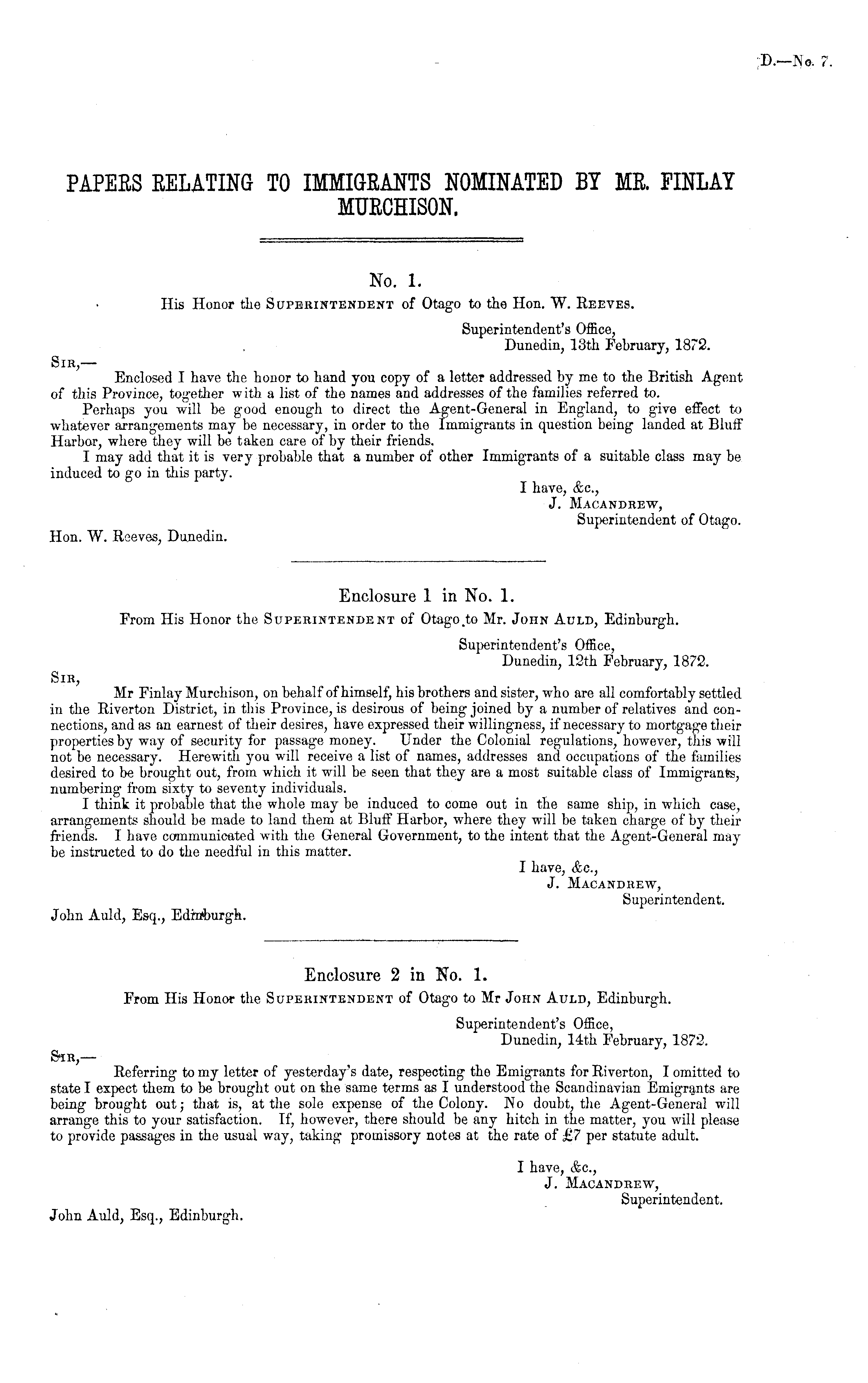 No. 1. His Honor the Superintendent of Otago to the Hon. W. Reeves. Superintendent's Office, Dunedin, 13th February, 1872. Sir, — Enclosed I have the honor to hand you copy of a letter addressed by me to the British Agent of this Province, together with a list of the names and addresses of the families referred to. Perhaps you will be good enough to direct the Agent-General in England, to give effect to whatever arrangements may be necessary, in order to the Immigrants in question being landed at Bluff Harbor, where they will be taken care of by their friends. I may add that it is very probable that a number of other Immigrants of a suitable class may be induced to go in this party. I have, &c, J. Macandrew, Superintendent of Otago. Hon. W. Reeves, Dunedin.