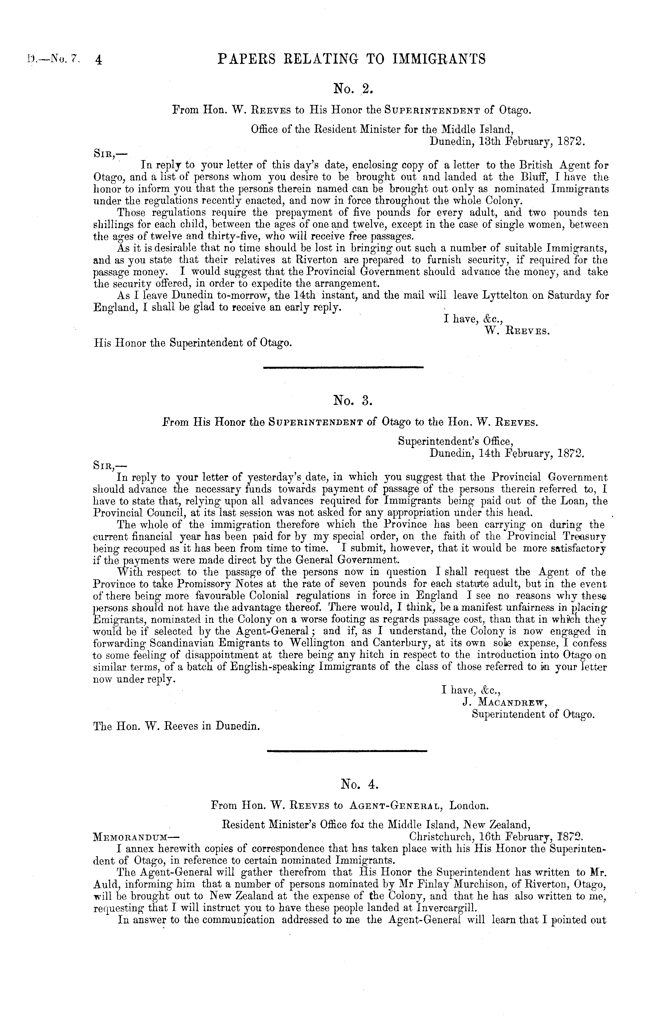 No. 2. From Hon. W. Reeves to His Honor the Superintendent of Otago. Office of the Resident Minister for the Middle Island, Dunedin, 13th February, 1872. Sir, — In reply to your letter of this day's date, enclosing copy of a letter to the British Agent for Otago, and a list of persons whom you desire to be brought out and landed at the Bluff, I have the honor to inform you that the persons therein named can be brought out only as nominated Immigrants under the regulations recently enacted, and now in force throughout the whole Colony. Those regulations require the prepayment of five pounds for every adult, and two pounds ten shillings for each child, between the ages of one and twelve, except in the case of single women, between the ages of twelve and thirty-five, who will receive free passages. As it is desirable that no time should be lost in bringing out such a number of suitable Immigrants, and as you state that their relatives at Riverton are prepared to furnish security, if required for the passage money. I would suggest that the Provincial Government should advance the money, and take the security offered, in order to expedite the arrangement. As I leave Dunedin to-morrow, the 14th instant, and the mail will leave Lyttelton on Saturday for England, I shall be glad to receive an early reply. I have, &c, W. Reeves. His Honor the Superintendent of Otago.