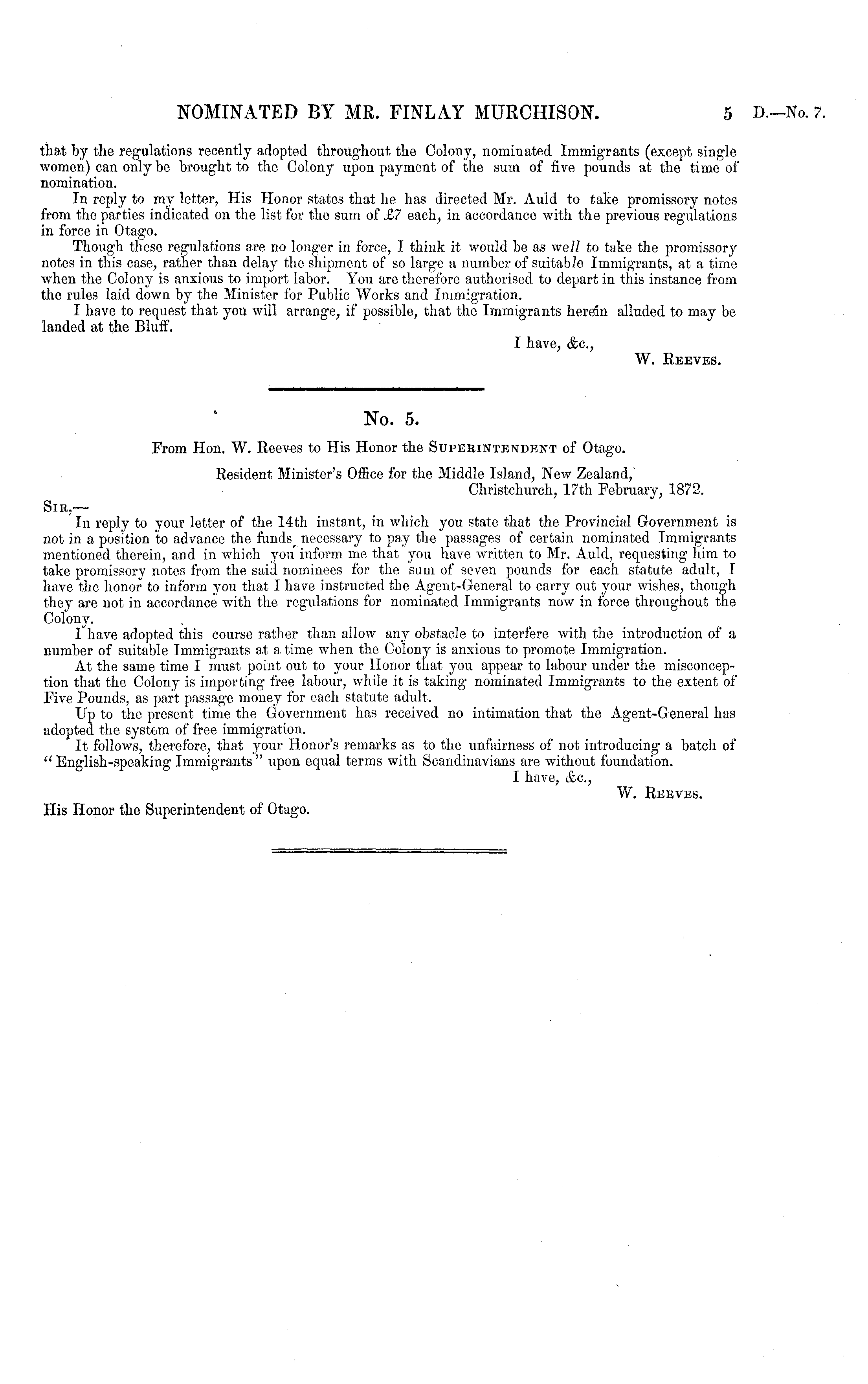 No. 5. From Hon. W. Reeves to His Honor the Superintendent of Otago. Resident Minister's Office for the Middle Island, New Zealand,' Christchurch, 17th February, 1872. Sir, — In reply to your letter of the 14th instant, in which you state that the Provincial Government is not in a position to advance the funds necessary to pay the passages of certain nominated Immigrants mentioned therein, and in which you' inform me that you have written to Mr. Auld, requesting him to take promissory notes from the said nominees for the sum of seven pounds for each statute adult, I have the honor to inform you that I have instructed the Agent-General to carry out your wishes, though they are not in accordance with the regulations for nominated Immigrants now in force throughout the Colony. I have adopted this course rather than allow any obstacle to interfere with the introduction of a number of suitable Immigrants at a time when the Colony is anxious to promote Immigration. At the same time I must point out to your Honor that you appear to labour under the misconception that the Colony is importing free labour, while it is taking nominated Immigrants to the extent of Five Pounds, as part passage money for each statute adult. Up to the present time the Government has received no intimation that the Agent-General has adopted the system of free immigration. It follows, therefore, that your Honor's remarks as to the unfairness of not introducing a batch of " English-speaking Immigrants upon equal terms with Scandinavians are without foundation. I have, &c, W. Reeves. His Honor the Superintendent of Otago.