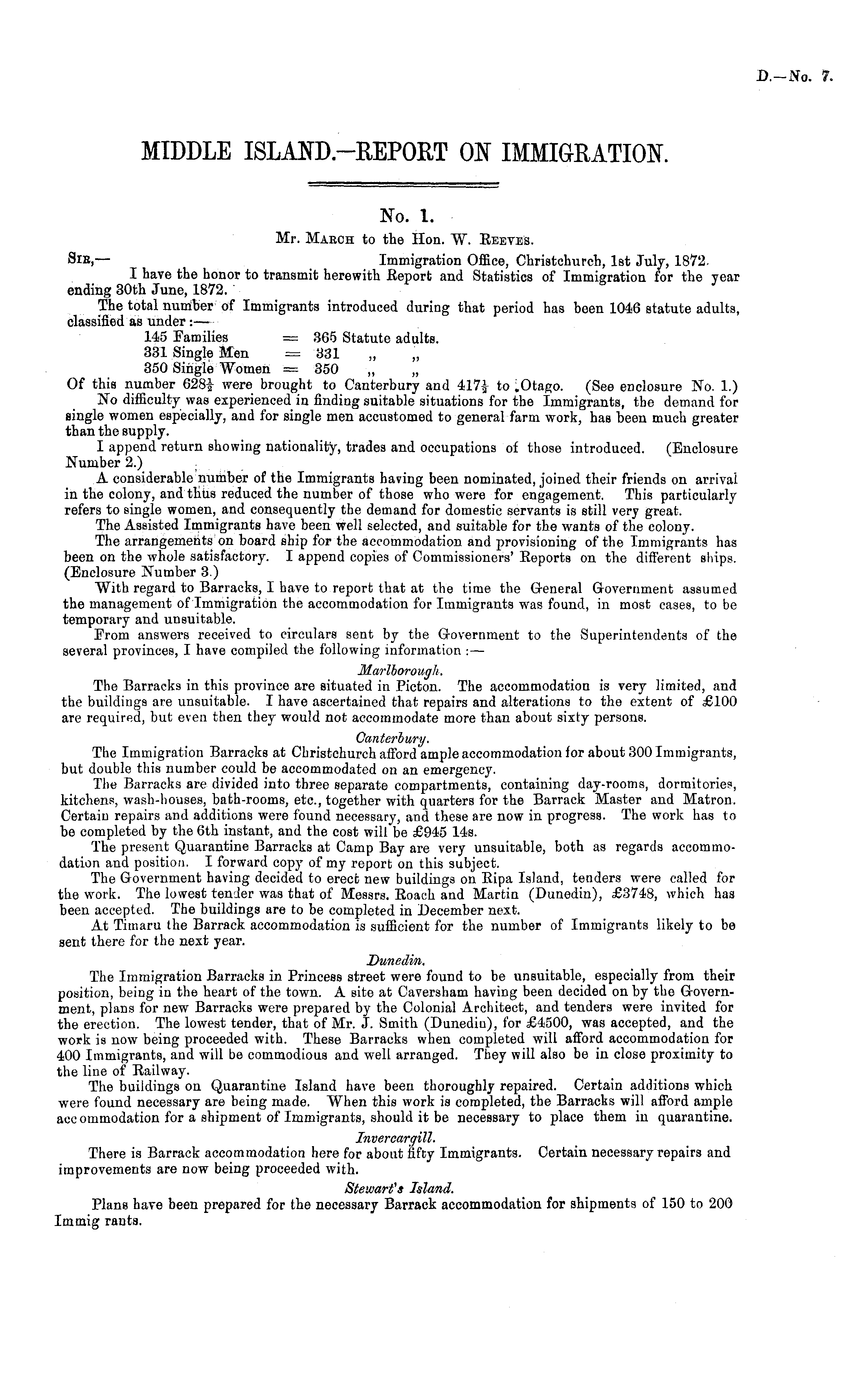 No. 1. Mr. Maech to the Hon. W. Eeeves. Sic, — Immigration Office, Christchurch, Ist July, 1872. I have the honor to transmit herewith Report and Statistics of Immigration for the year ending 30th June, 1872. The total number of Immigrants introduced during that period has been 1046 statute adults, classified as under:— 145 Families — 365 Statute adults. 331 Single Men = 331 „ 350 Single Women = 350 „ „ Of this number 628f- were brought to Canterbury and _17£ to .Otago. (See enclosure No. 1.) No difficulty was experienced in finding suitable situations for the Immigrants, the demand for single women especially, and for single men accustomed to general farm work, has been much greater than the Bupply. I append return showing nationality, trades and occupations of those introduced. (Enclosure Number 2.) A considerable number of the Immigrants having been nominated, joined their friends on arrival in the colony, and thus reduced the number of those who were for engagement. This particularly refers to single women, and consequently the demand for domestic servants is still very great. The Assisted Immigrants have been well selected, and suitable for the wants of the colony. The arrangements on board ship for the accommodation and provisioning of the Immigrants has been on the whole satisfactory. I append copies of Commissioners' Reports on the different ships. (Enclosure Number 3.) With regard to Barracks, I have to report that at the time the General Government assumed the management of Immigration the accommodation for Immigrants was found, in most cases, to be temporary and unsuitable. From answers received to circulars sent by the Government to the Superintendents of the several provinces, I have compiled the following information : — Marlborough. The Barracks in this province are situated in Picton. The accommodation is very limited, and the buildings are unsuitable. I have ascertained that repairs and alterations to the extent of £100 are required, but even then they would not accommodate more than about sixty persons. Canterbury. The Immigration Barracks at Christchurch afford ample accommodation for about 300 Immigrants, but double this number could be accommodated on an emergency. The Barracks are divided into three separate compartments, containing day-rooms, dormitories, kitchens, wash-houses, bath-rooms, etc., together with quarters for the Barrack Master and Matron. Certain repairs and additions were found necessary, and these are now in progress. The work has to be completed by the 6th instant, and the cost will be £945 14s. The present Quarantine Barracks at Camp Bay are very unsuitable, both as regards accommodation and position. I forward copy of my report on this subject. The Government having decided to erect new buildings on Eipa Island, tenders were called for the work. The lowest tender was that of Messrs. Roach and Martin (Dunedin), £3748, which has been accepted. The buildings are to be completed in December next. At Timaru the Barrack accommodation is sufficient for the number of Immigrants likely to be sent there for the next year. Dunedin. The Immigration Barracks in Princess street were found to be unsuitable, especially from their position, being in the heart of the town. A site at Caversham having been decided on by the Government, plans for new Barracks were prepared by the Colonial Architect, and tenders were invited for the erection. The lowest tender, that of Mr. J. Smith (Dunedin), for £4500, was accepted, and the work is now being proceeded with. These Barracks when completed will afford accommodation for 400 Immigrants, and will be commodious and well arranged. They will also be in close proximity to the line of Railway. The buildings on Quarantine Island have been thoroughly repaired. Certain additions which were found necessary are being made. When this work is completed, the Barracks will afford ample accommodation for a shipment of Immigrants, should it be necessary to place them in quarantine. Invercargill. There is Barrack accommodation here for about fifty Immigrants. Certain necessary repairs and improvements are now being proceeded with. Stewart's Island. Plans have been prepared for the necessary Barrack accommodation for shipments of 150 to 200 Itnmig rants.