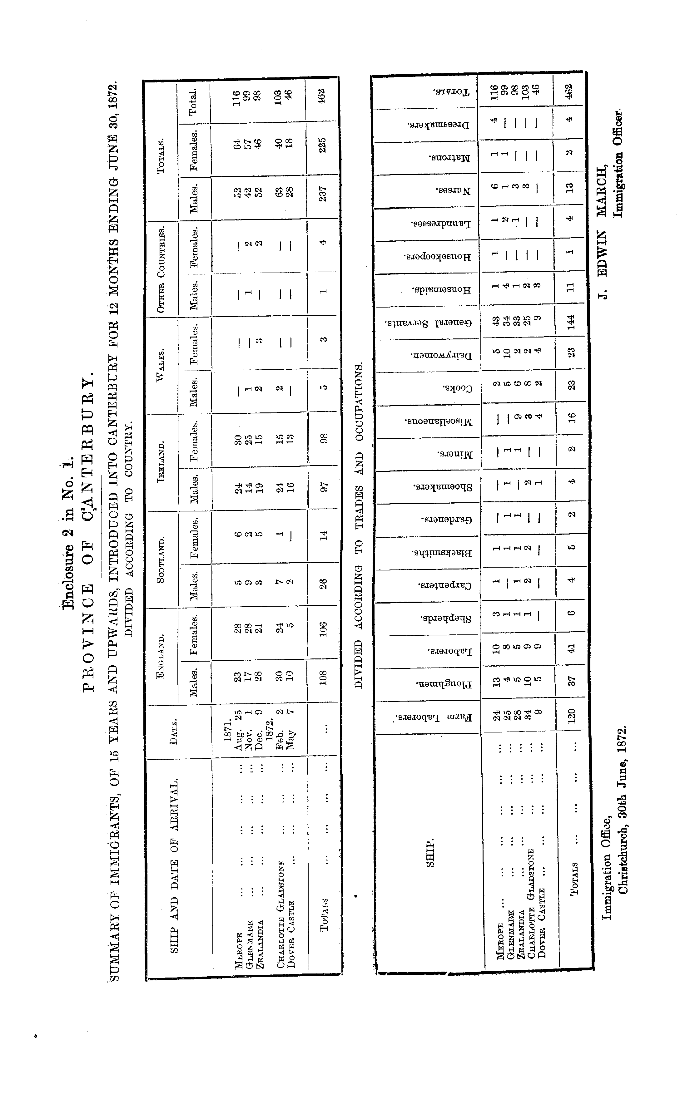 SUMMARY OF IMMIGRANTS, OF 15 TEARS AND UPWARDS, INTRODUCED INTO CANTERBURY FOR 12 MONTHS ENDING JUNE 30,1872. DIVIDED ACCOBD1NG TO COUNTRY. Enoland. Scotland. Ireland. Wales. Other Countries. Totals. SHIP AND DATE OF ARBIVAL. Date. Males. Females. Males. Females. Males. Females. Males. Females. Males. Females. Males. Females. Total. Mebope Glenmakk Zealandia 1871. Aug. 25 Nov. 1 Dec. 9 1872. Feb. 2 May 7 23 28 28 28 21 5 9 3 6 5 24 14 19 25 15 1 2 3 1 2 52 42 52 64 57 46 116 99 98 Charlotte Gladstone Dovek Castle 30 10 24 5 7 1 21 16 15 13 2 63 28 40 18 103 46 1 4 237 225 462 Totals 108 106 26 14 97 98 5